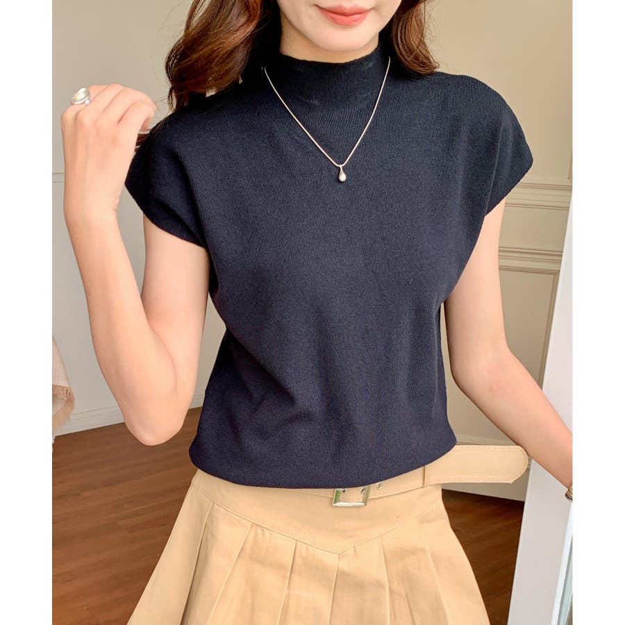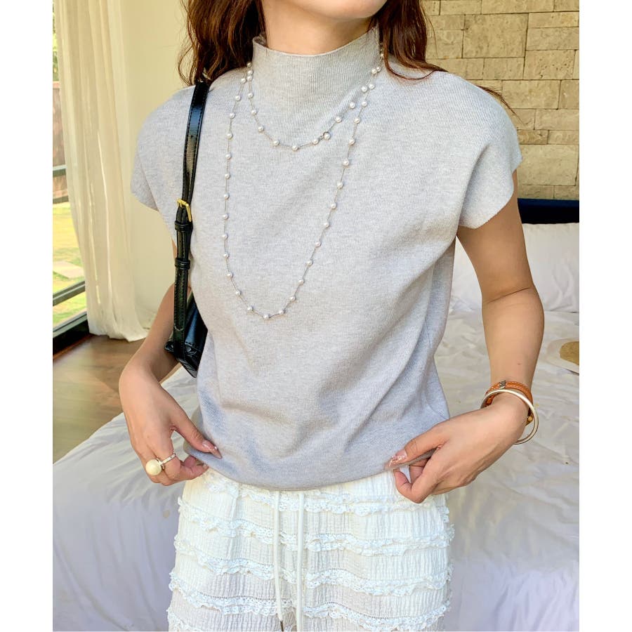 ミニマルなデザインながら、首元のハイネックがきちんと感を演出し、アクセサリー映えも抜群。