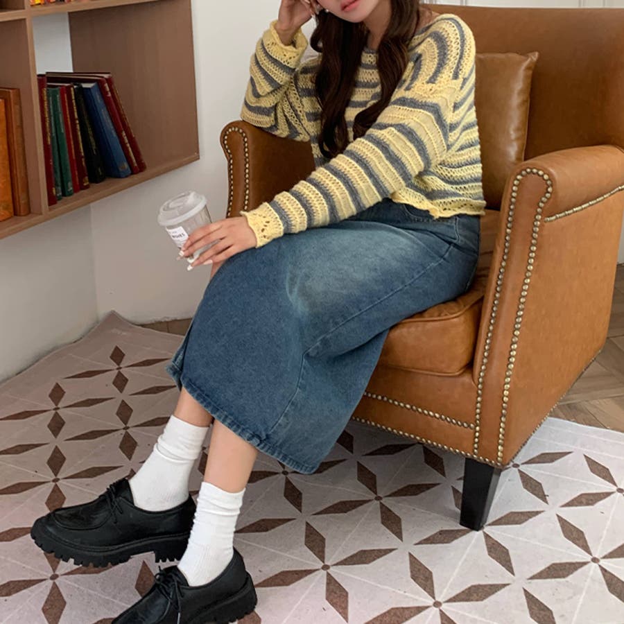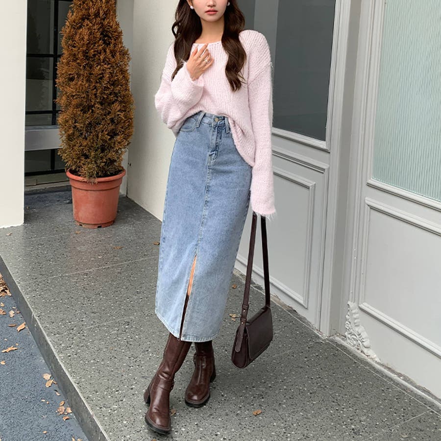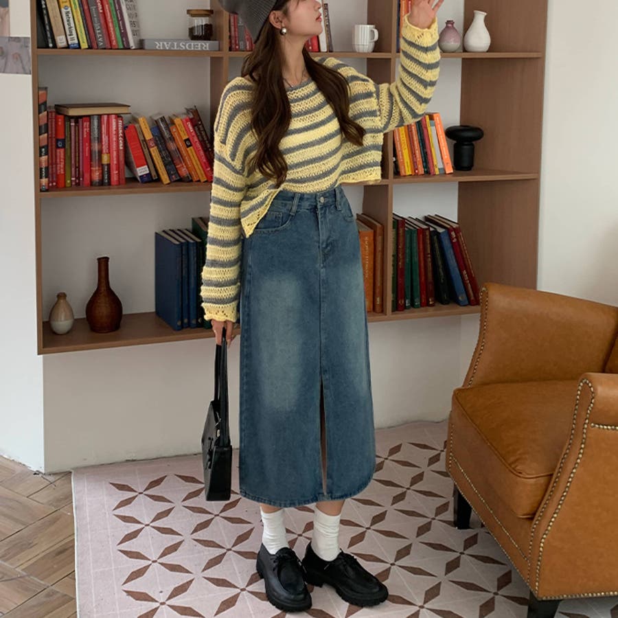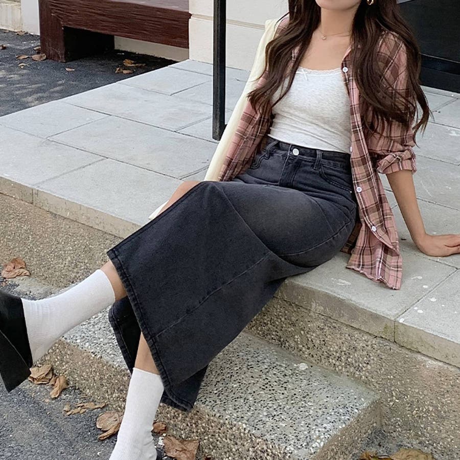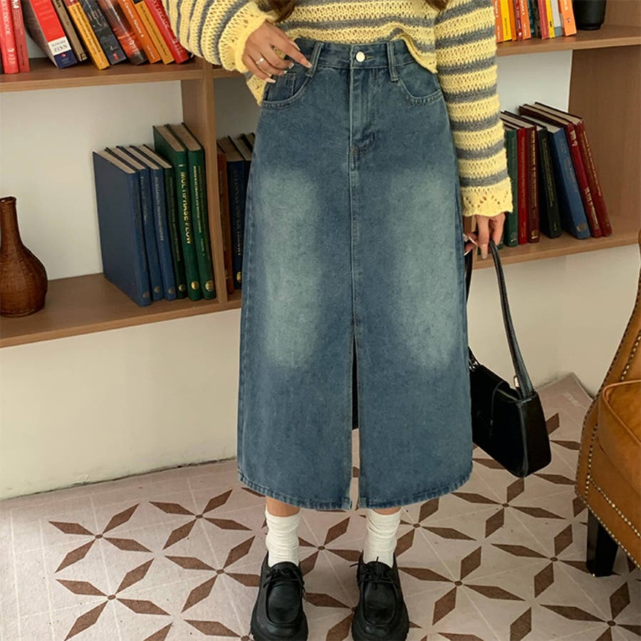美しいIラインシルエットが魅力のロングデニムスカート。