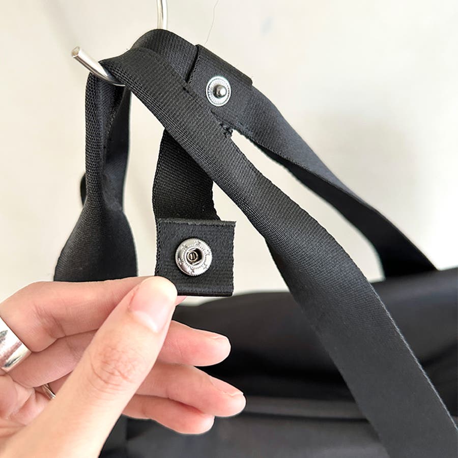 背面にはキャリーバーにぴったりはまるキャリーオンベルトが付いているので、旅行時にキャリーバッグにひっかけてお使いいただけます。
