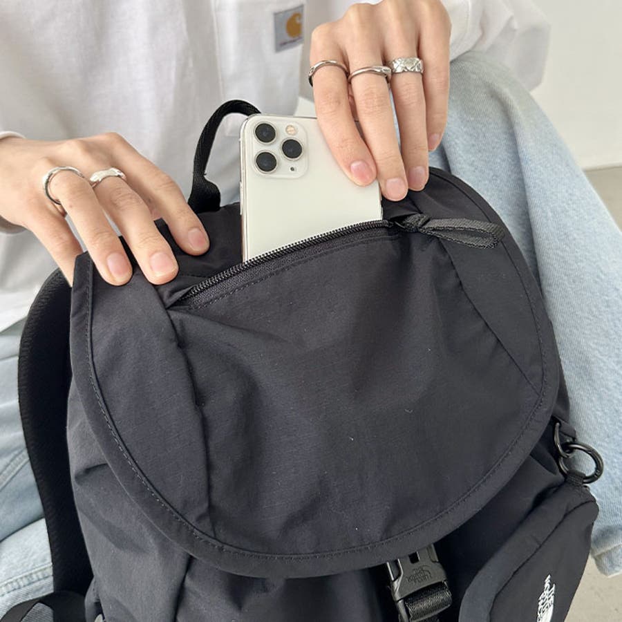 フロントにはファスナーポケットが2つあり、イヤホンやカード等を収納できる取り外し可能なハーフドームポーチも付いています。