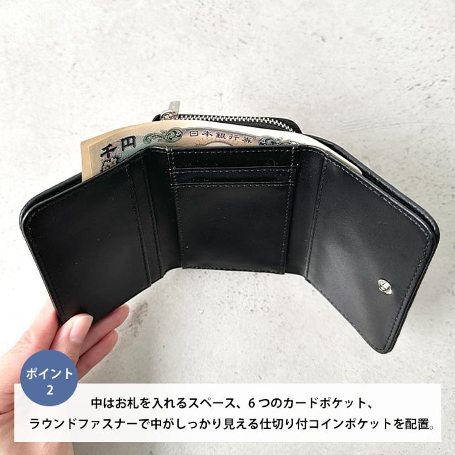 ラウンドファスナーで中がしっかり見える仕切り付コインポケットを配置。