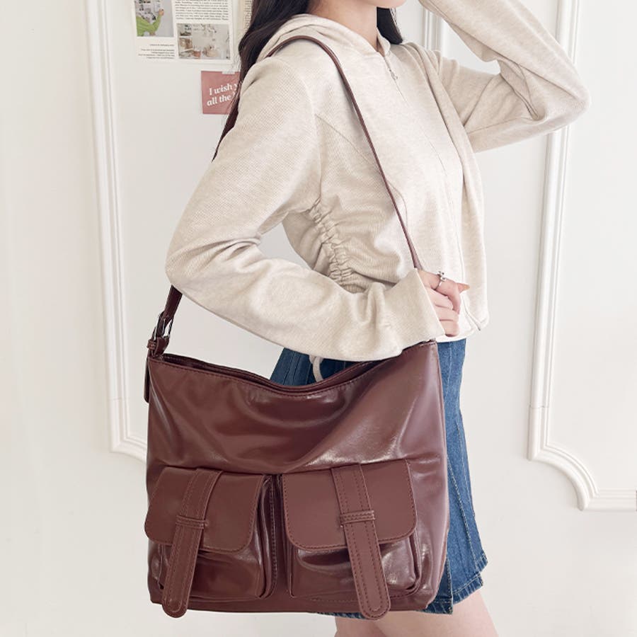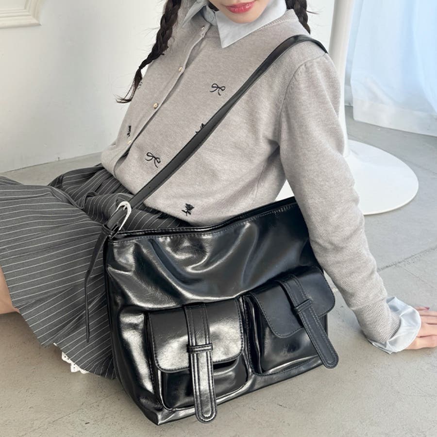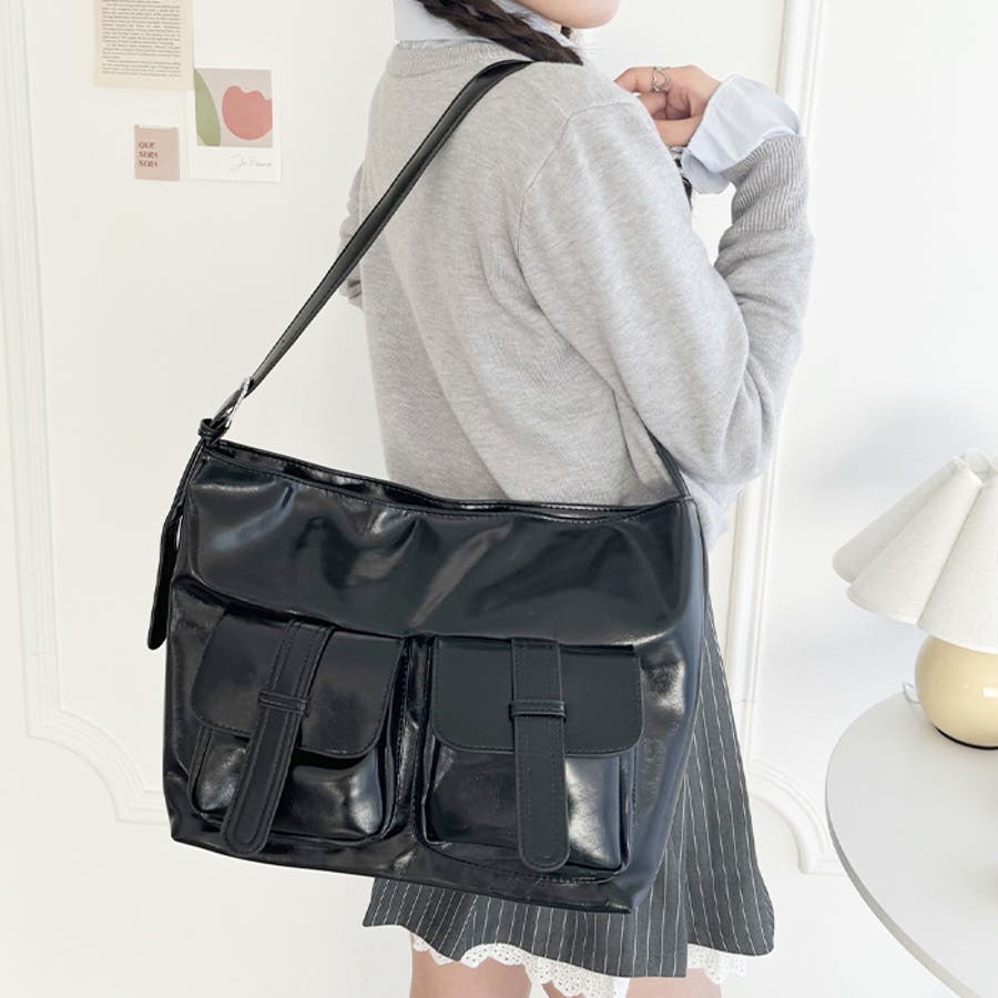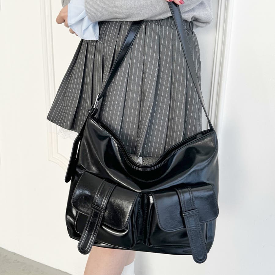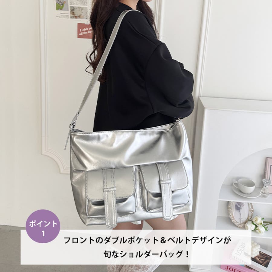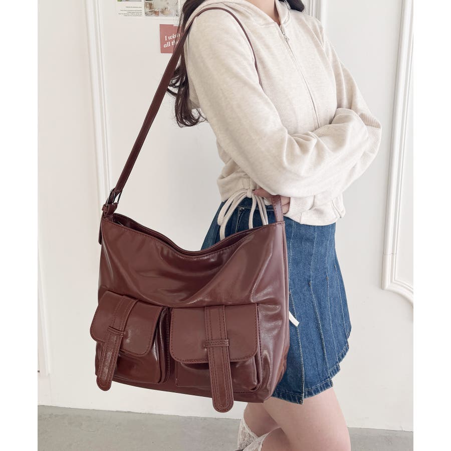・フロントのダブルポケット&ベルトデザインが旬なショルダーバッグ