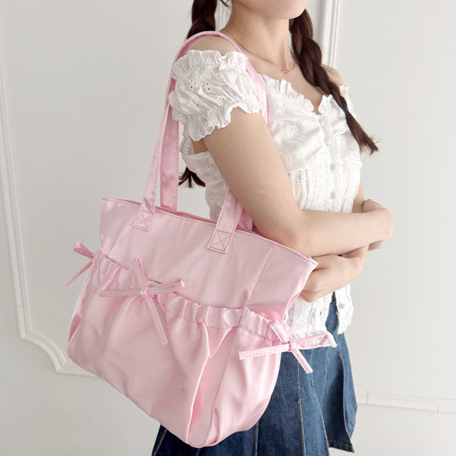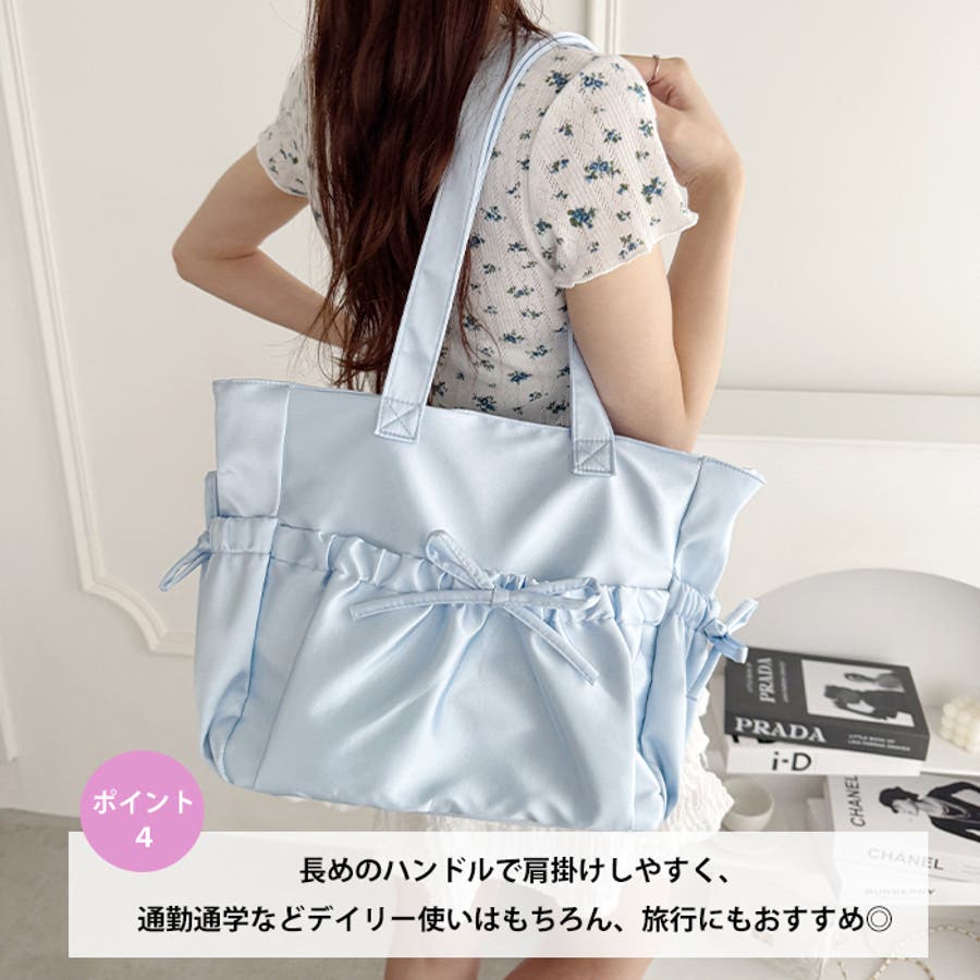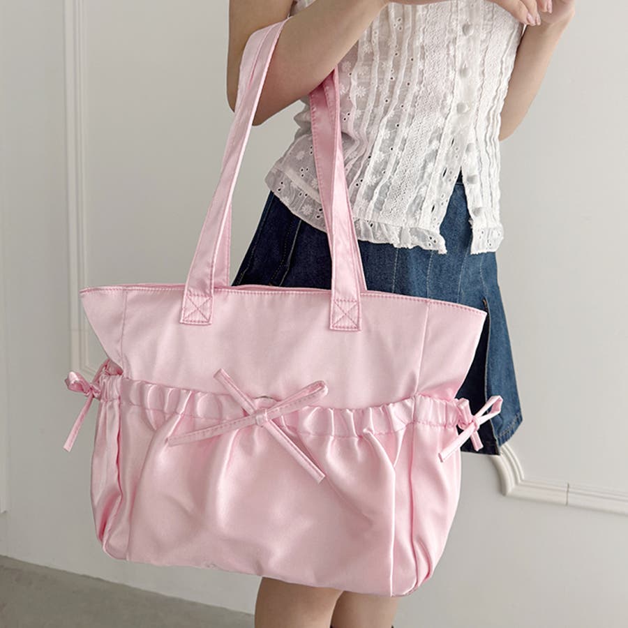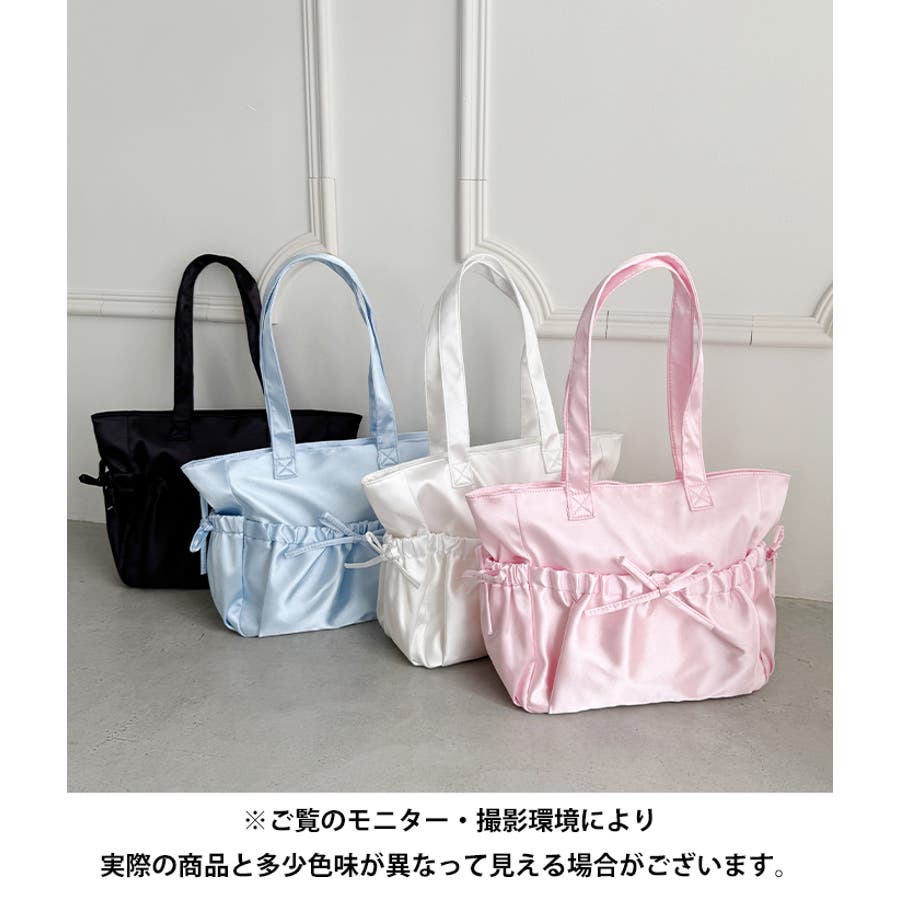 ピンクを買いましたがかなり目立つしめっちゃピンクです!リボンはほどけた状態で来るので結ばないといけないです!!パソコン入るし通学に最適です。