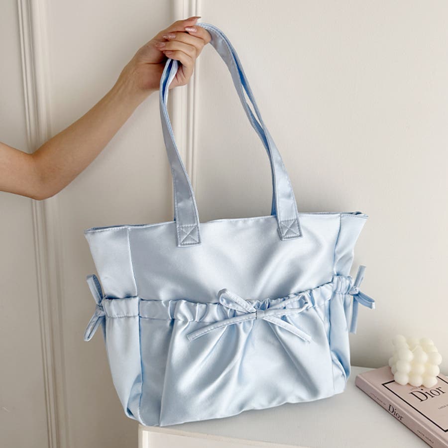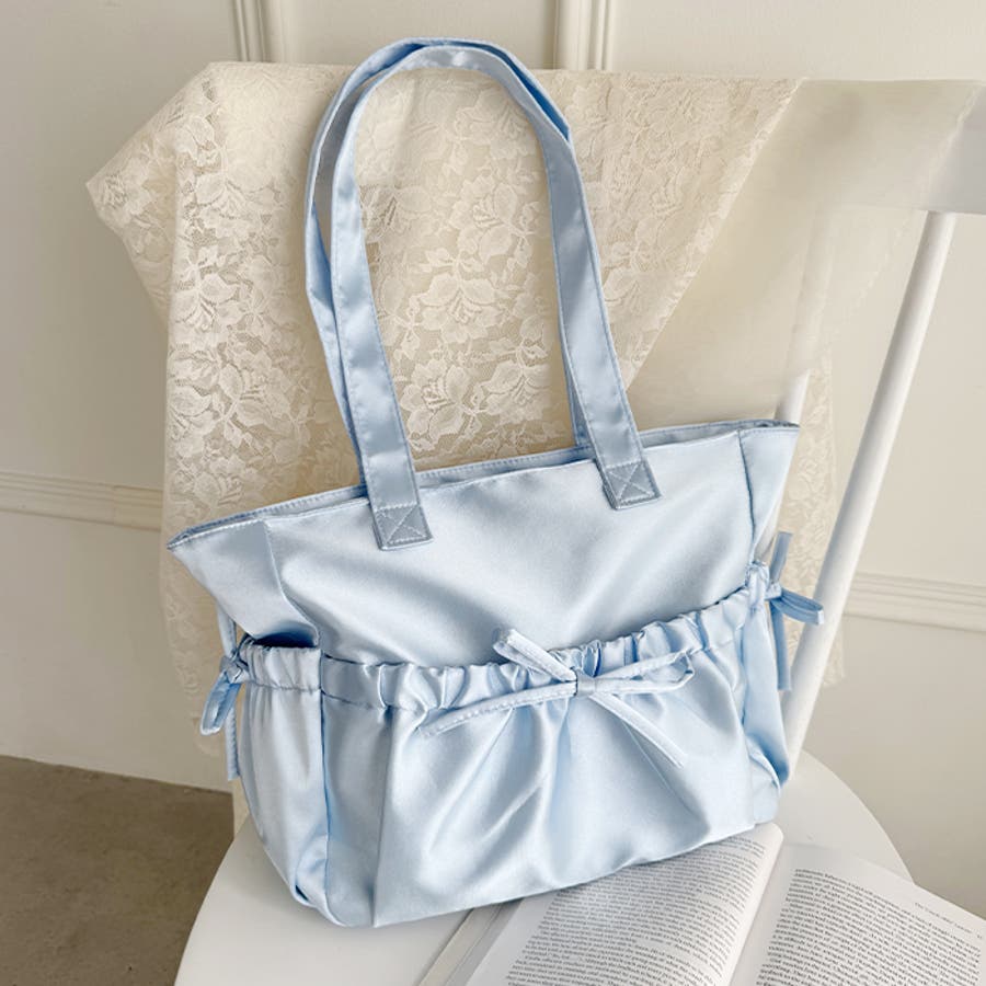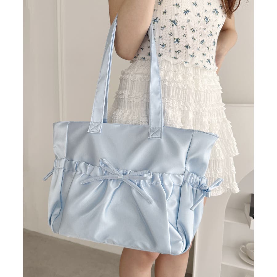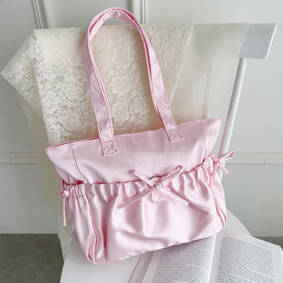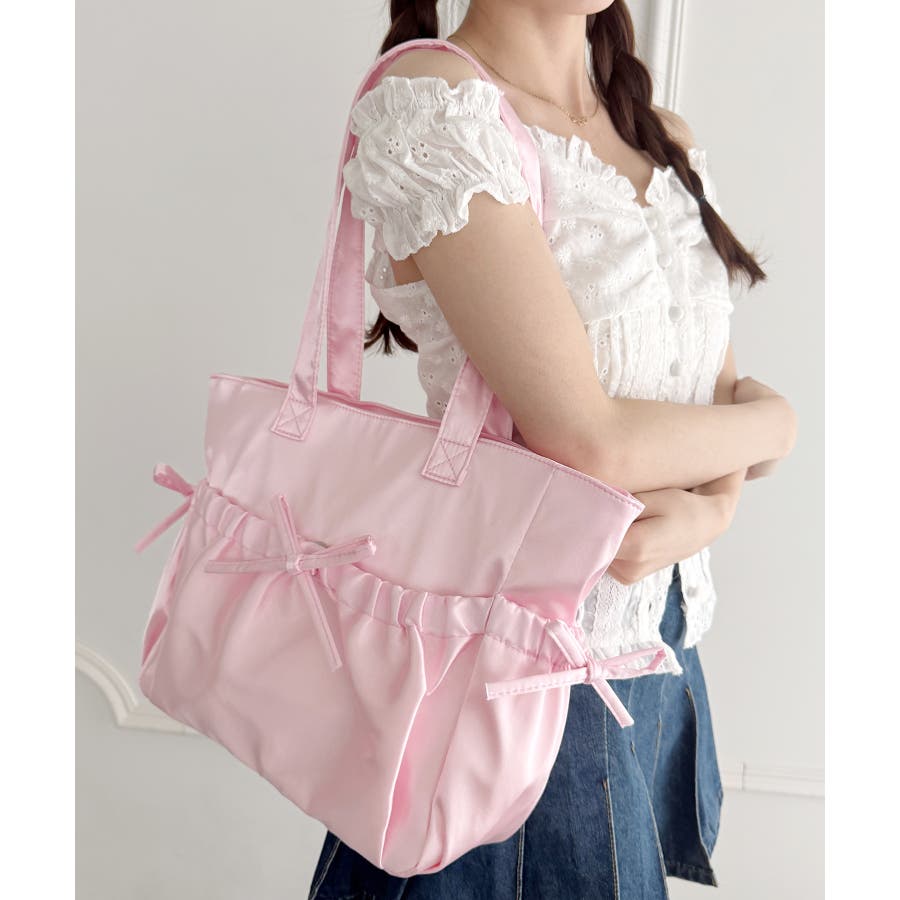 ピンクを買いましたがかなり目立つしめっちゃピンクです!リボンはほどけた状態で来るので結ばないといけないです!!パソコン入るし通学に最適です。