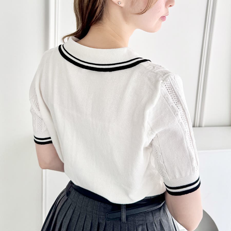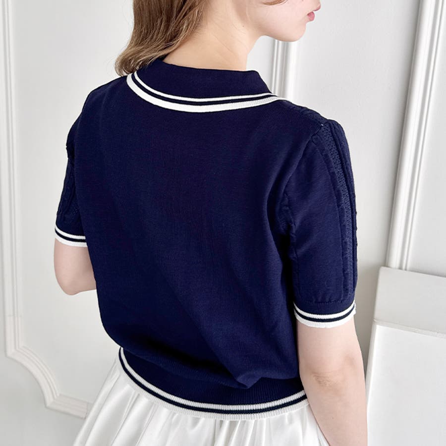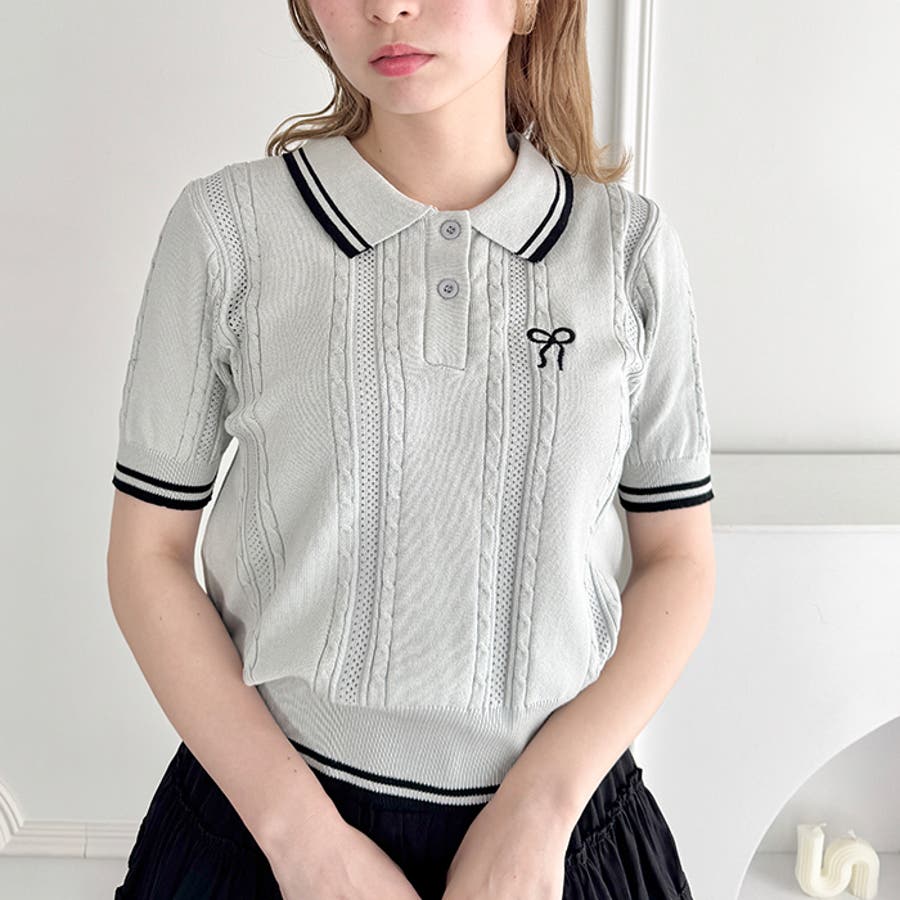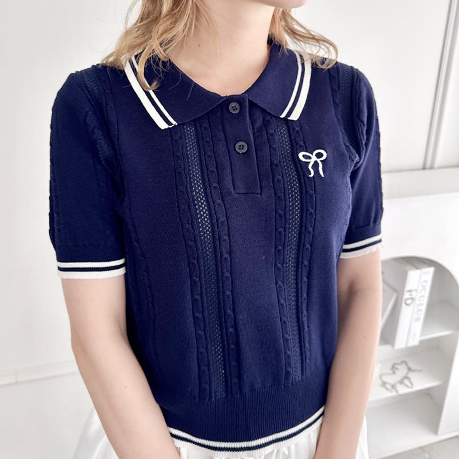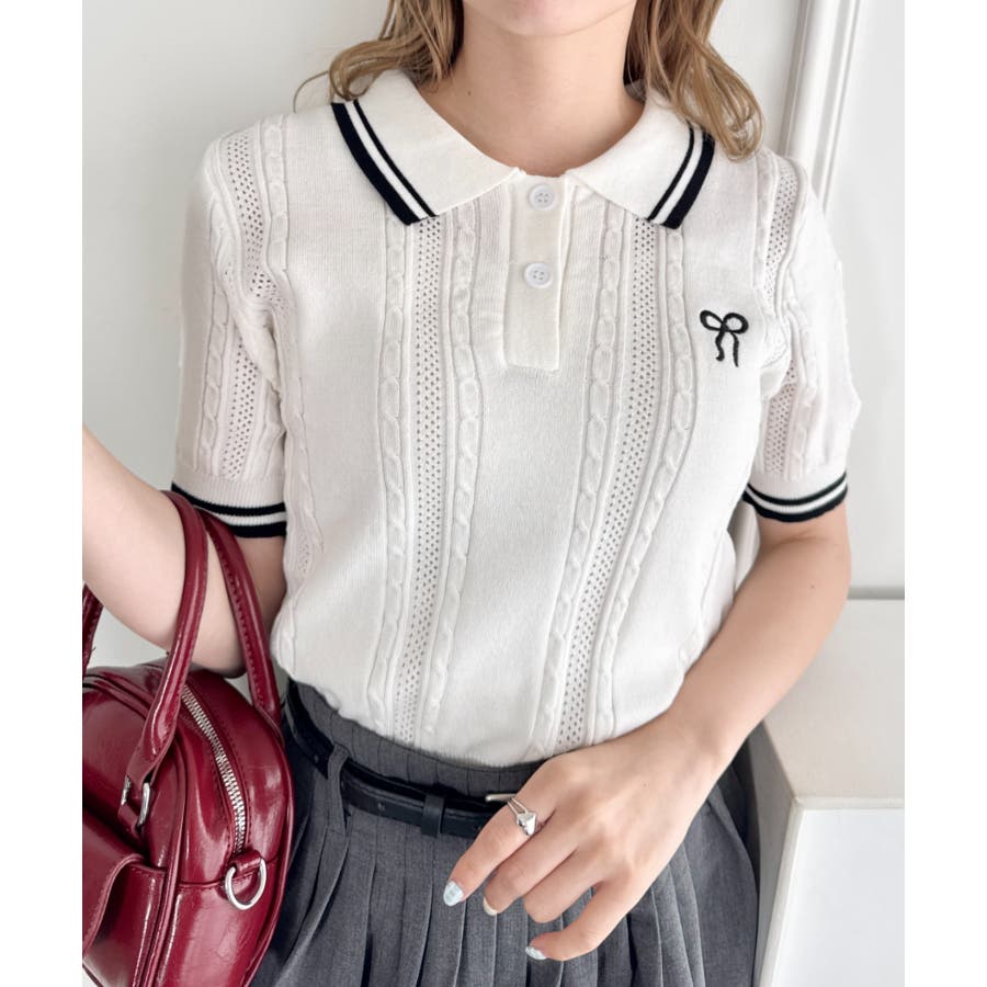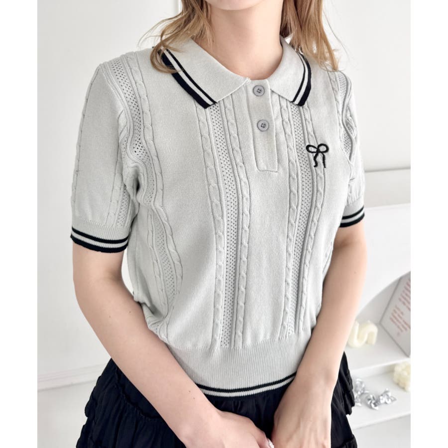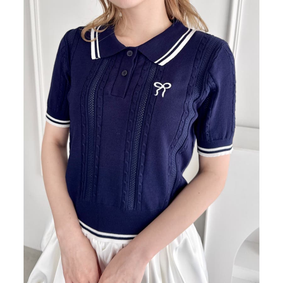 リボン刺繍ケーブルポロニット