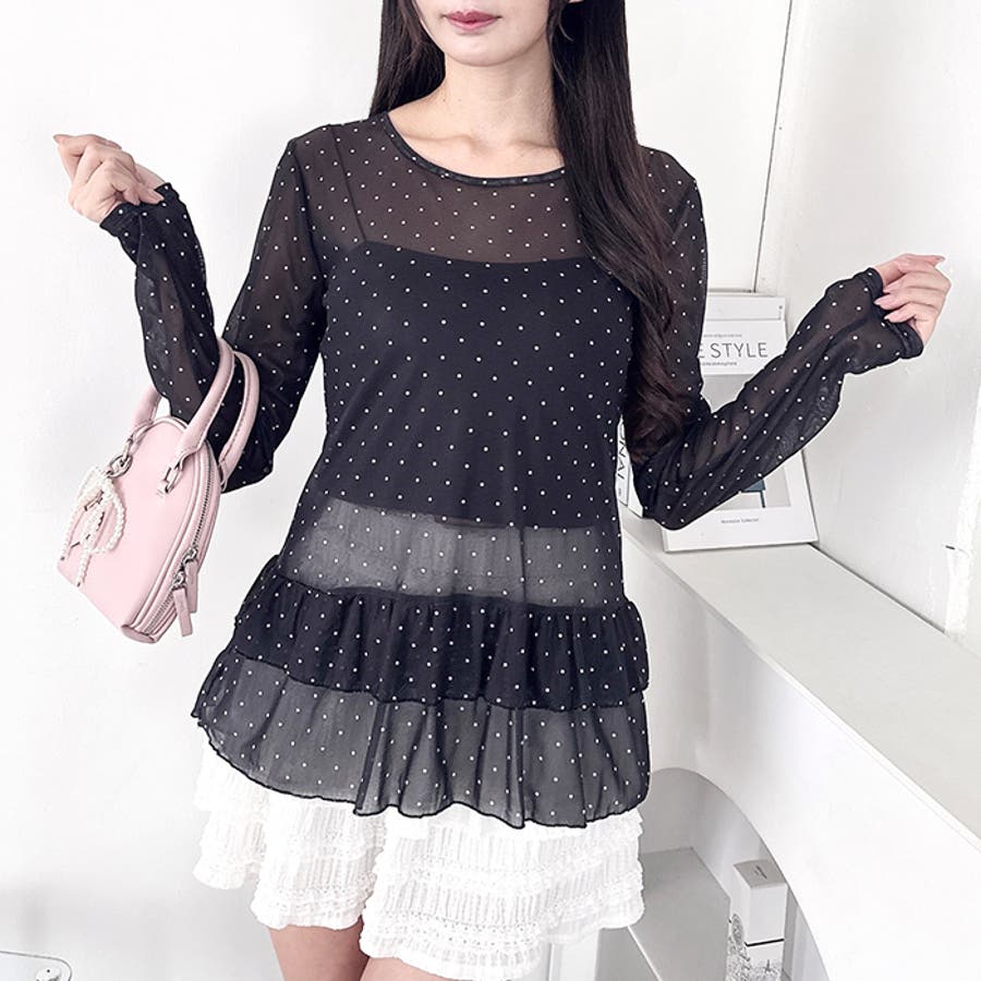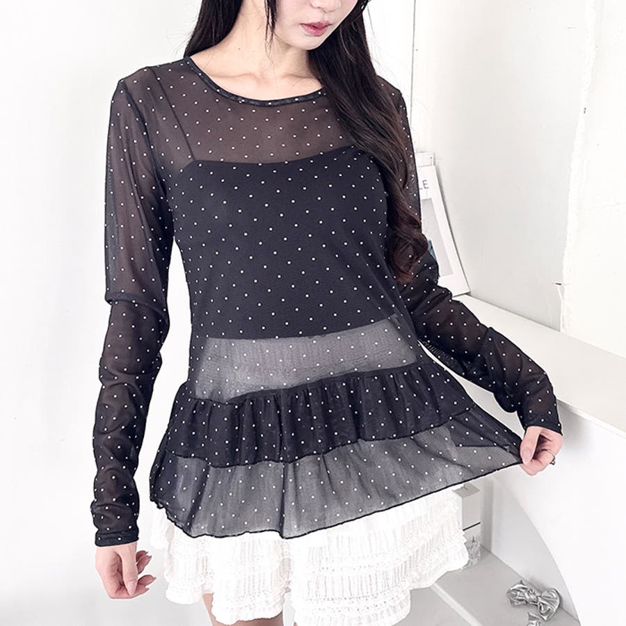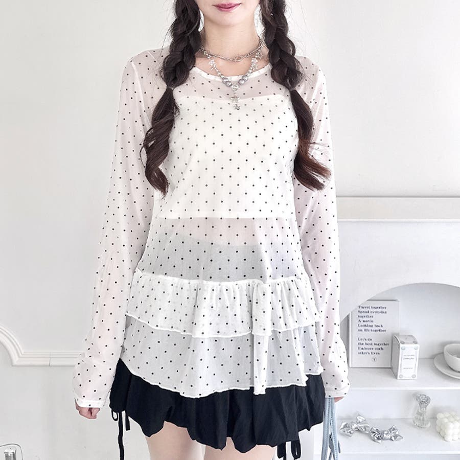 ・旬なドット柄が目を引く、透け感が可愛いシアートップス
