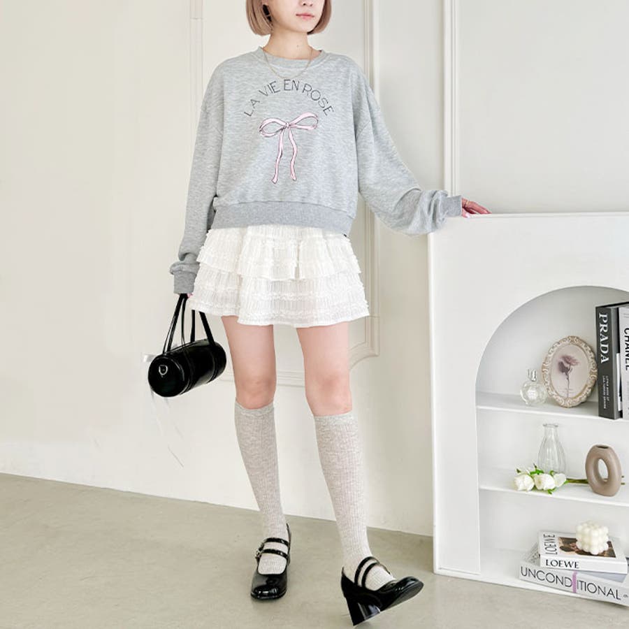 スウェットやパーカーなどカジュアルなアイテムも合わせるだけでドーリーな印象に。