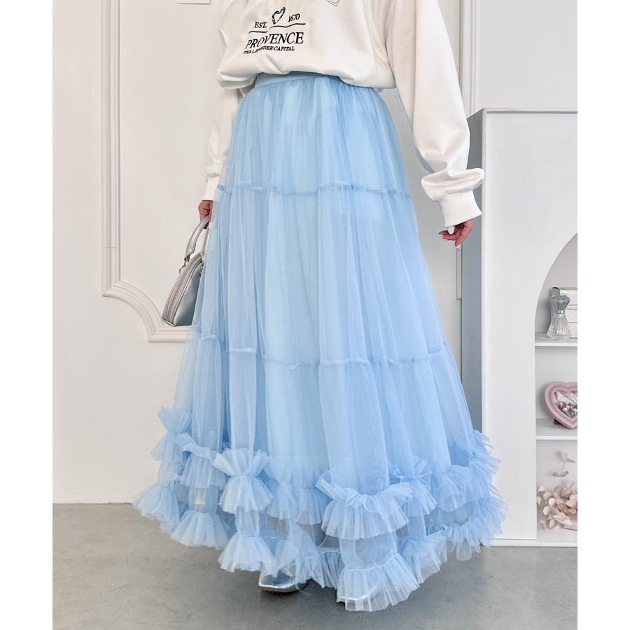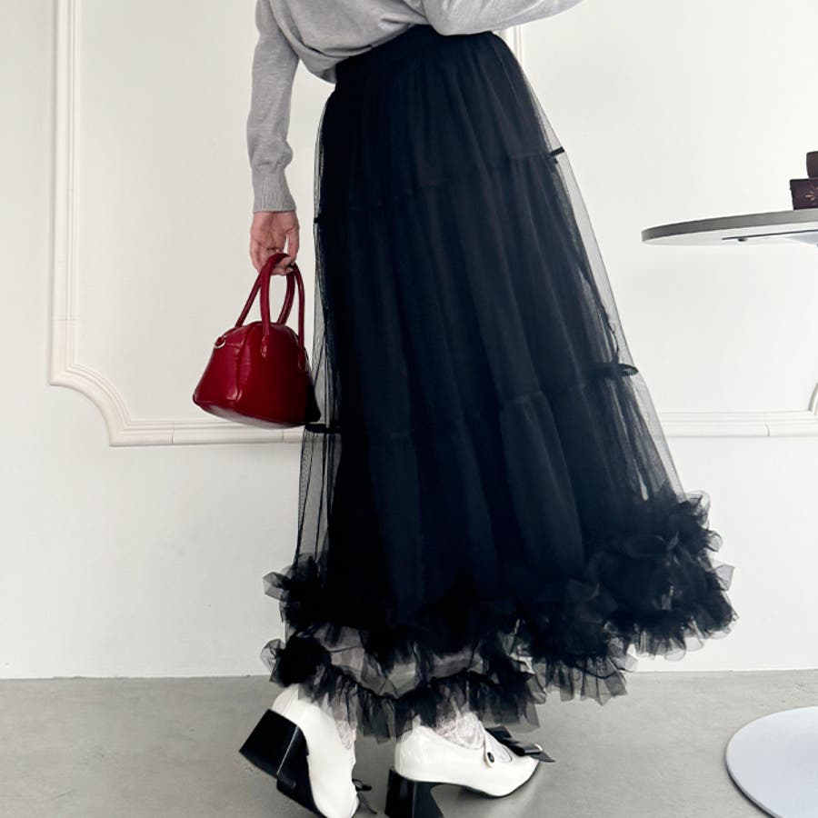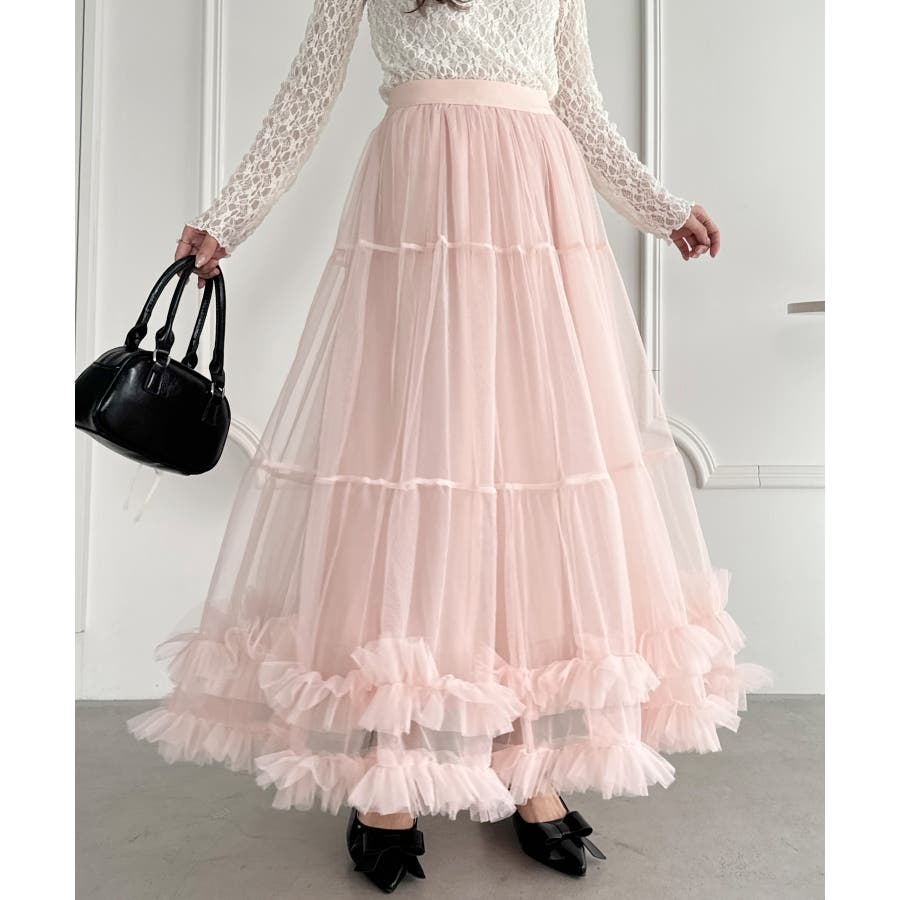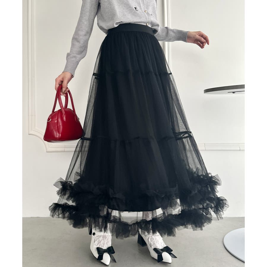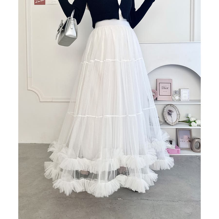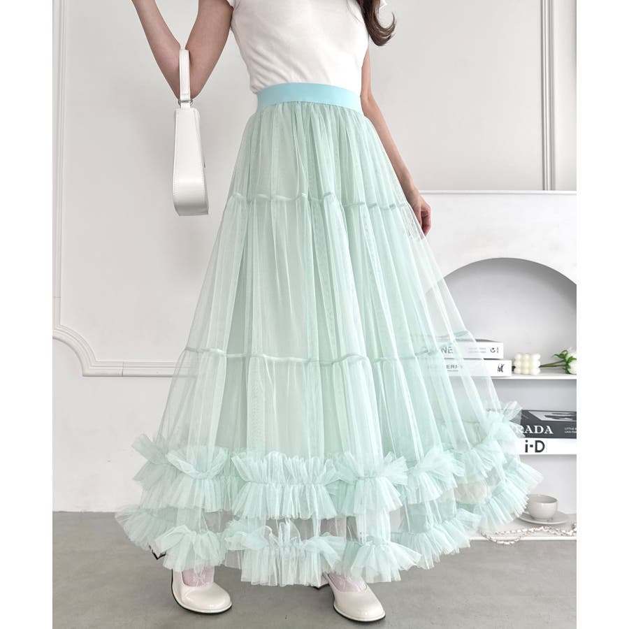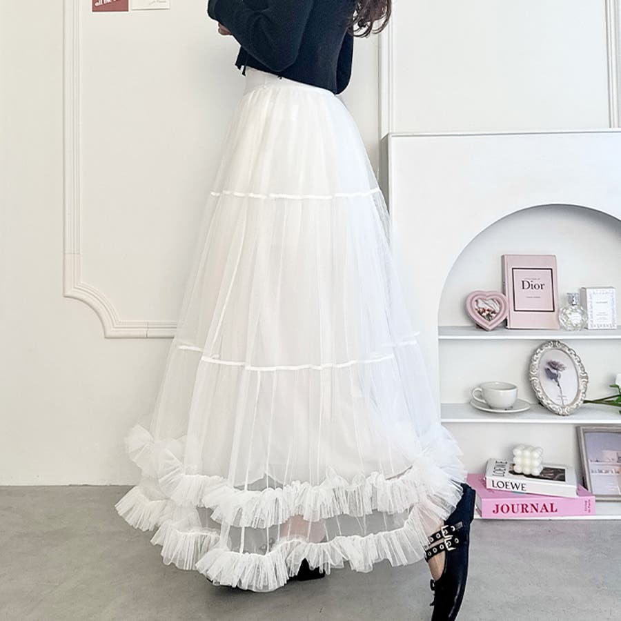 ・たっぷりの生地&裾のボリューミーなフリルがアクセントのチュールロングスカート
