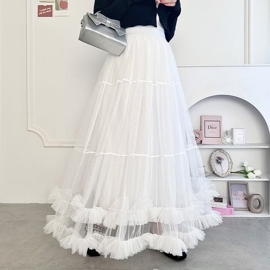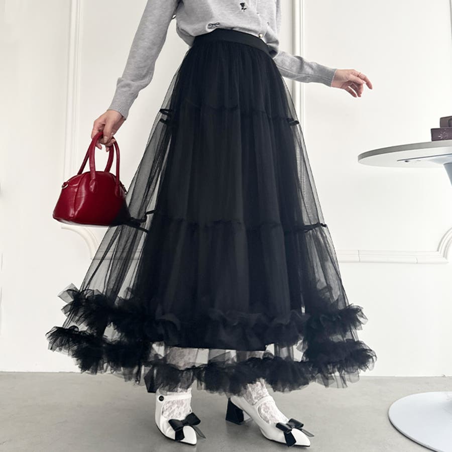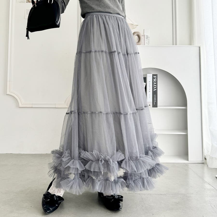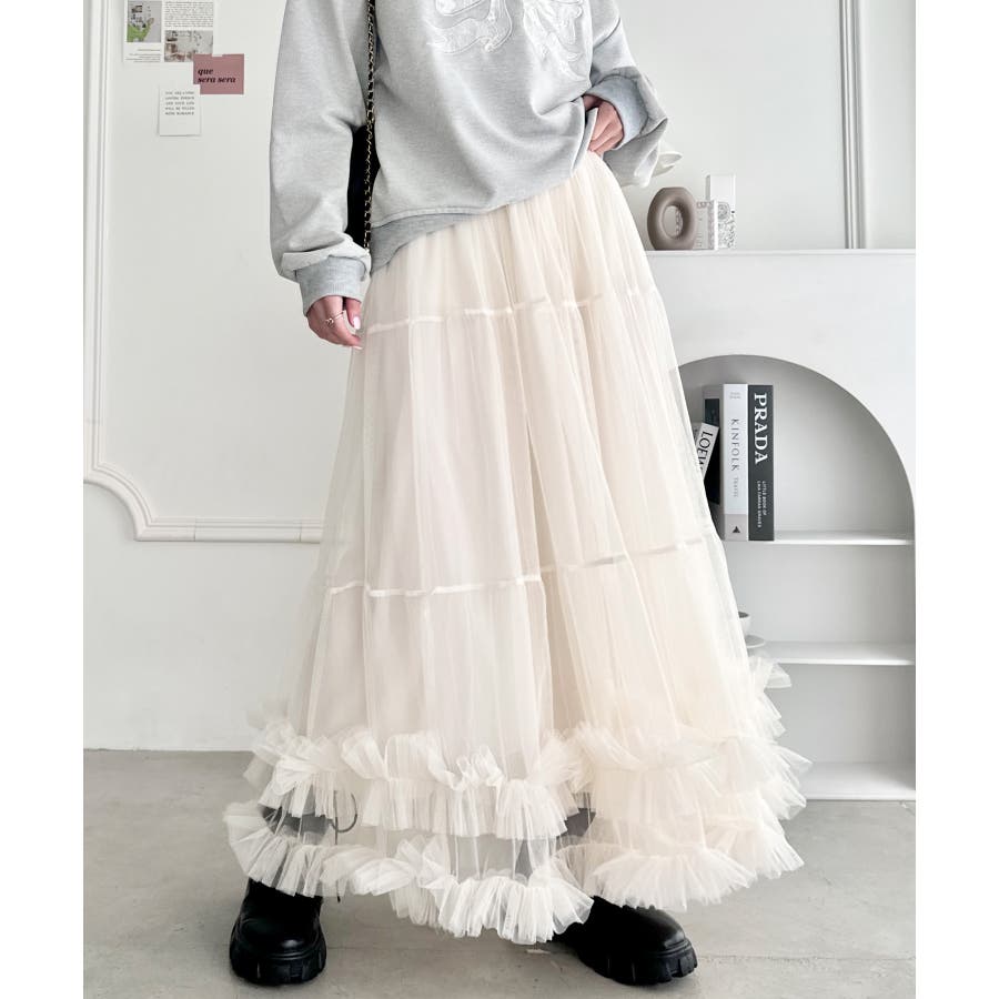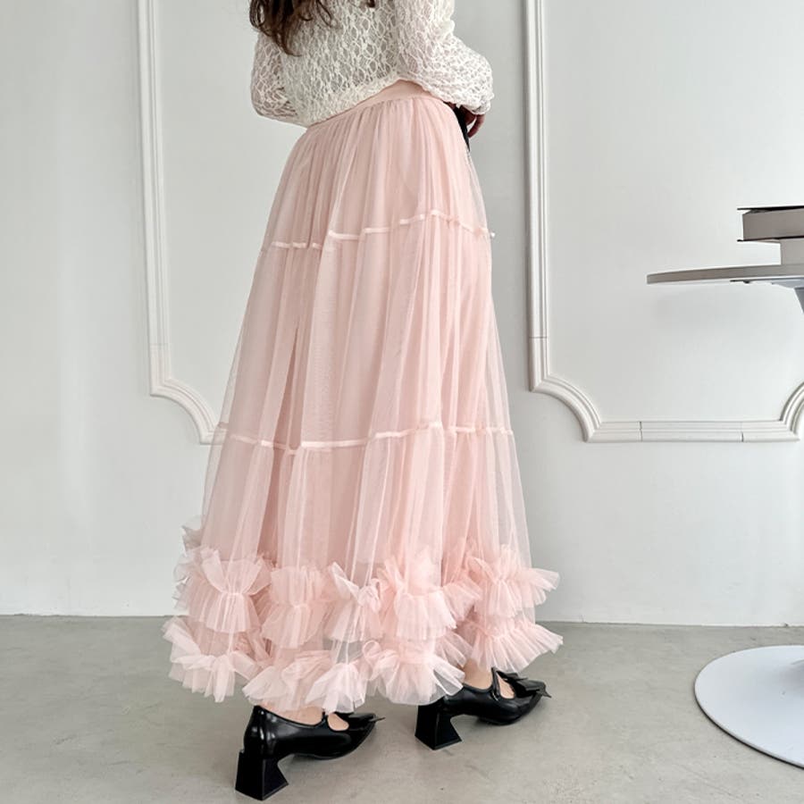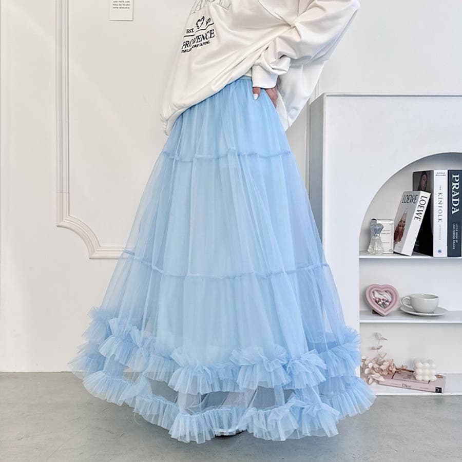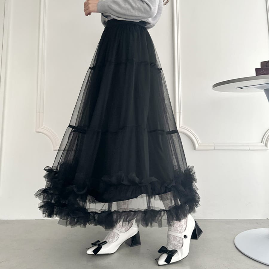 ・たっぷりの生地&裾のボリューミーなフリルがアクセントのチュールロングスカート