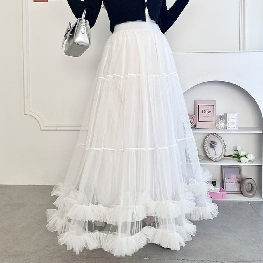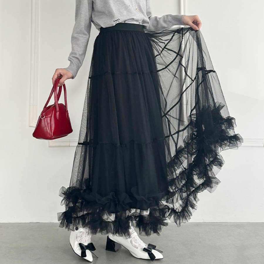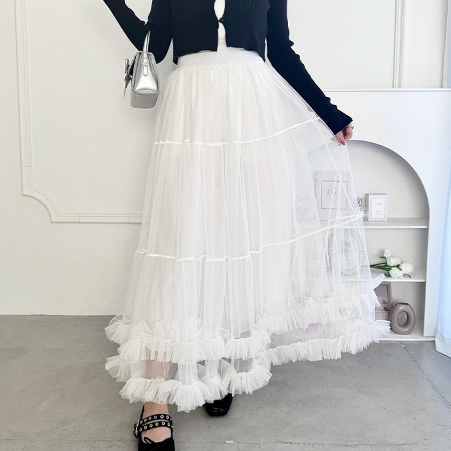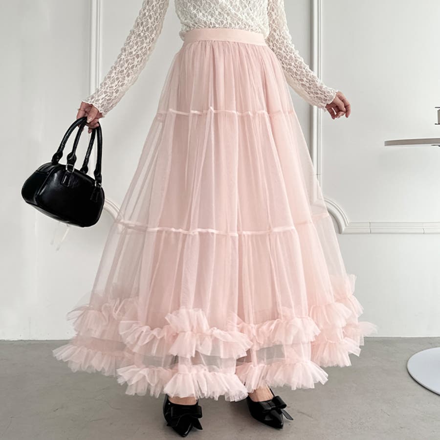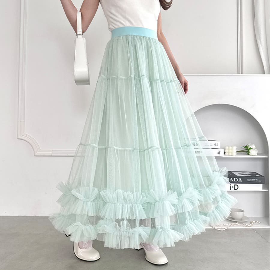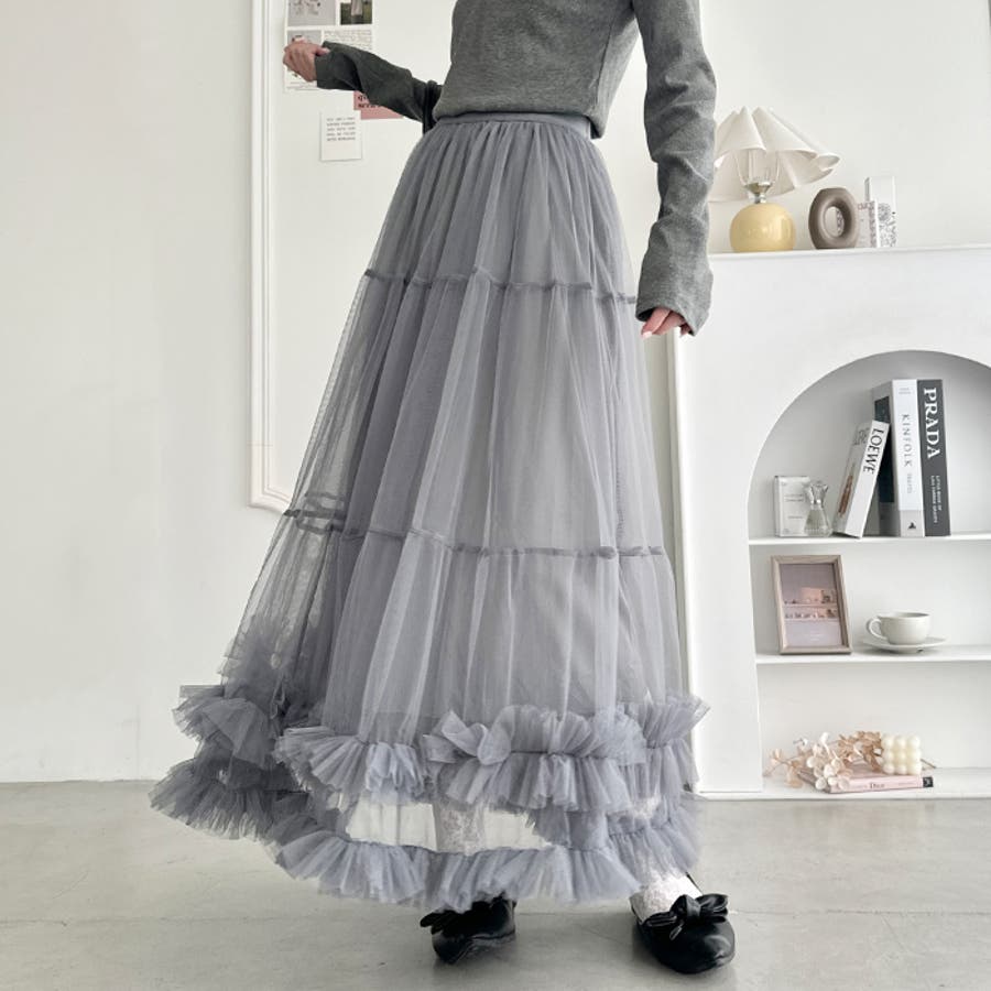 ・たっぷりの生地&裾のボリューミーなフリルがアクセントのチュールロングスカート