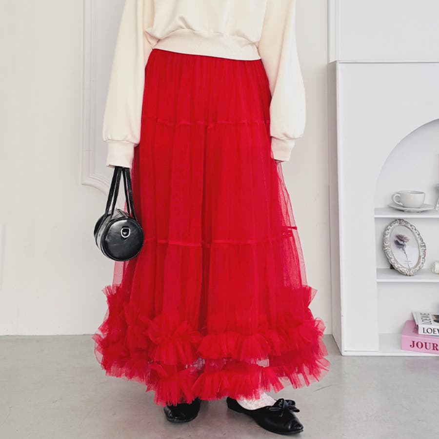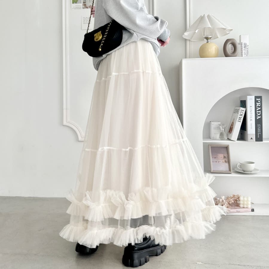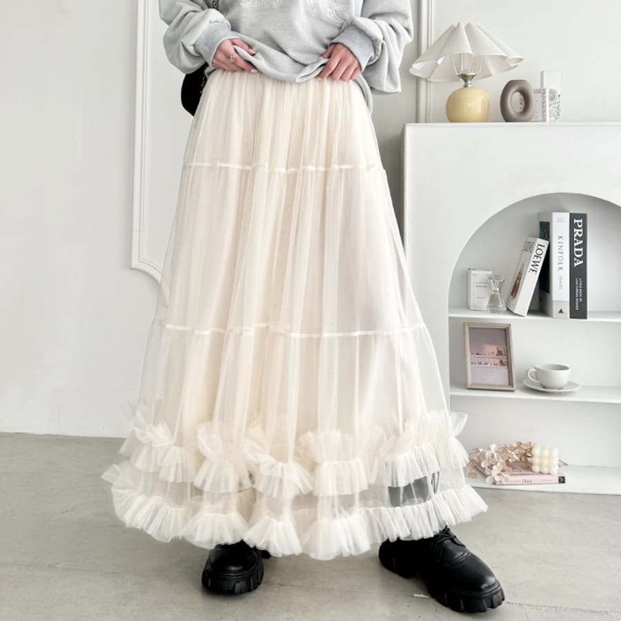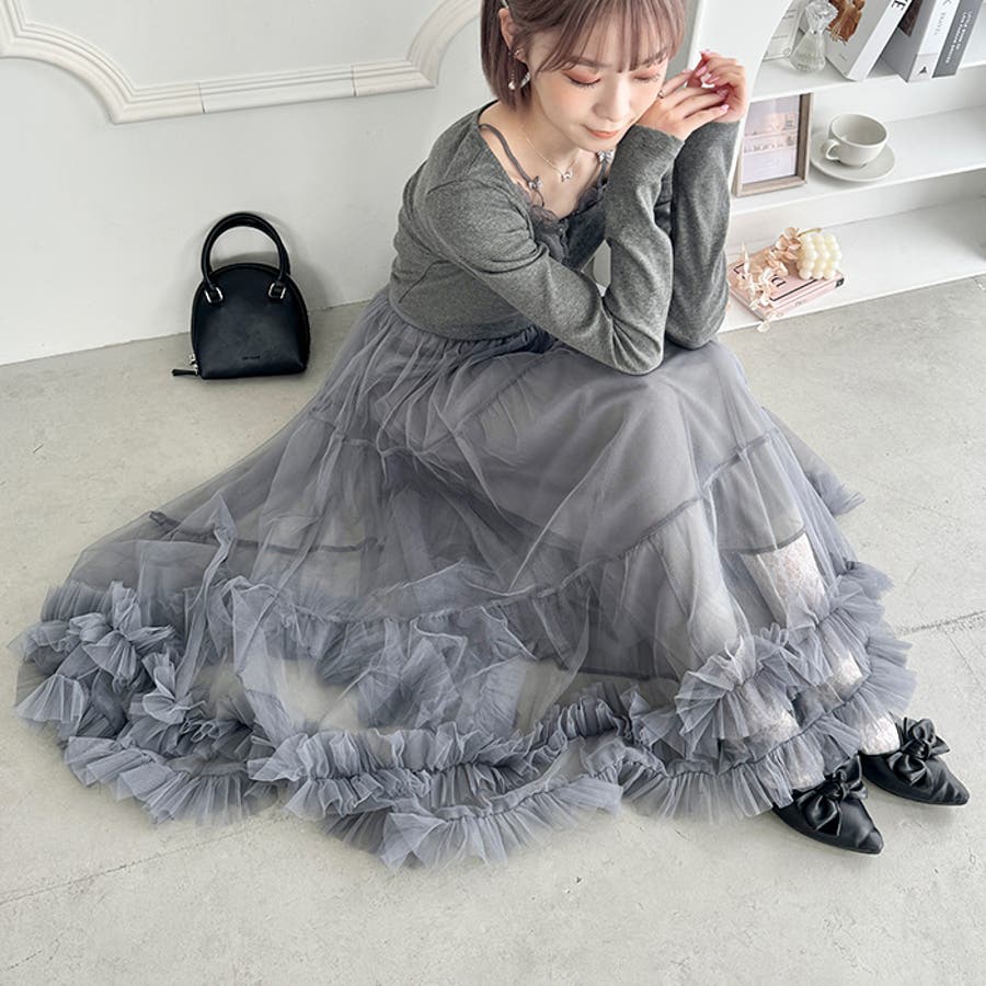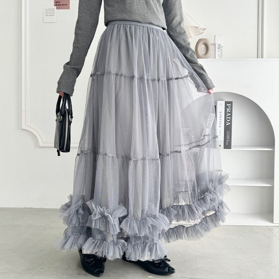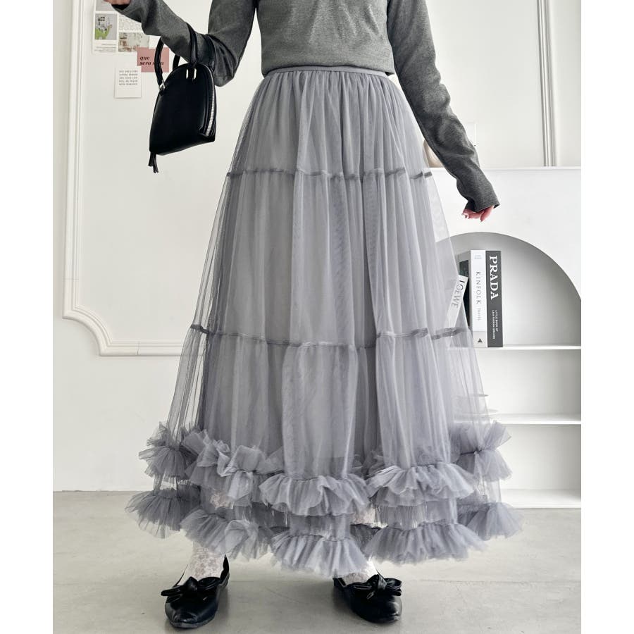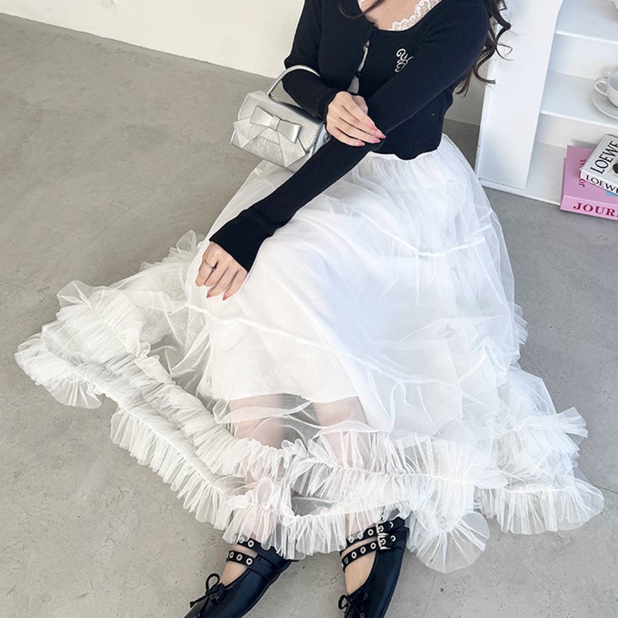 ・たっぷりの生地&裾のボリューミーなフリルがアクセントのチュールロングスカート