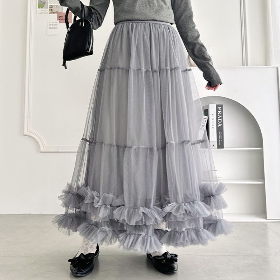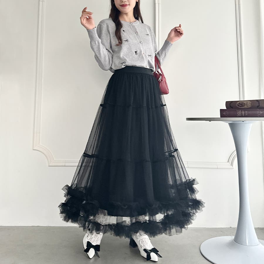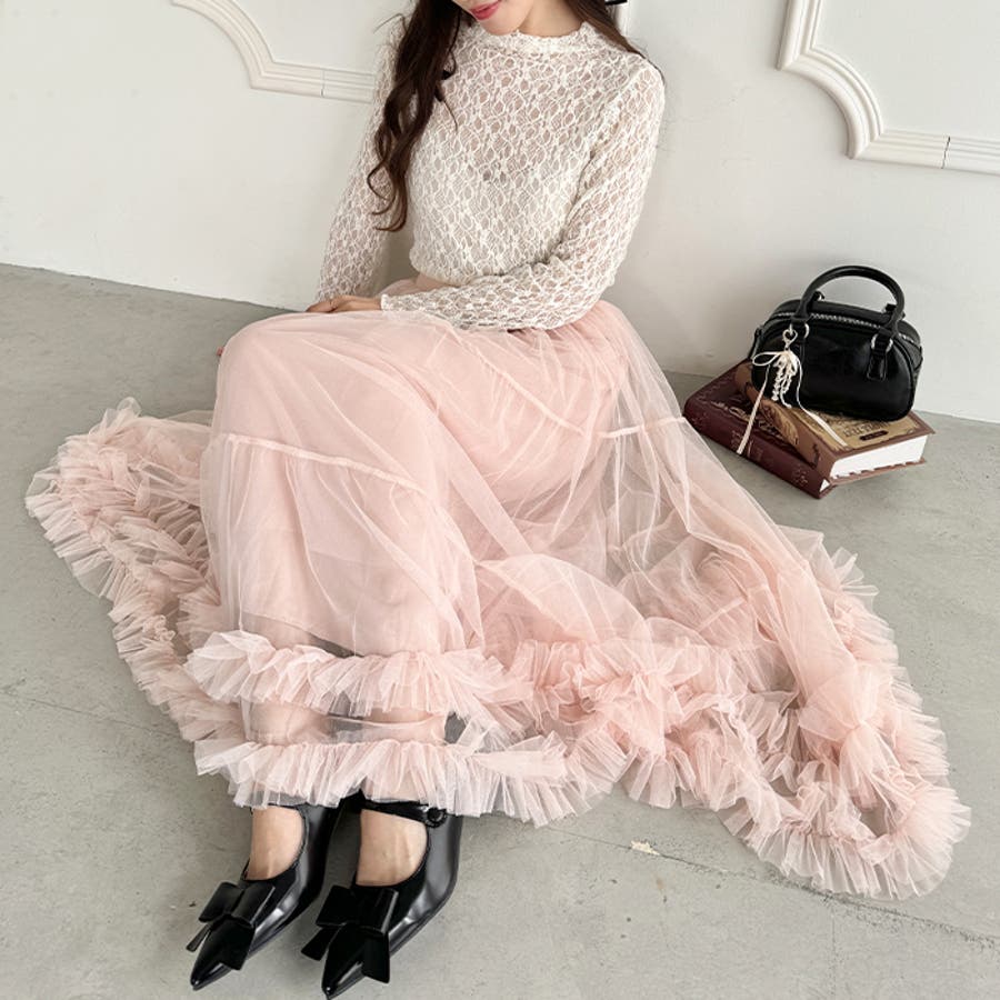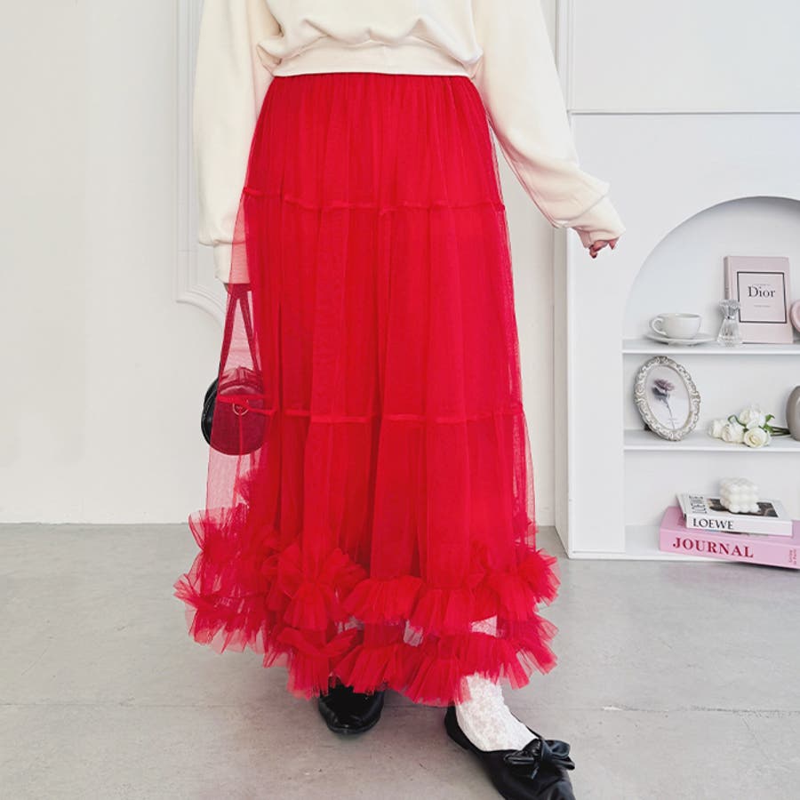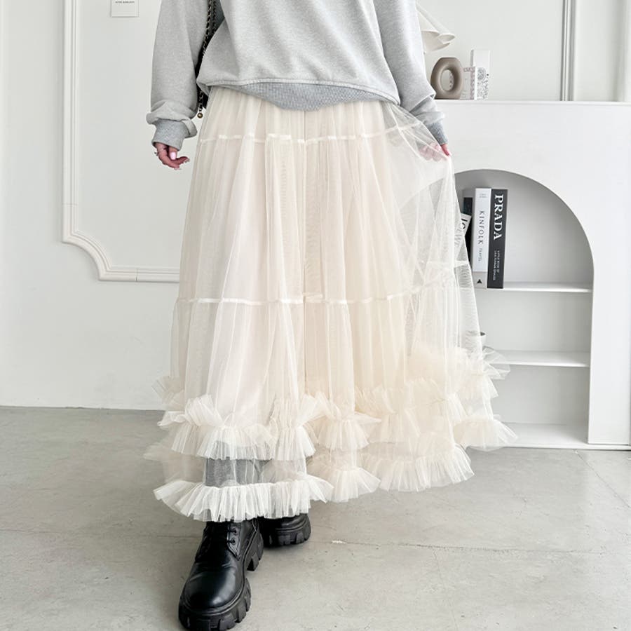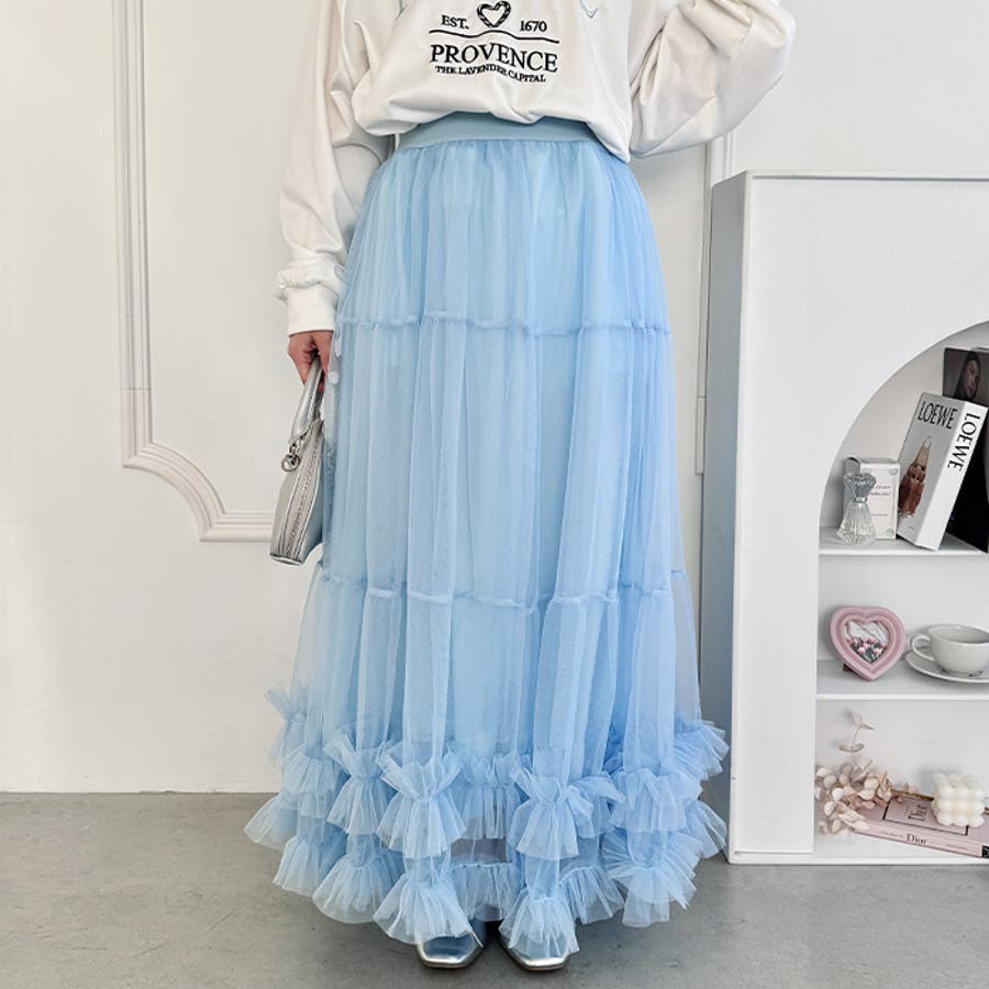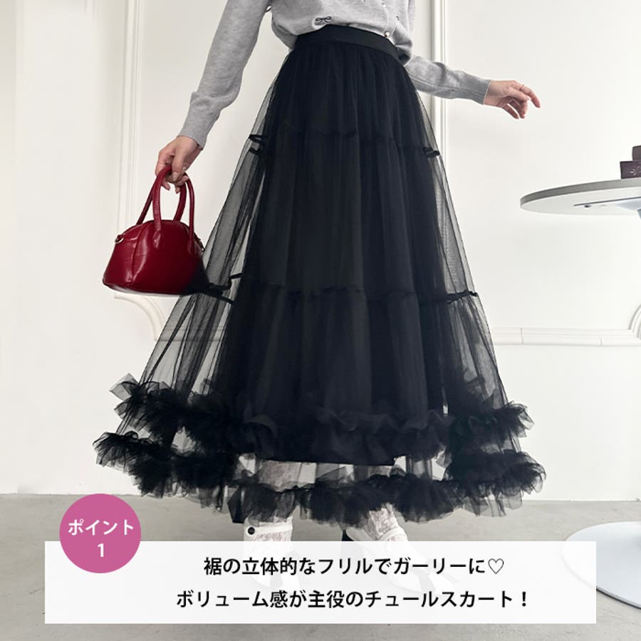 ・たっぷりの生地&裾のボリューミーなフリルがアクセントのチュールロングスカート