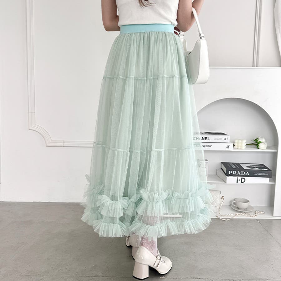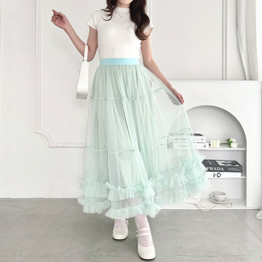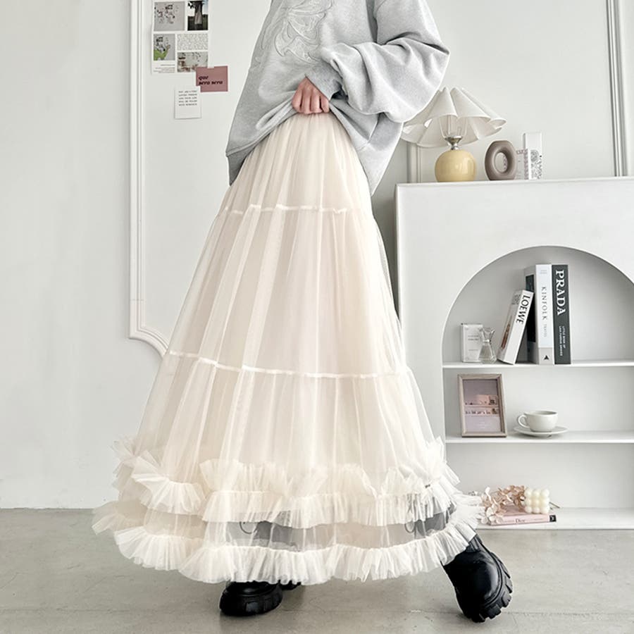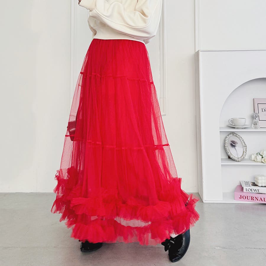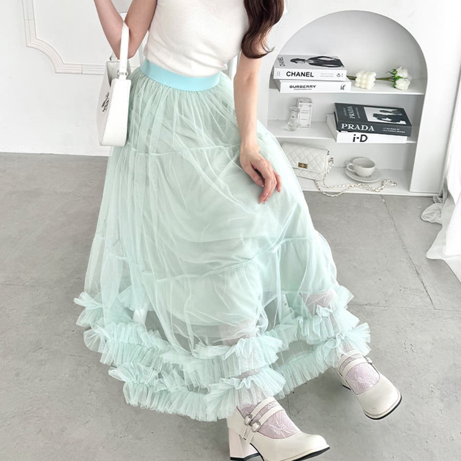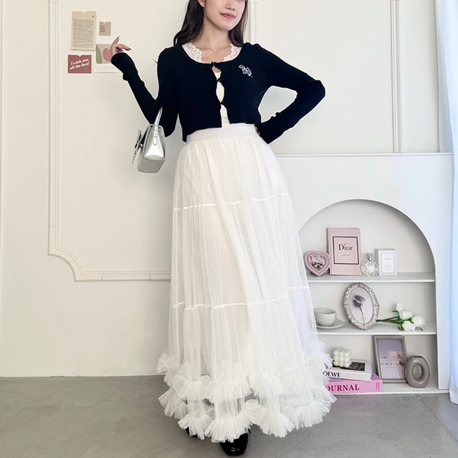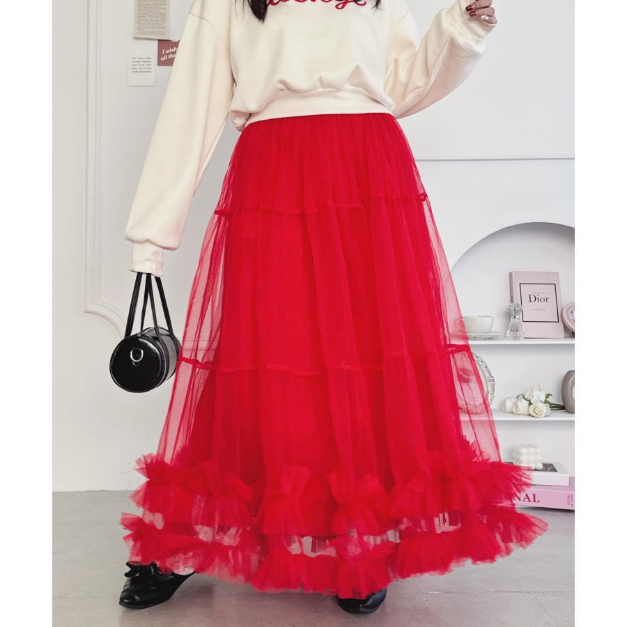 ・たっぷりの生地&裾のボリューミーなフリルがアクセントのチュールロングスカート