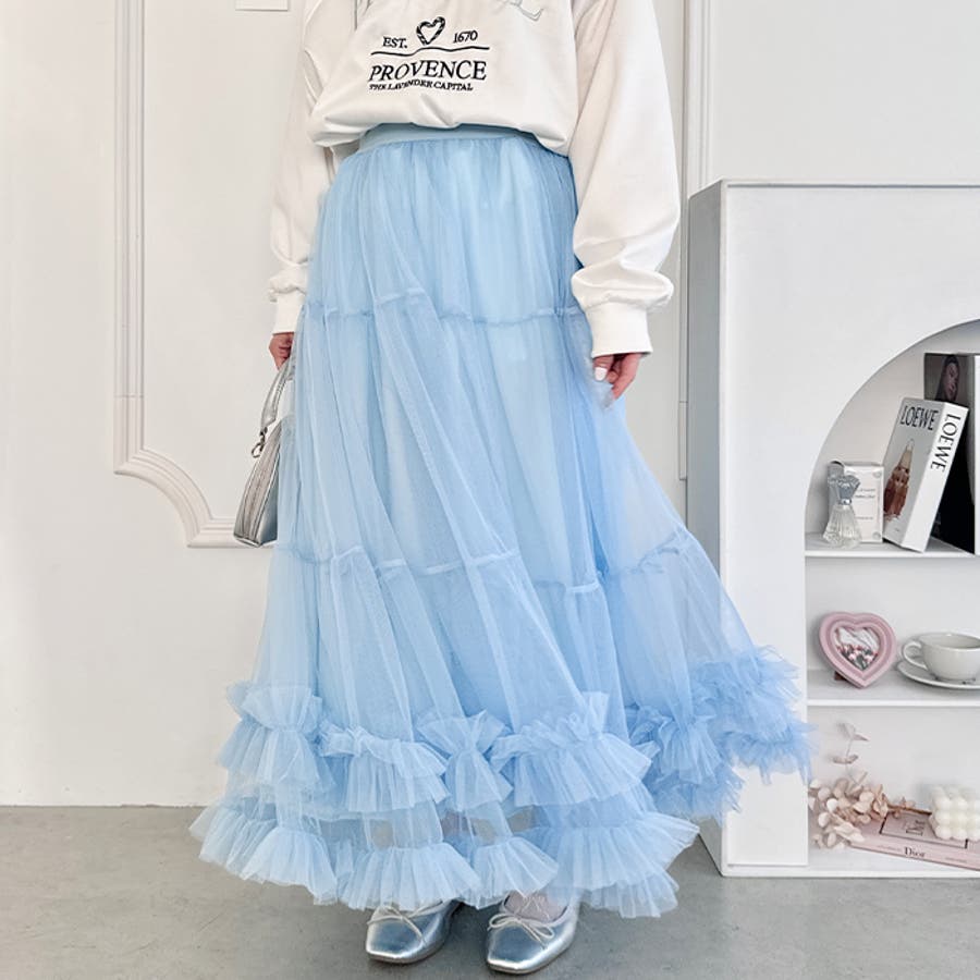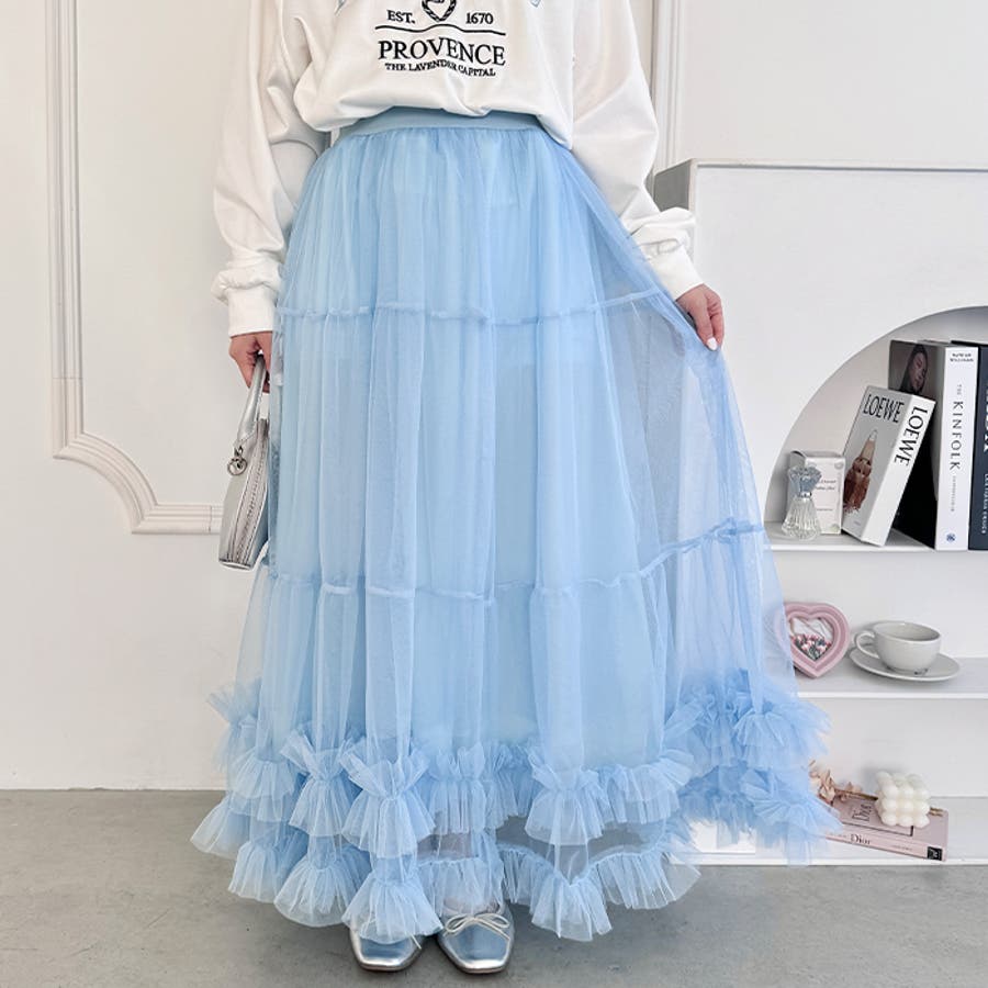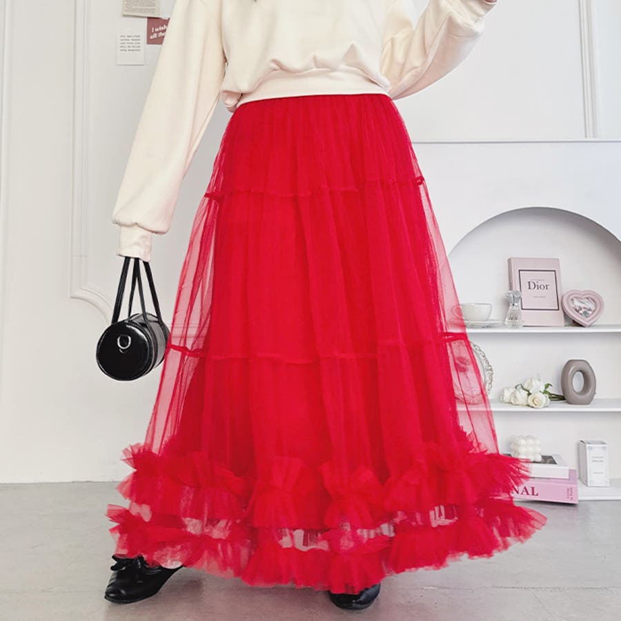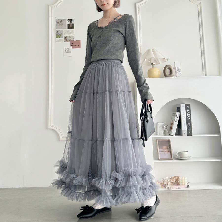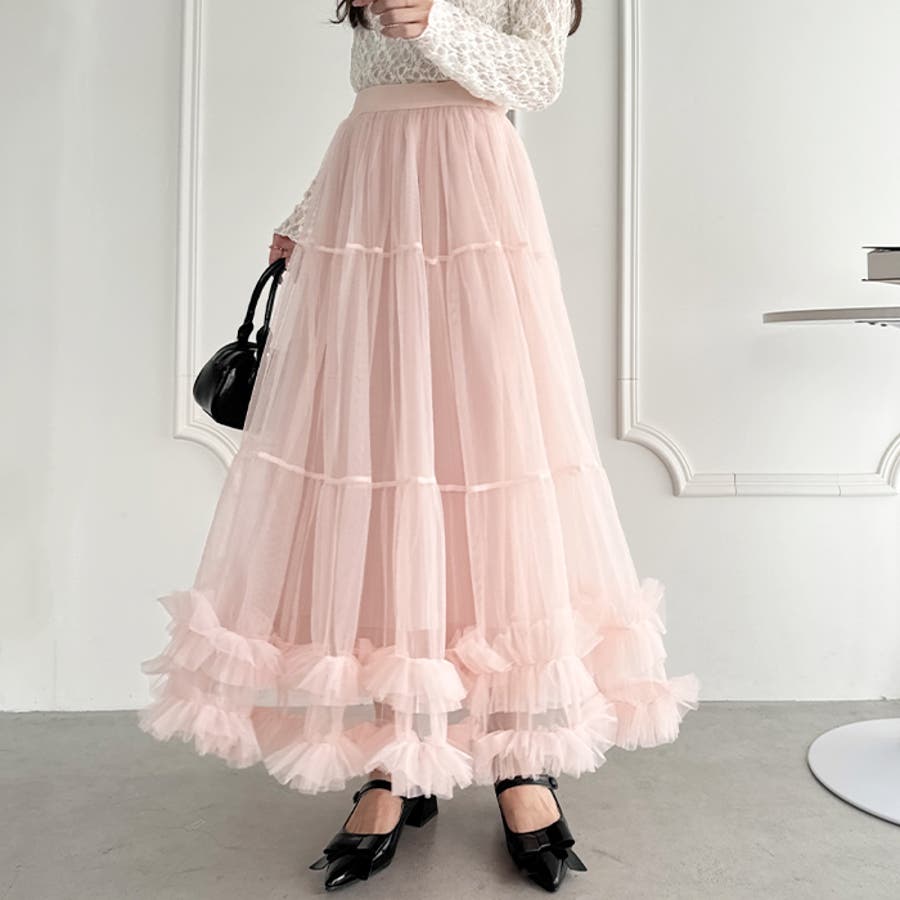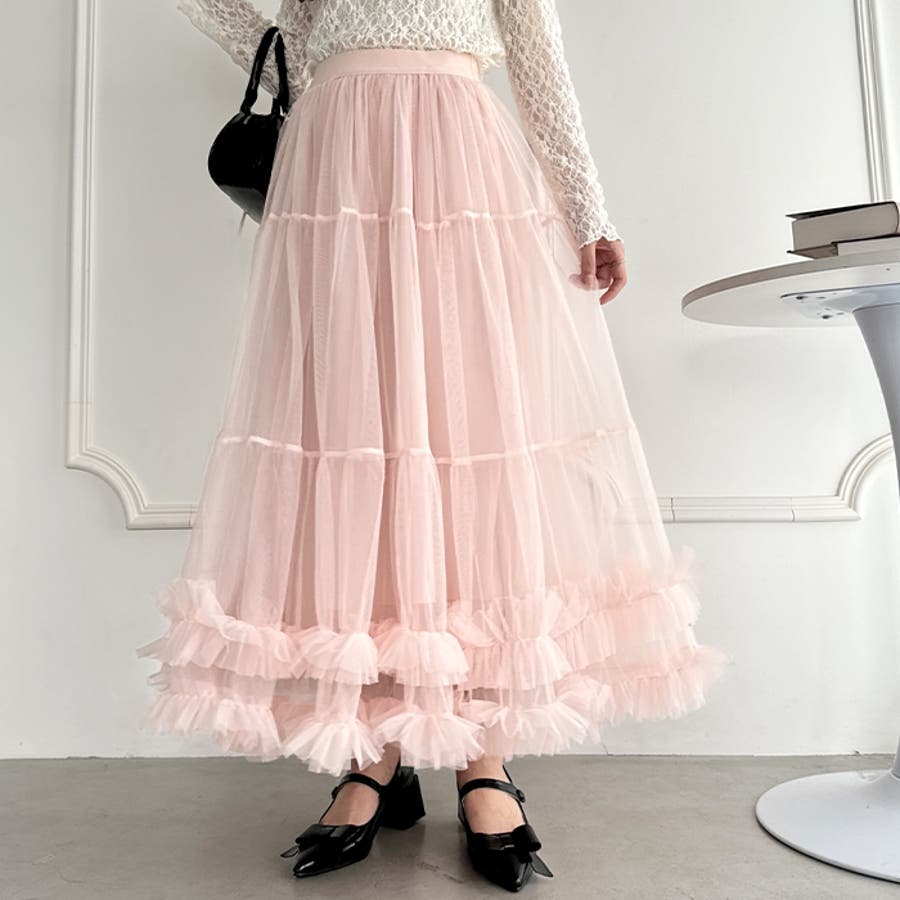 ・たっぷりの生地&裾のボリューミーなフリルがアクセントのチュールロングスカート