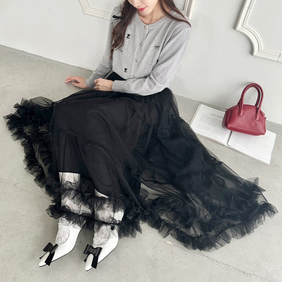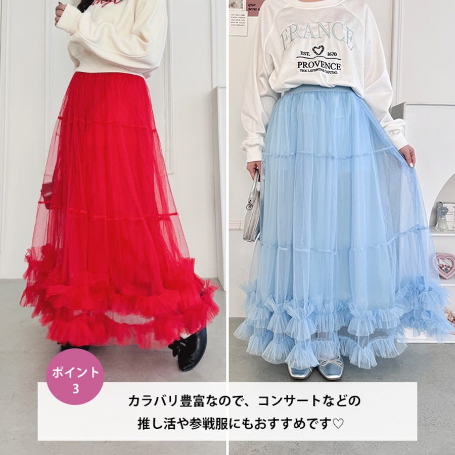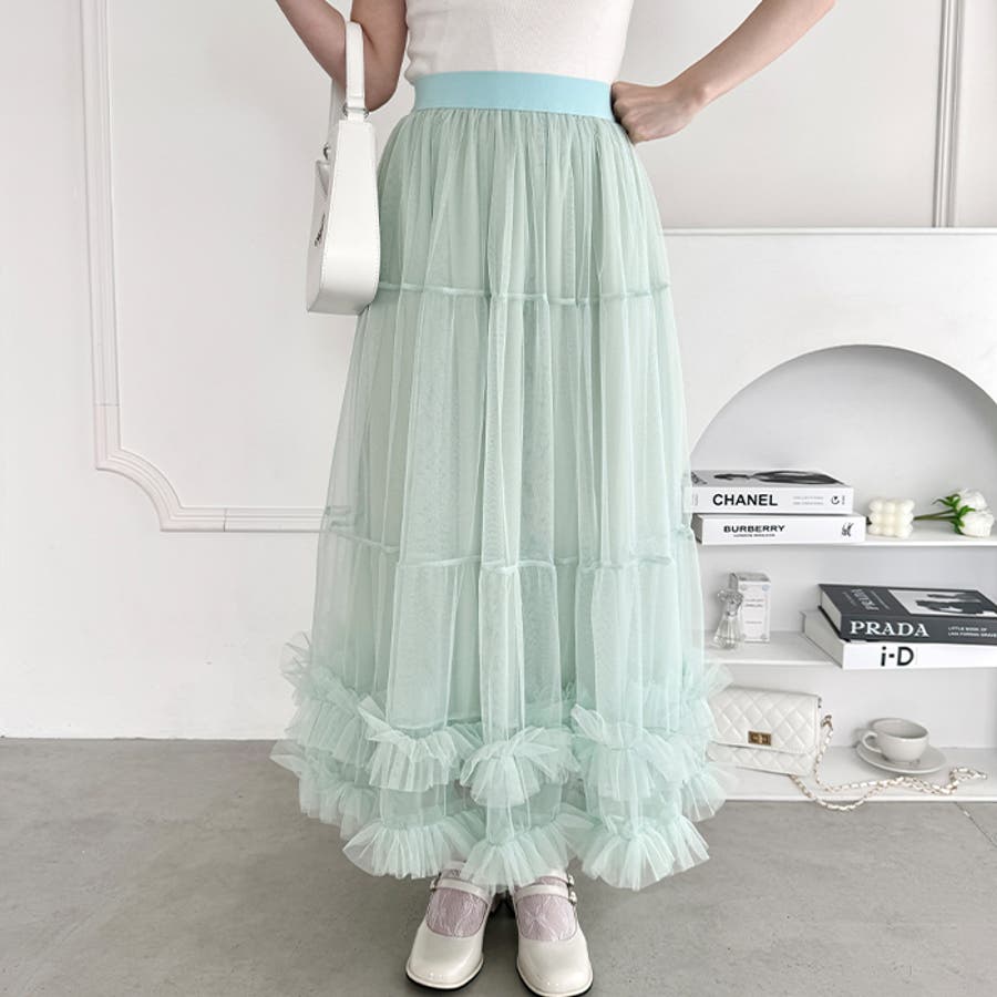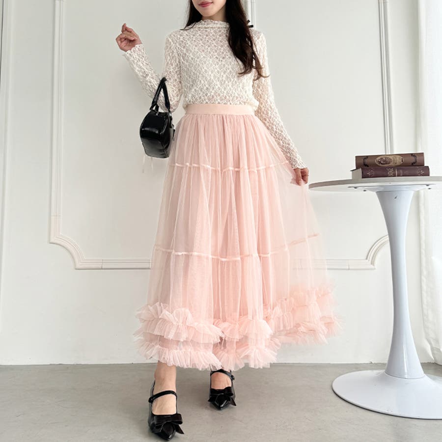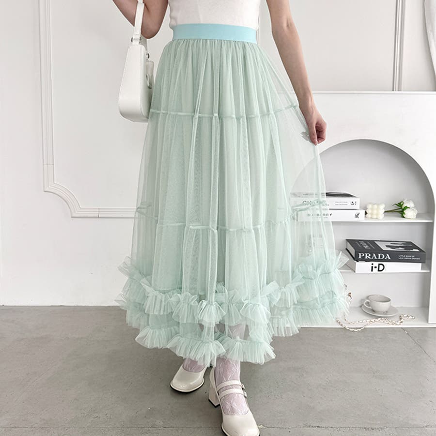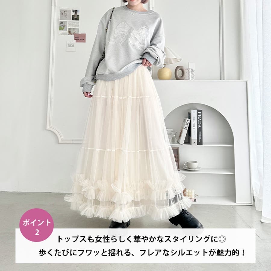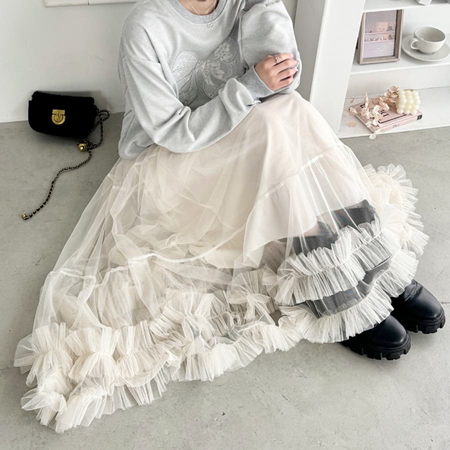 ・たっぷりの生地&裾のボリューミーなフリルがアクセントのチュールロングスカート