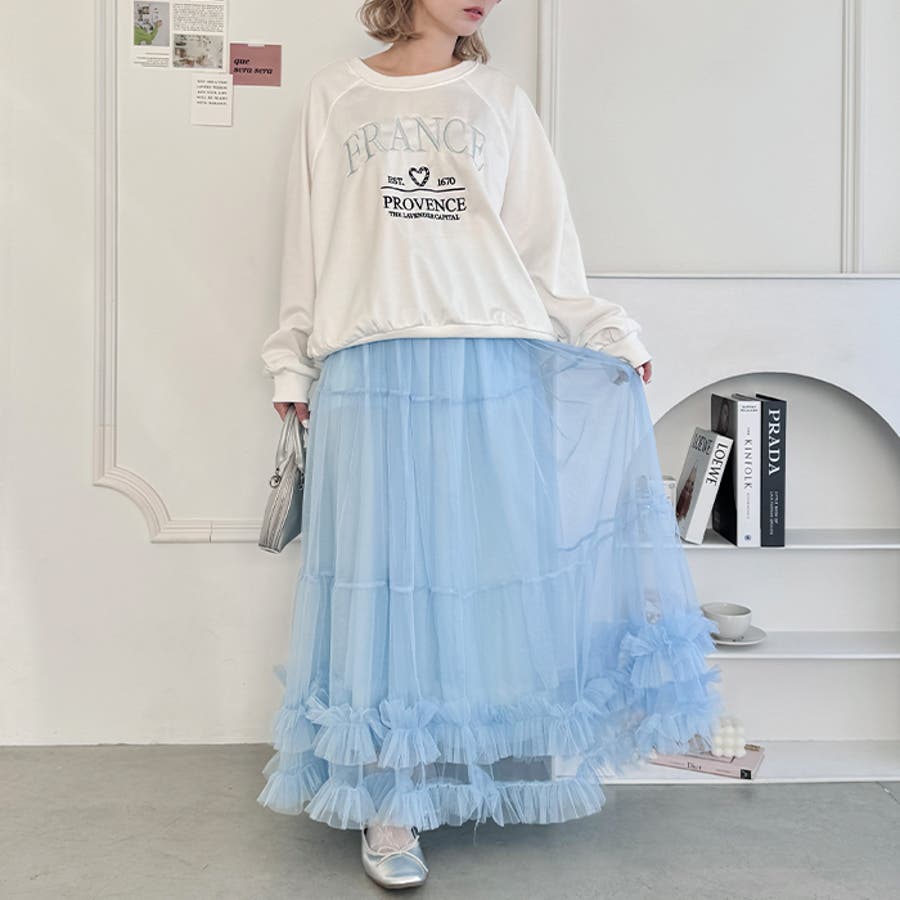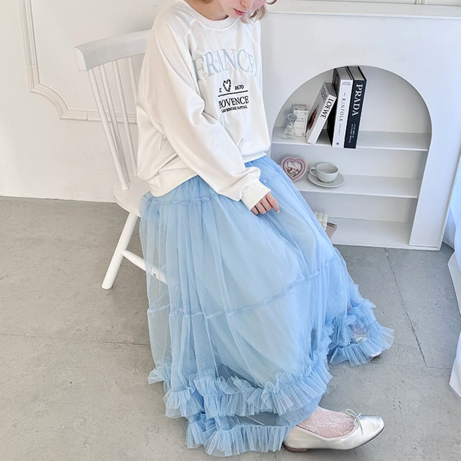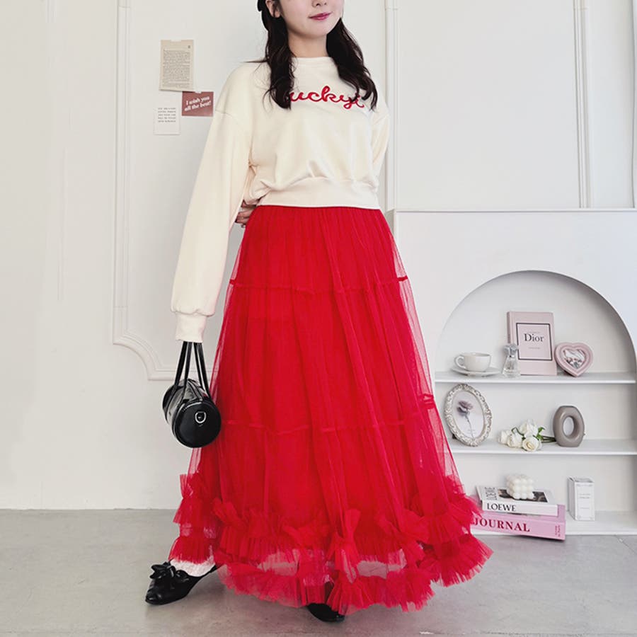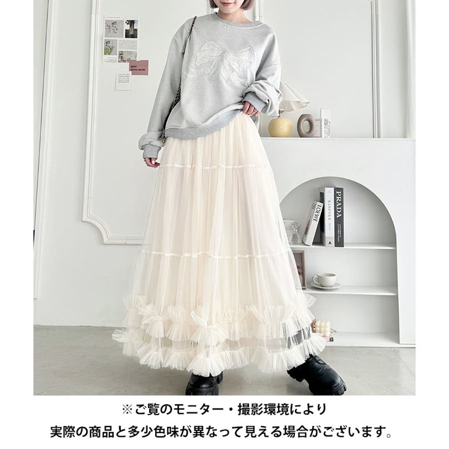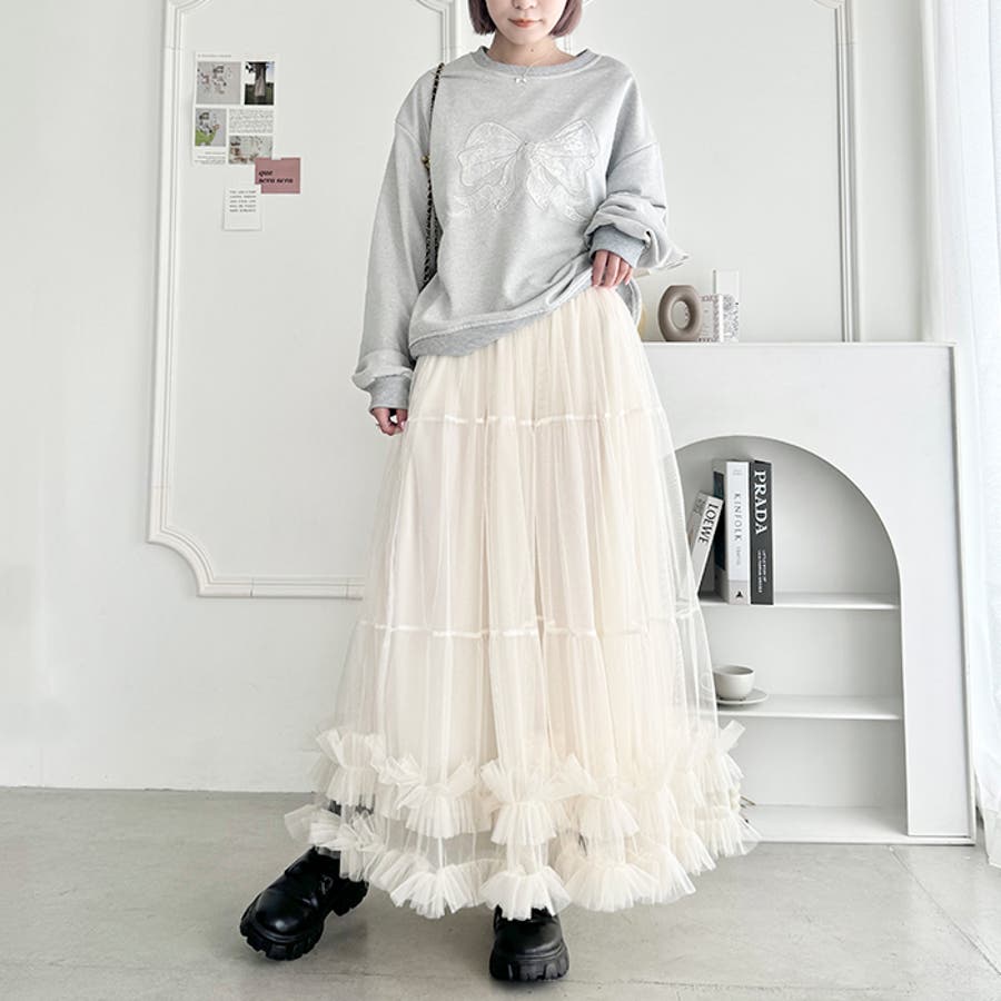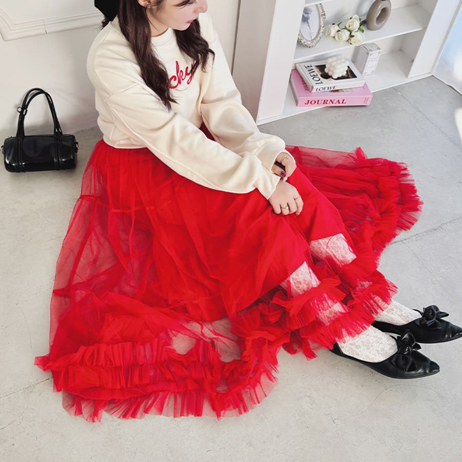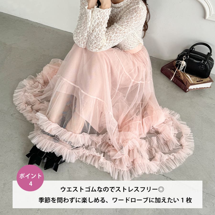 ・たっぷりの生地&裾のボリューミーなフリルがアクセントのチュールロングスカート