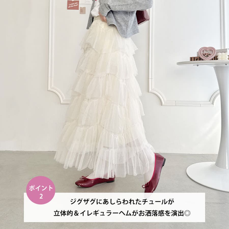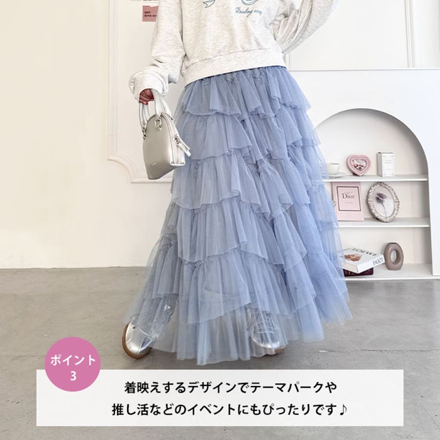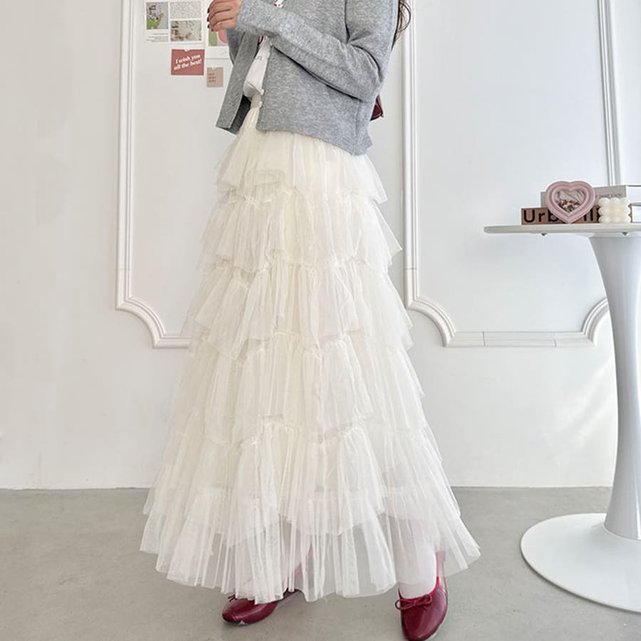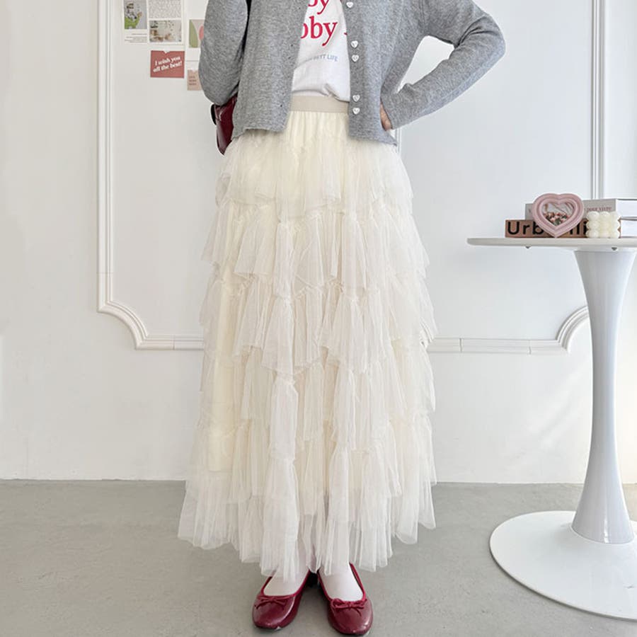 ・チュールのボリューム感が可愛い、フレアなシルエットのロングスカート
