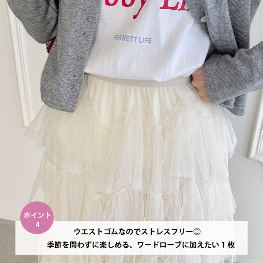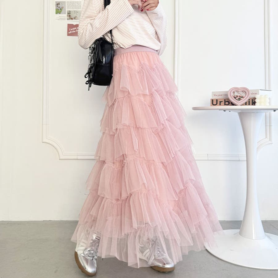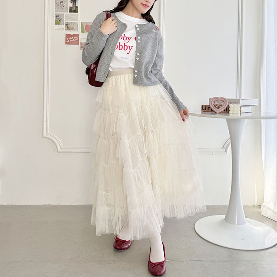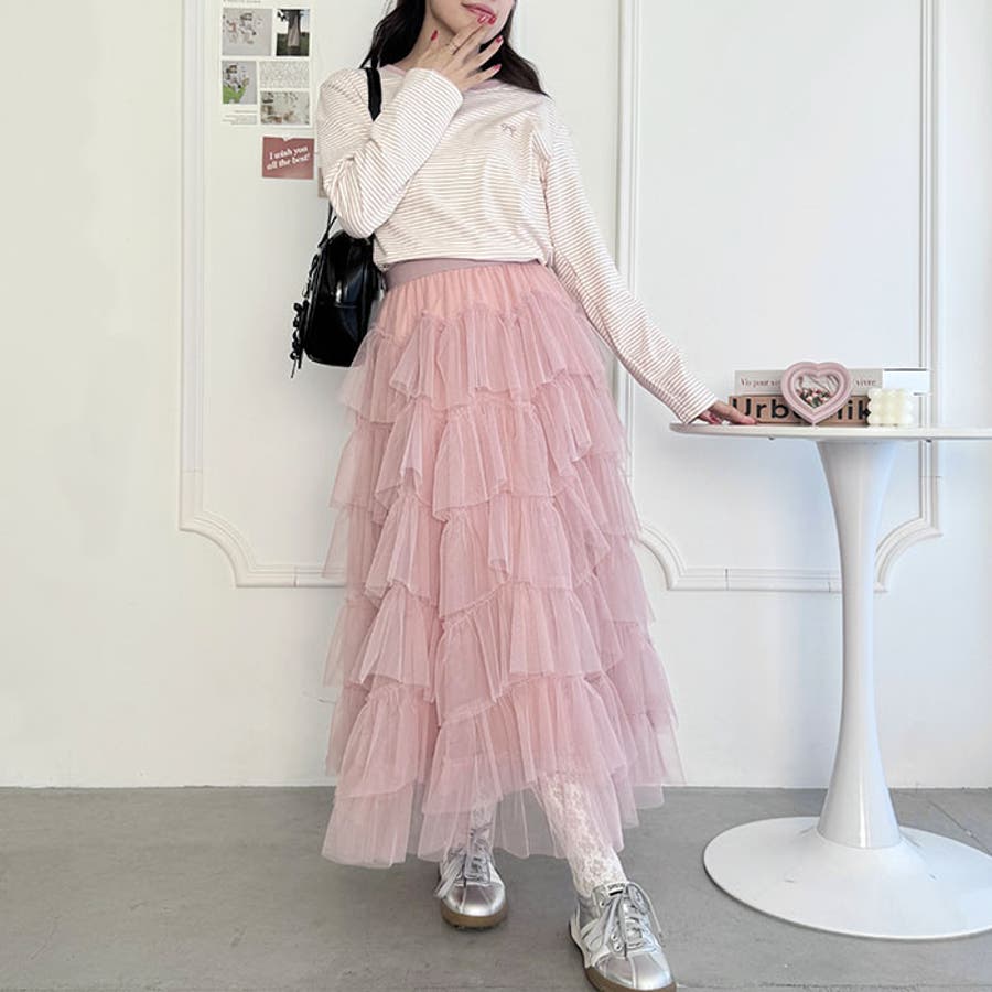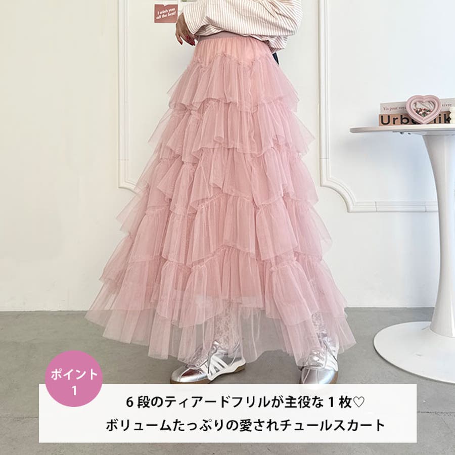 ・チュールのボリューム感が可愛い、フレアなシルエットのロングスカート