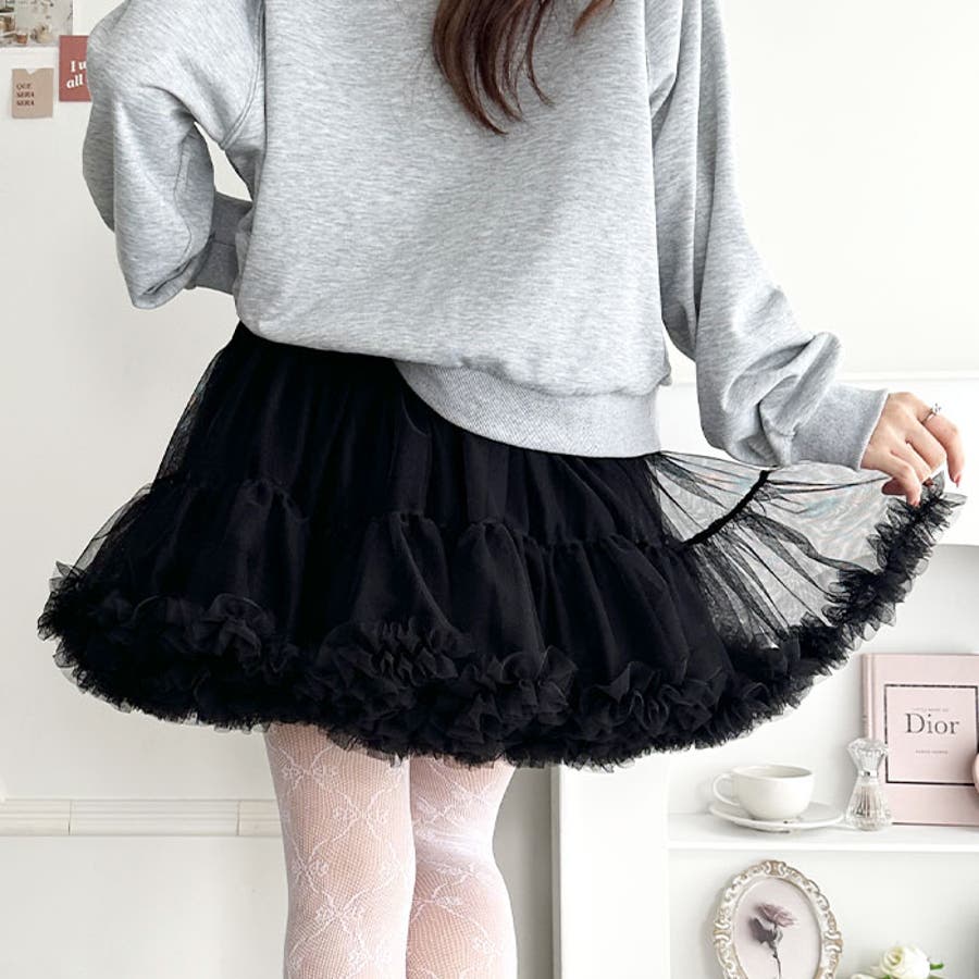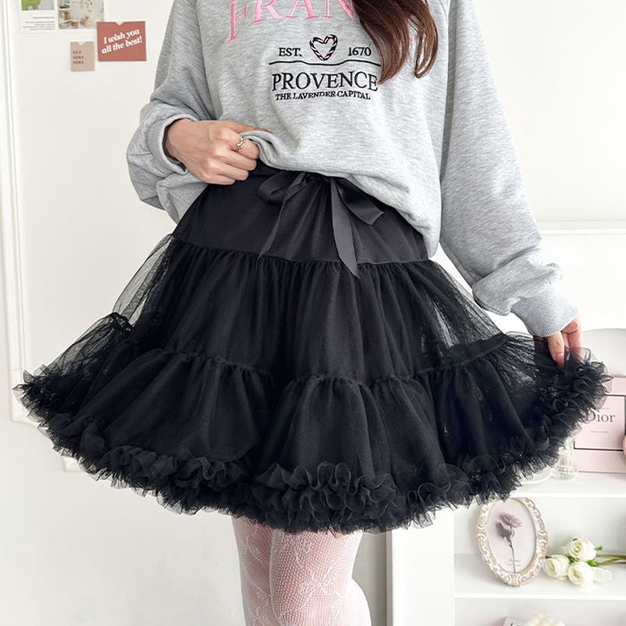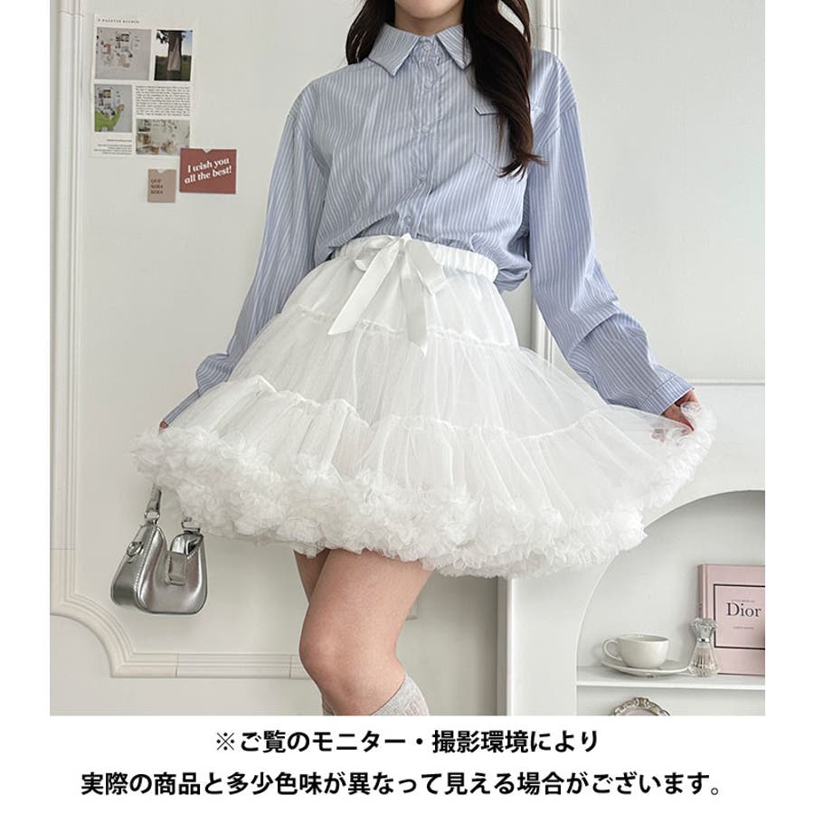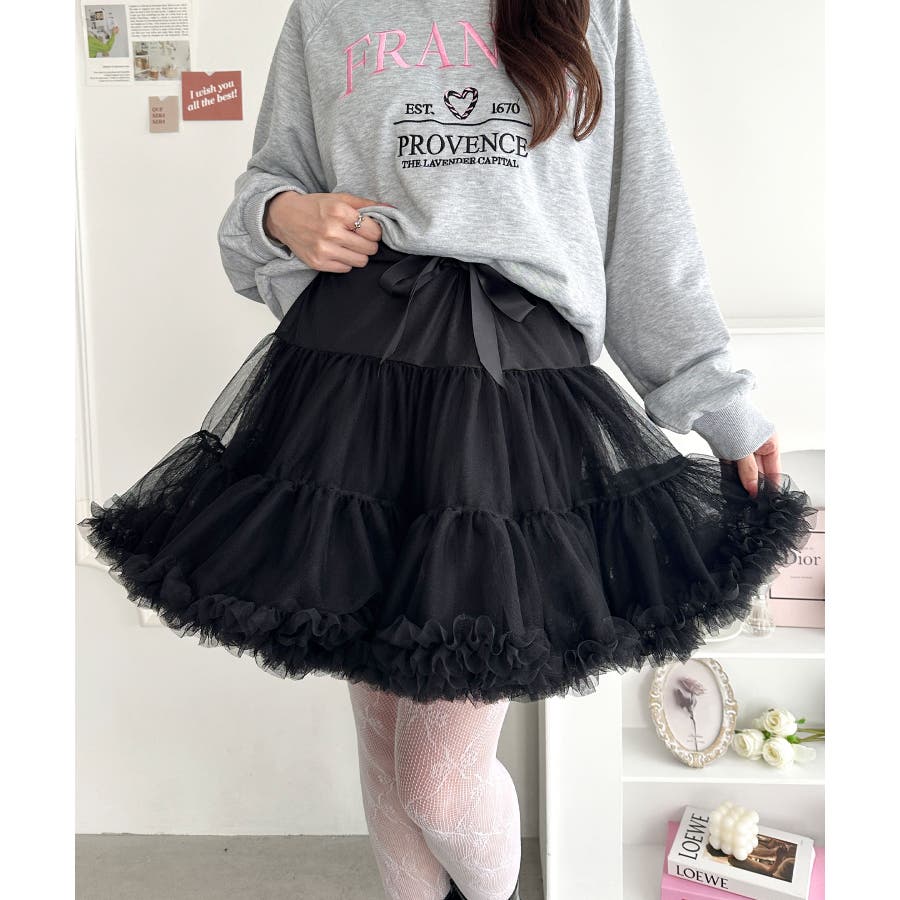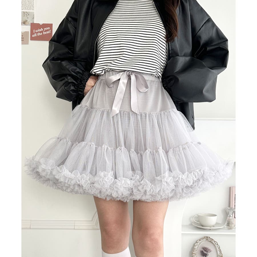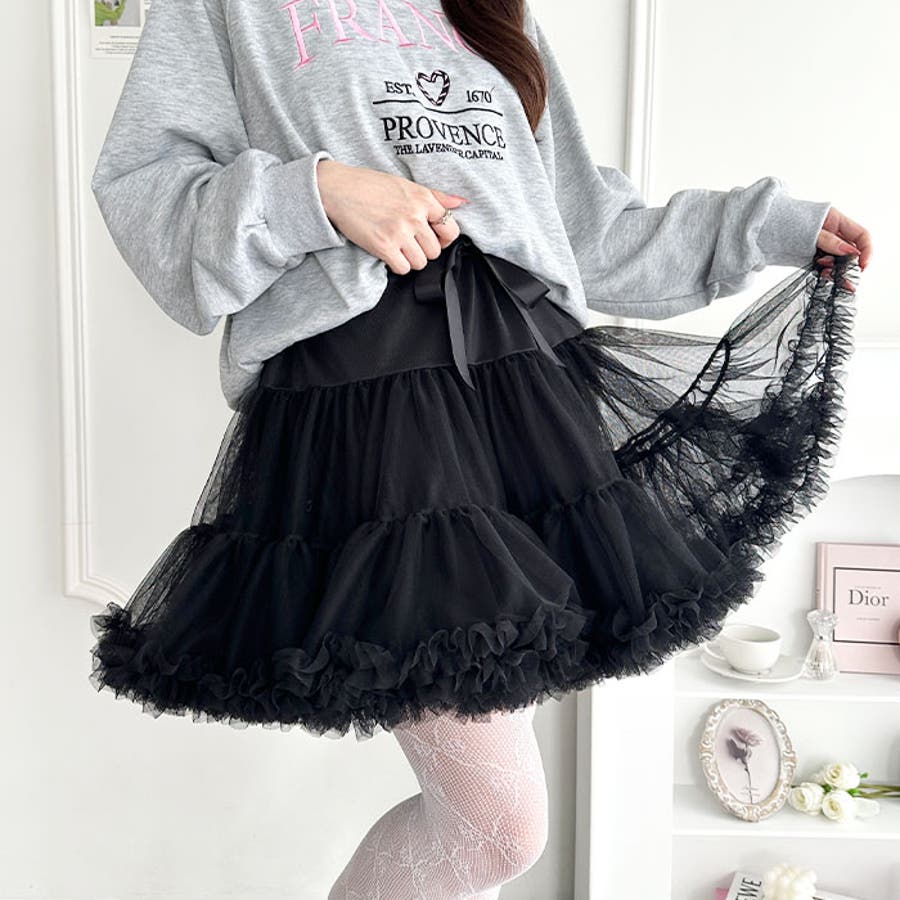 チュールを何段にも重ねてたっぷり使用した贅沢なフリルパニエスカート。