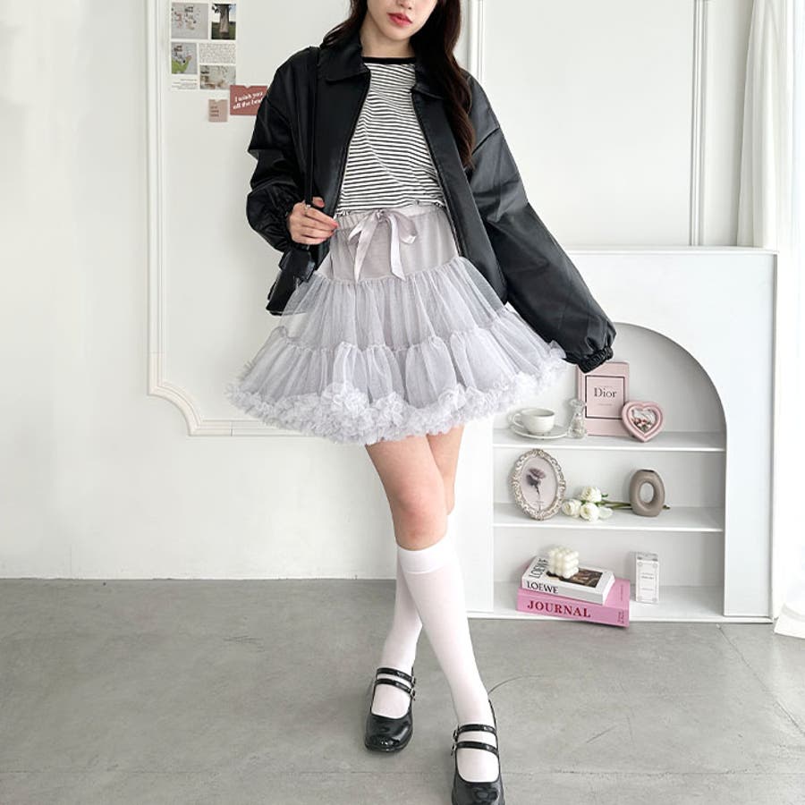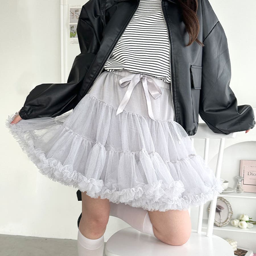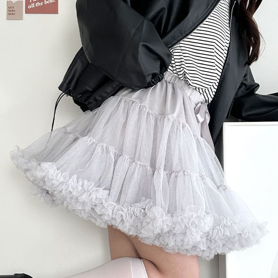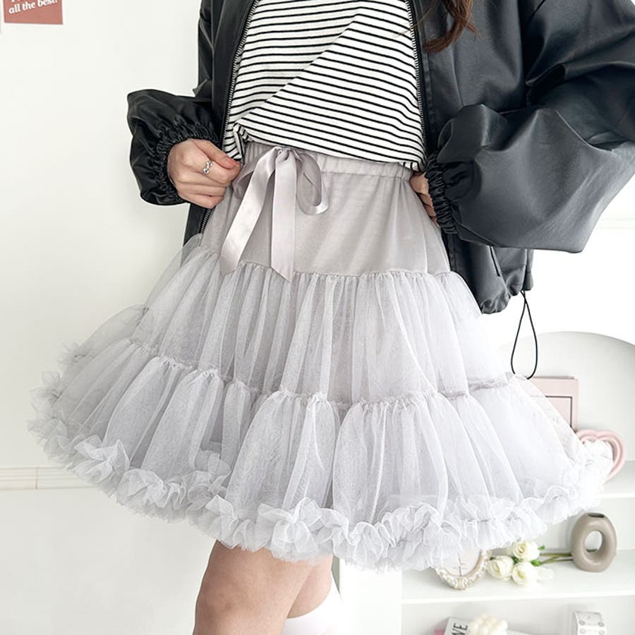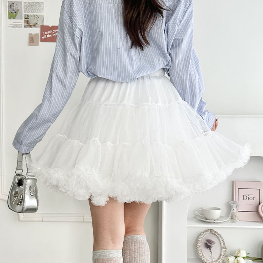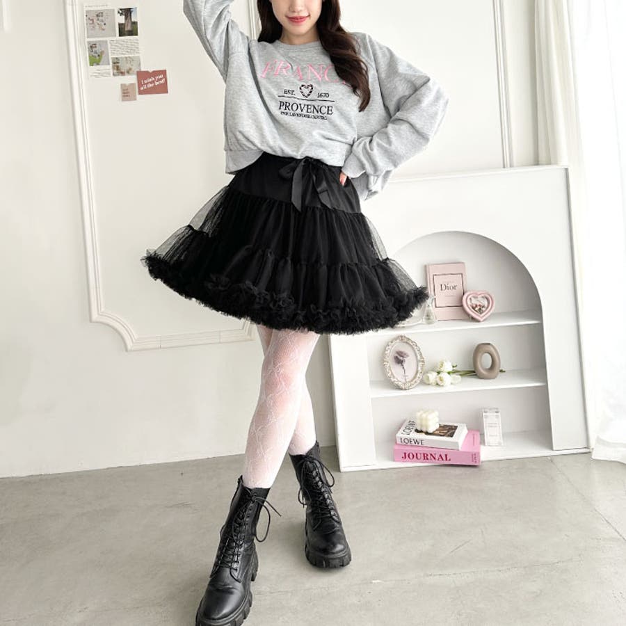 チュールを何段にも重ねてたっぷり使用した贅沢なフリルパニエスカート。