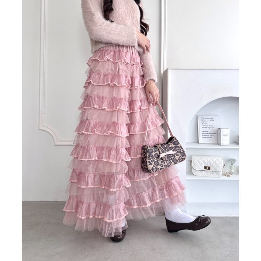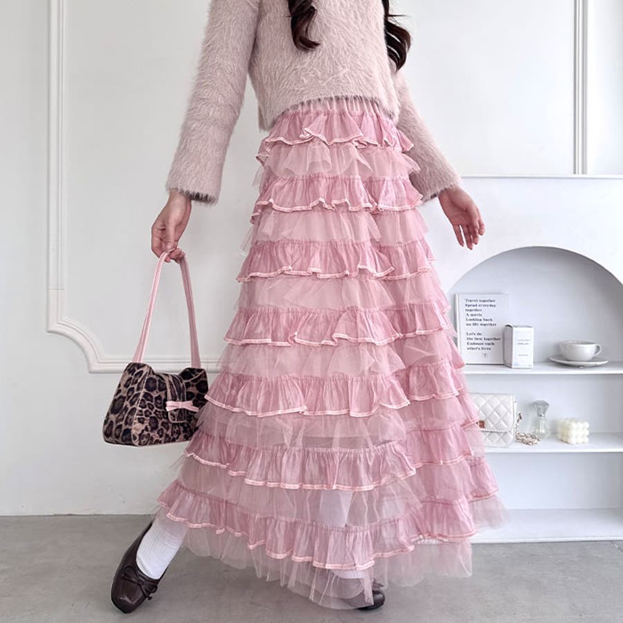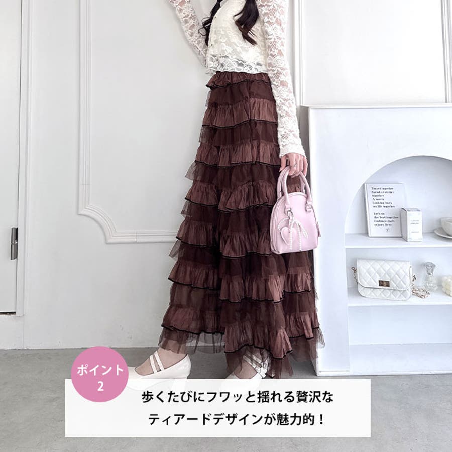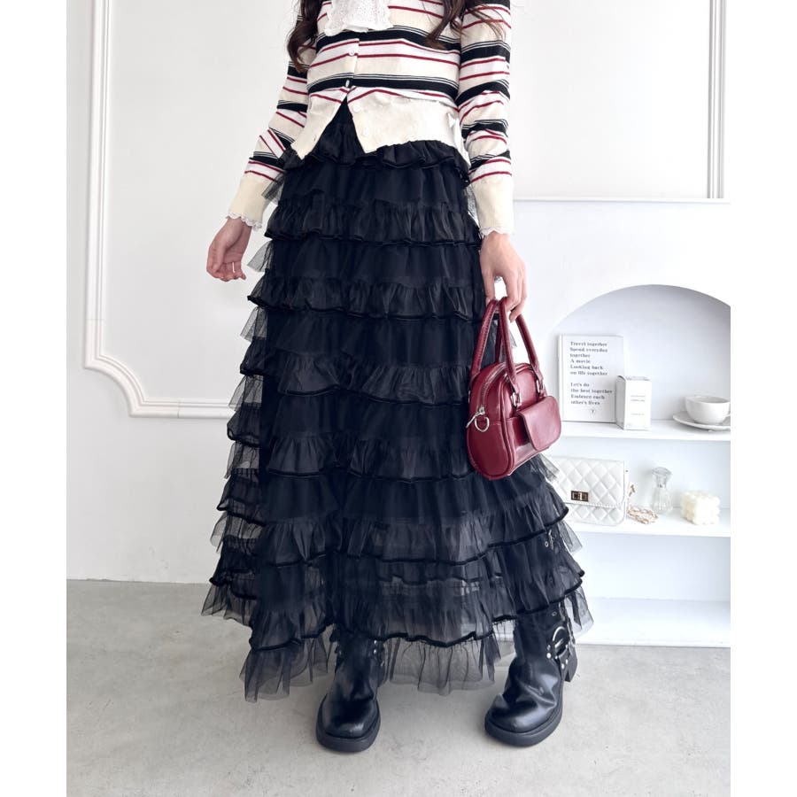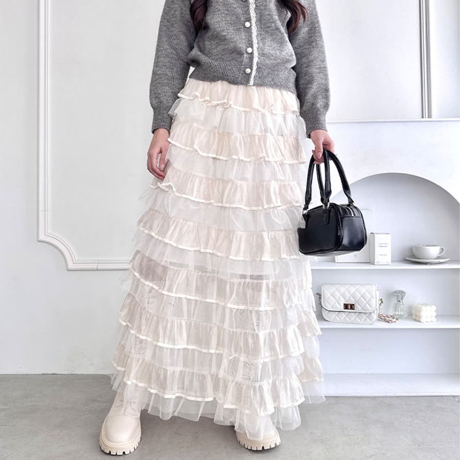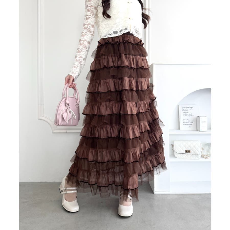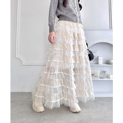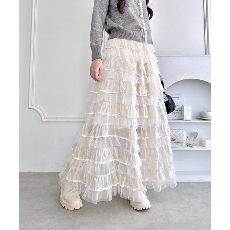 ・チュール&オーガンジーのボリューム感が可愛い、フレアなシルエットのロングスカート