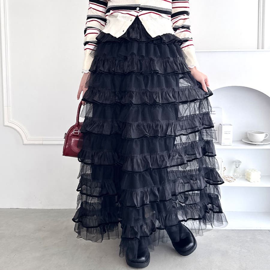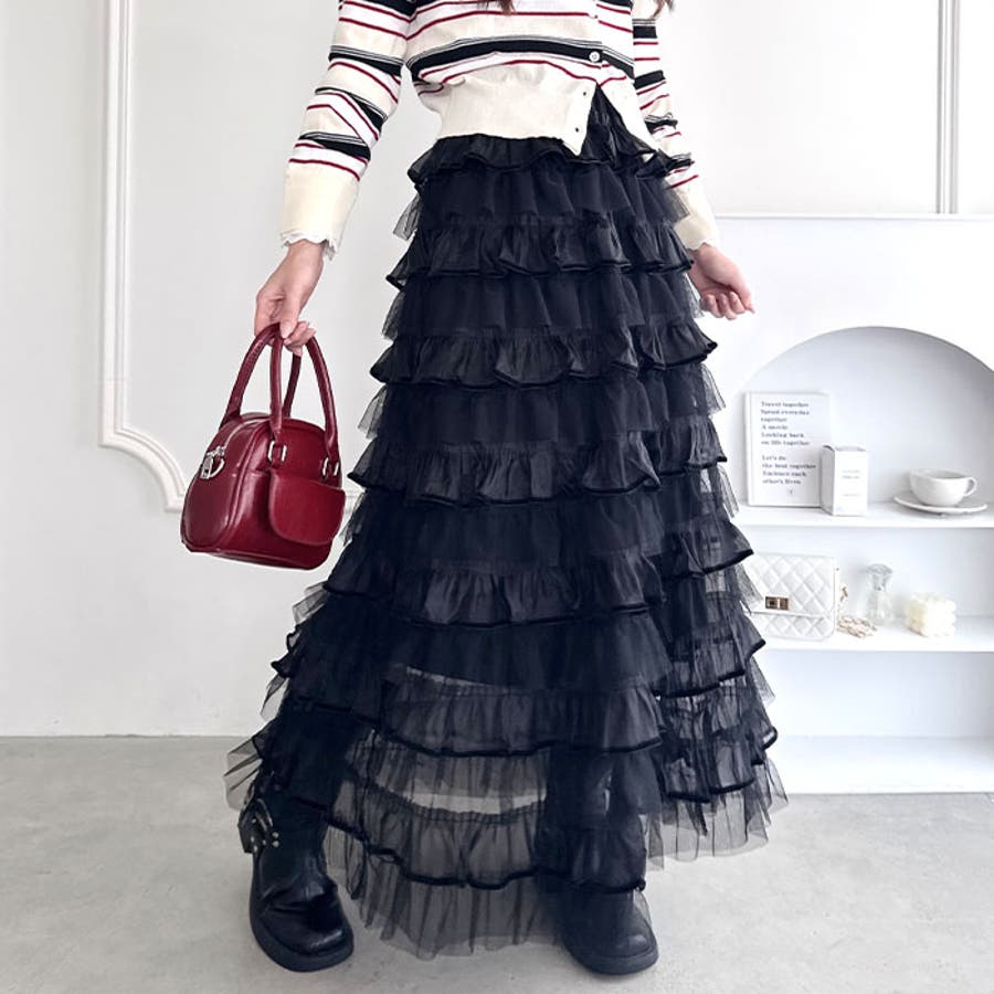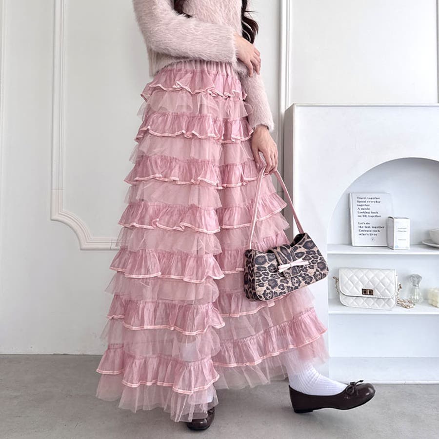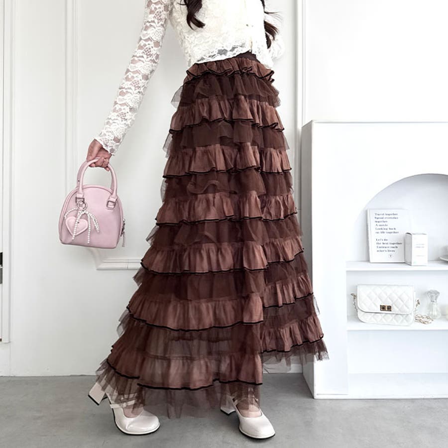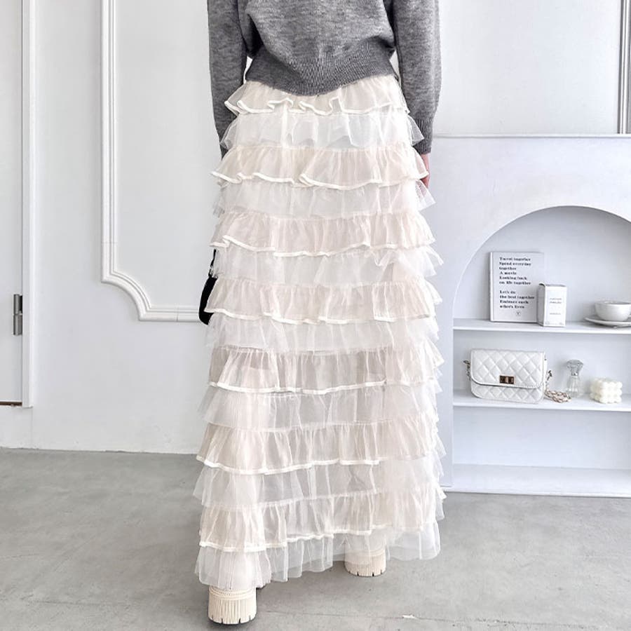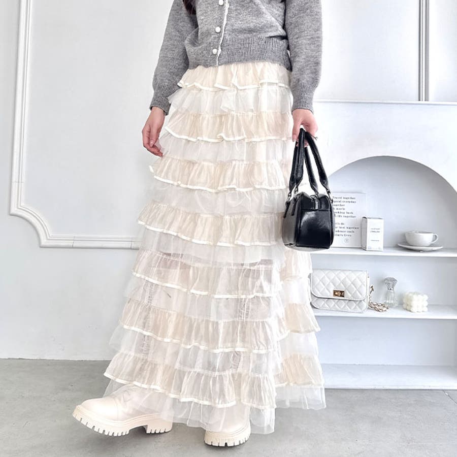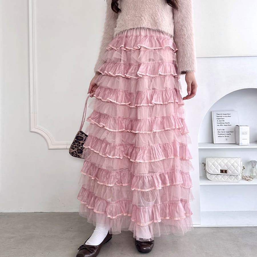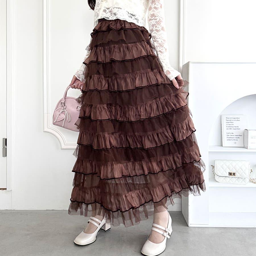 ・チュール&オーガンジーのボリューム感が可愛い、フレアなシルエットのロングスカート