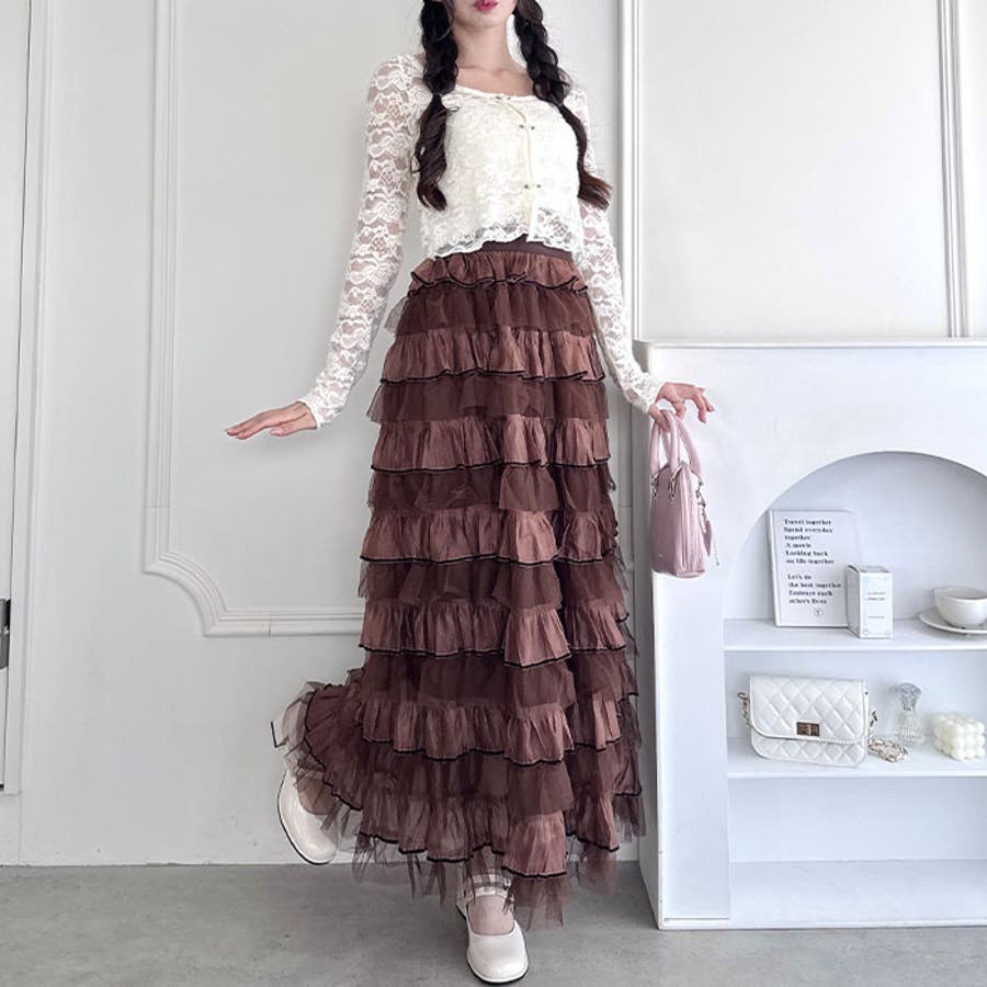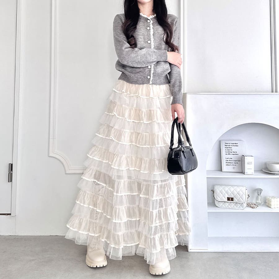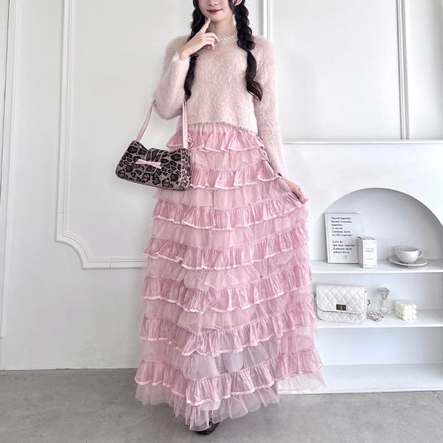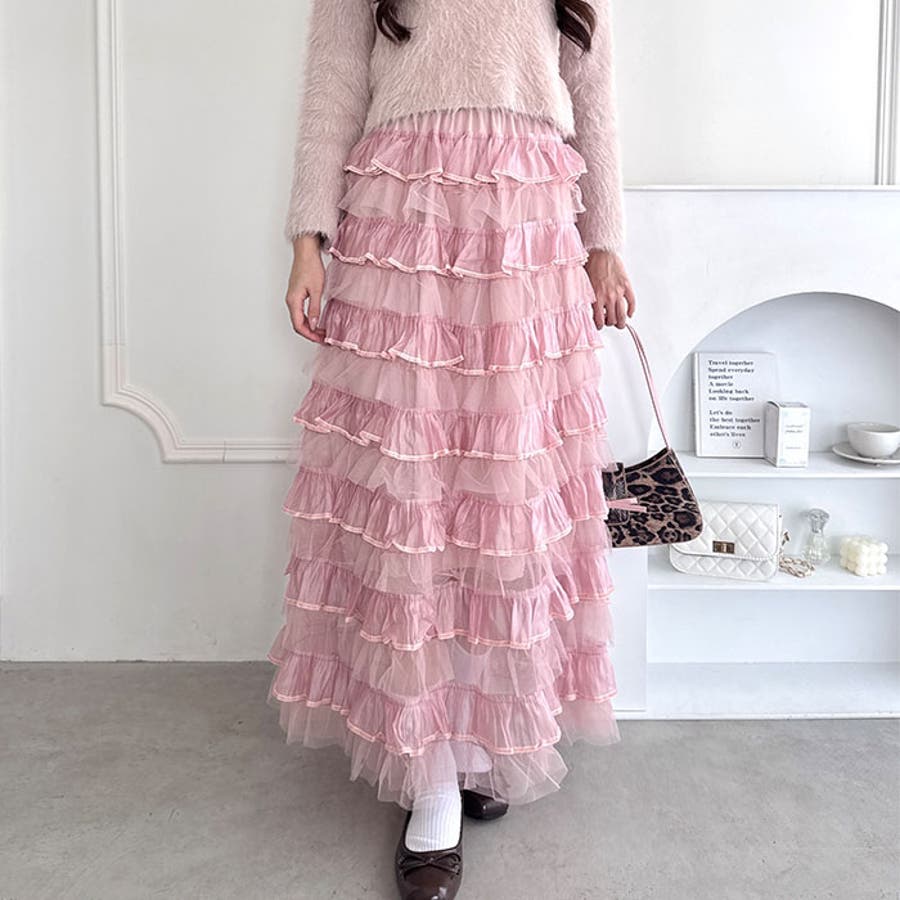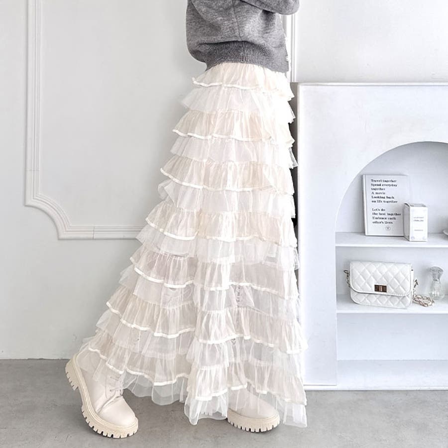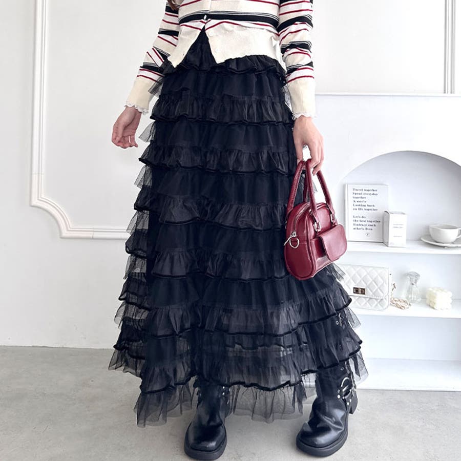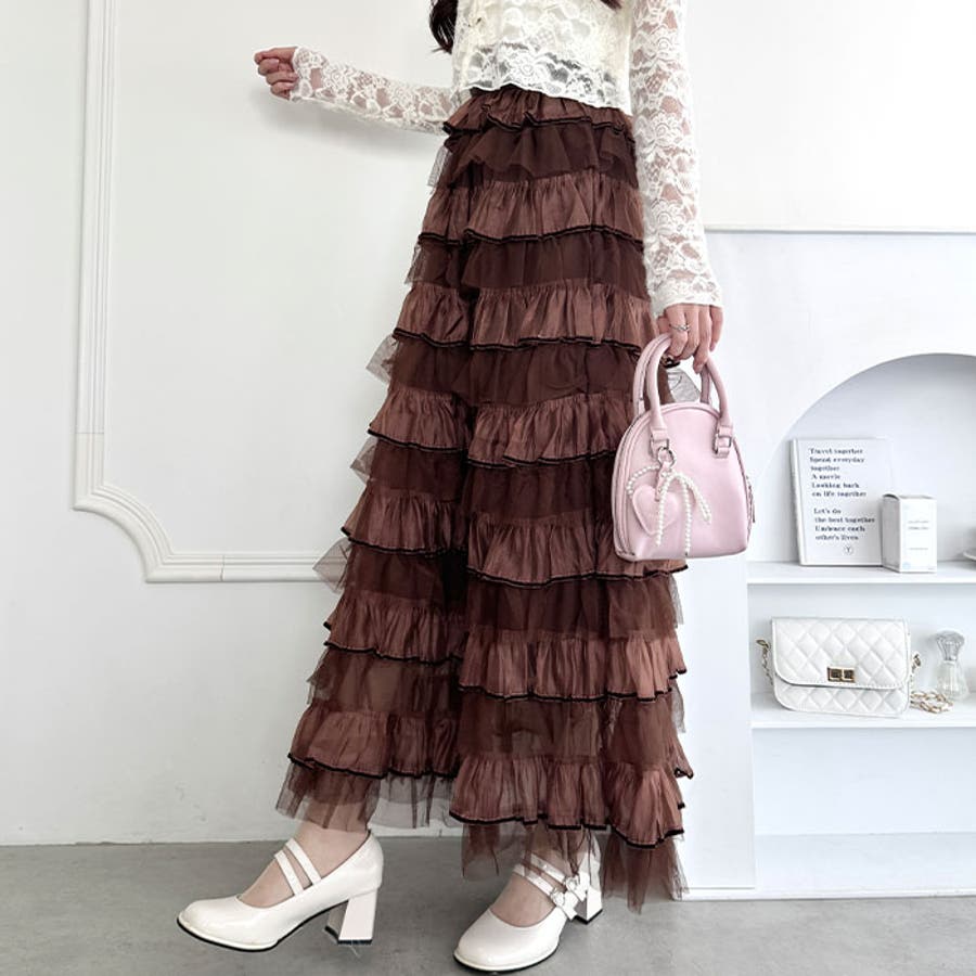 ・チュール&オーガンジーのボリューム感が可愛い、フレアなシルエットのロングスカート