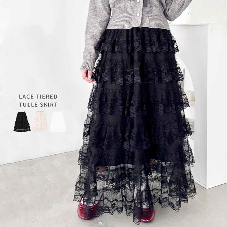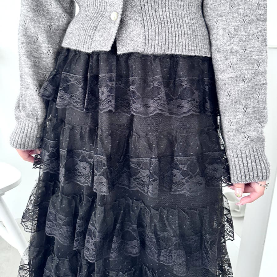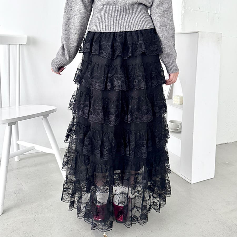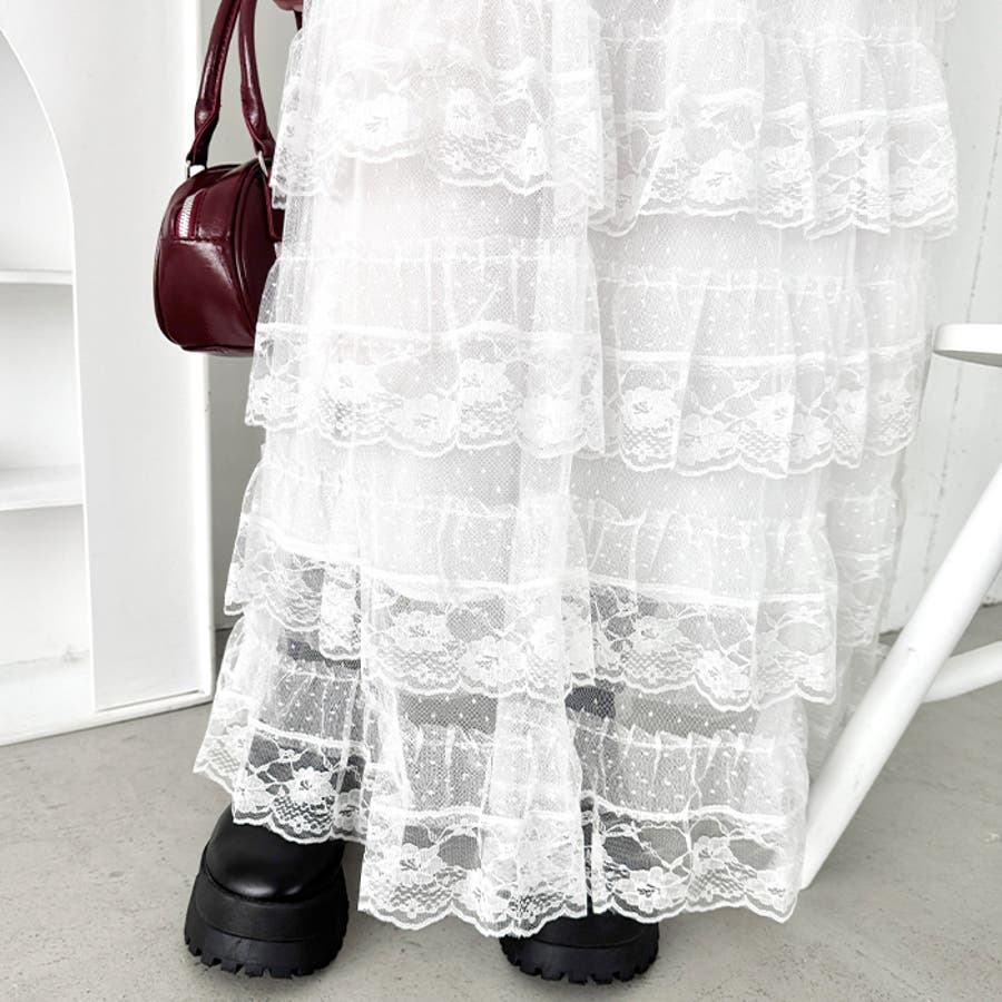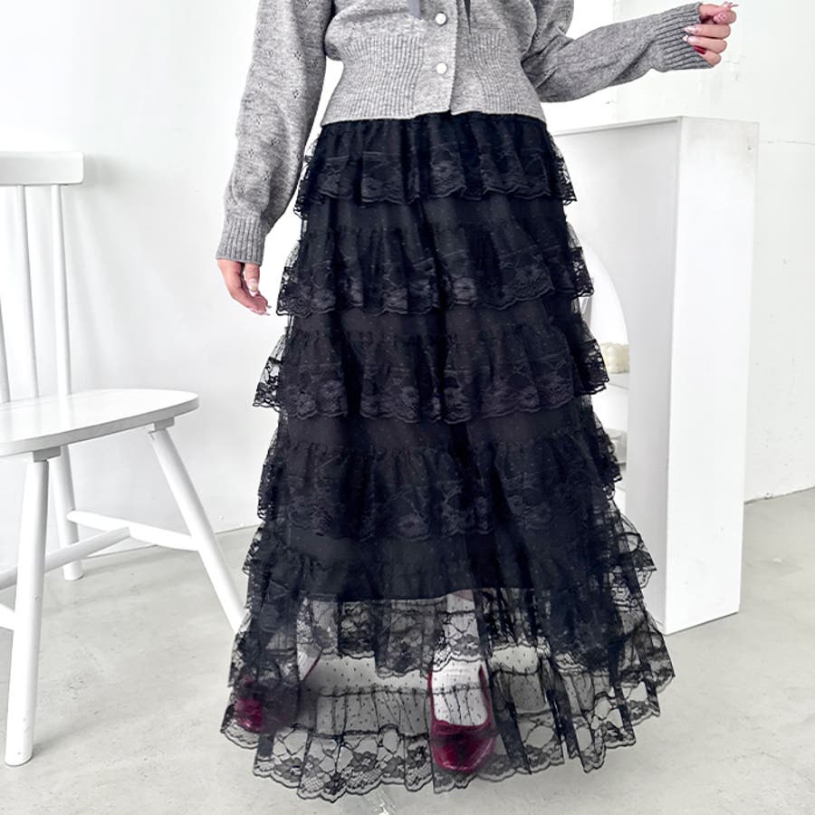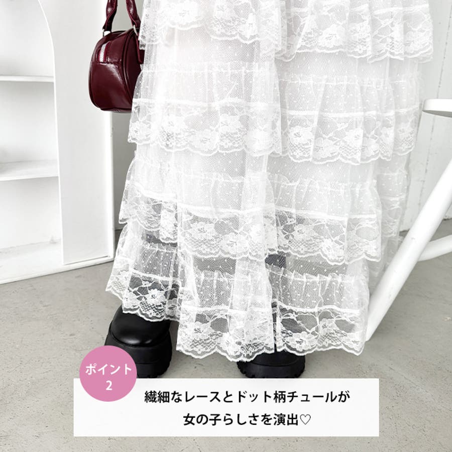 ・チュールフリルのボリューム感が可愛い、レース素材のロングスカート