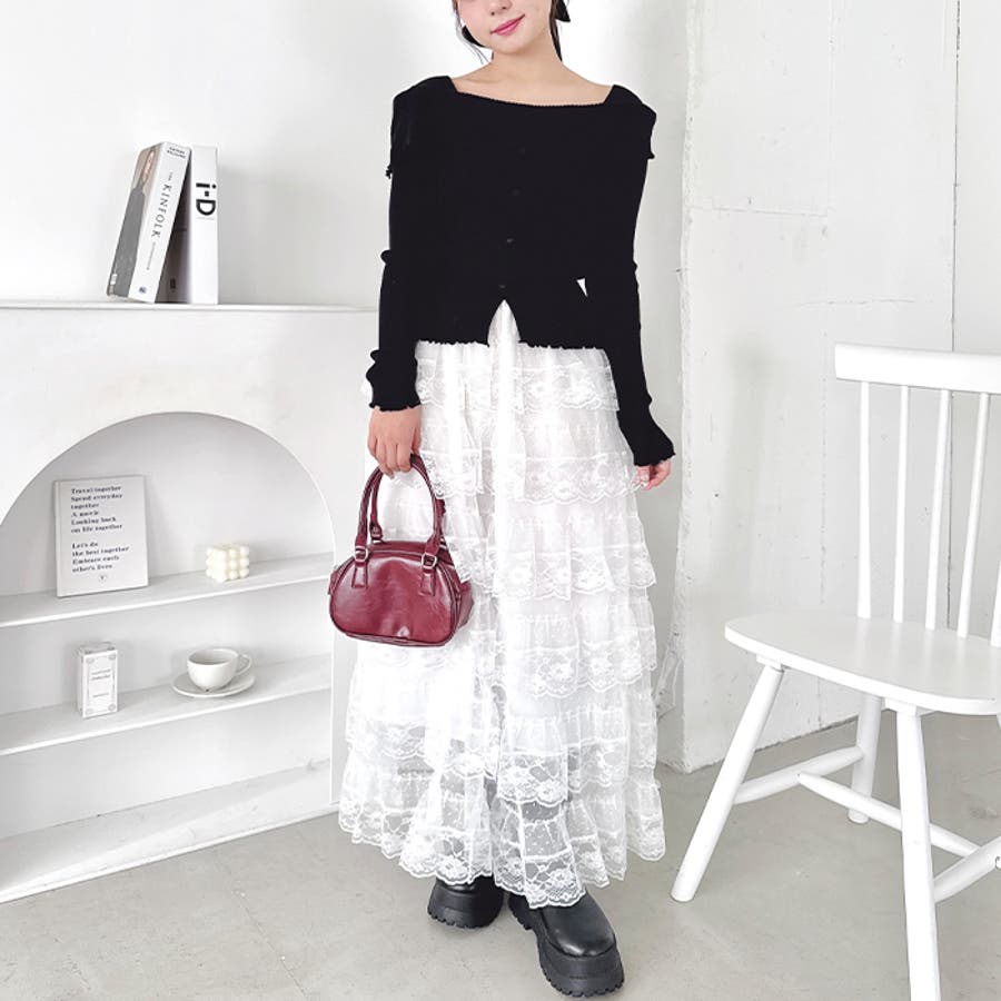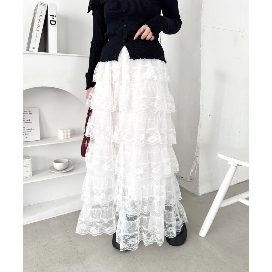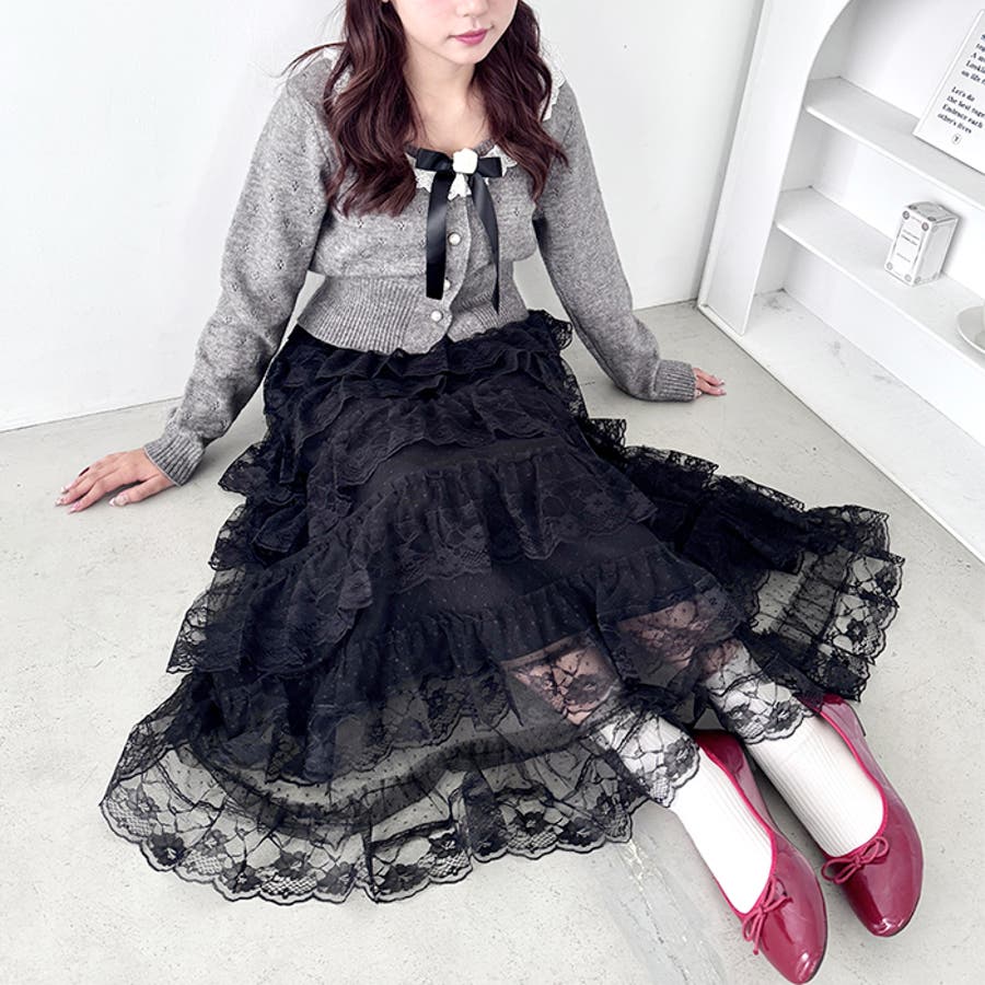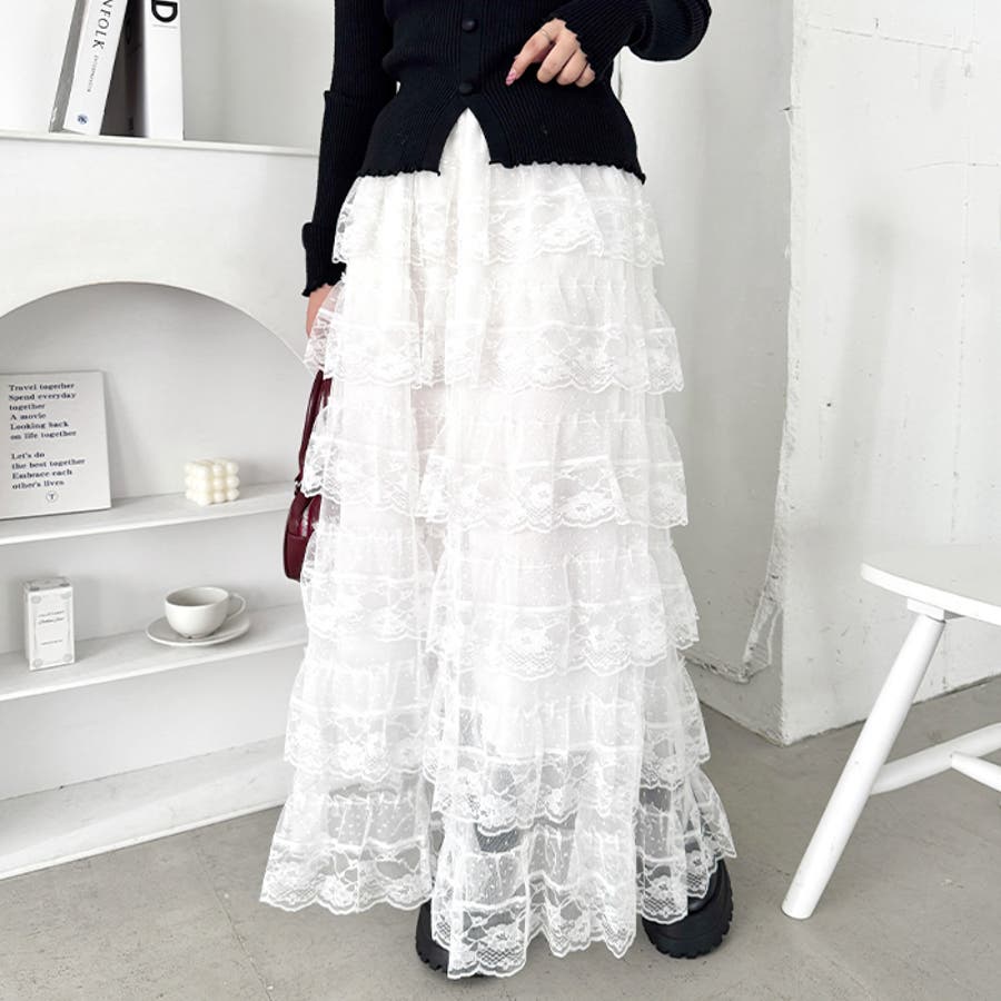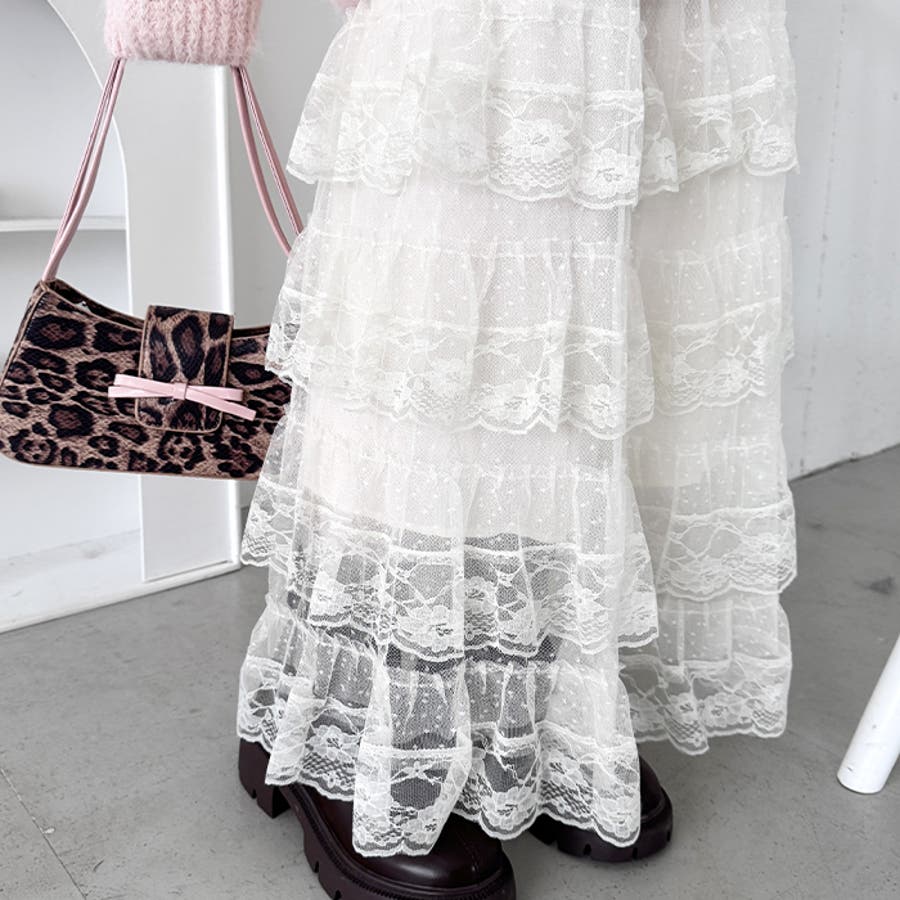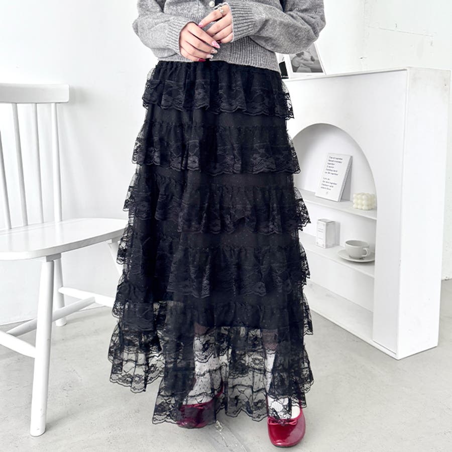 ・チュールフリルのボリューム感が可愛い、レース素材のロングスカート