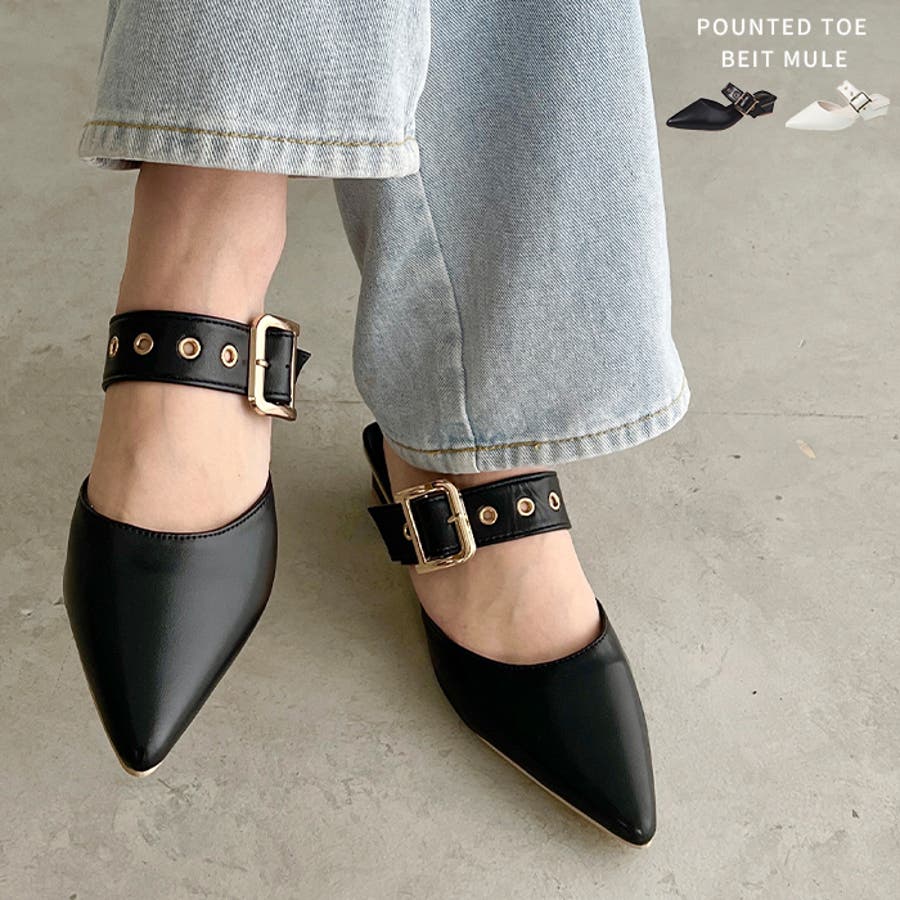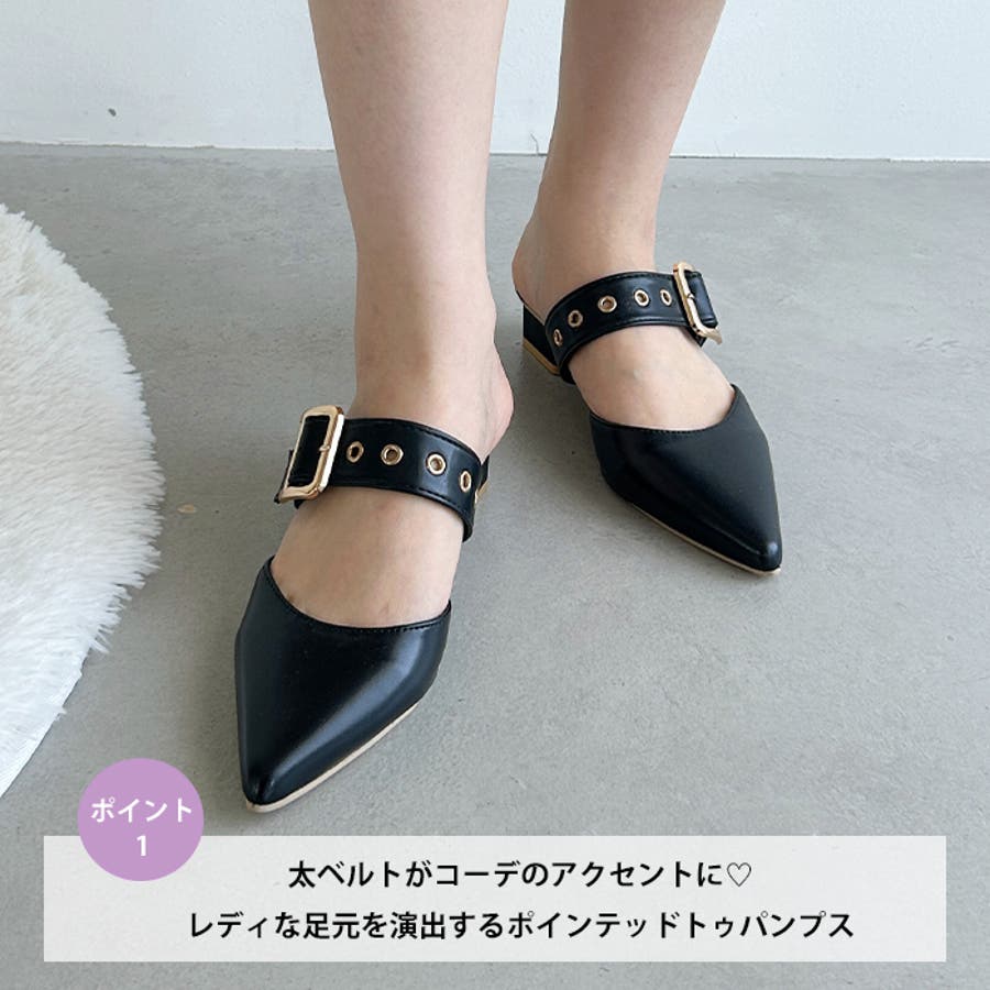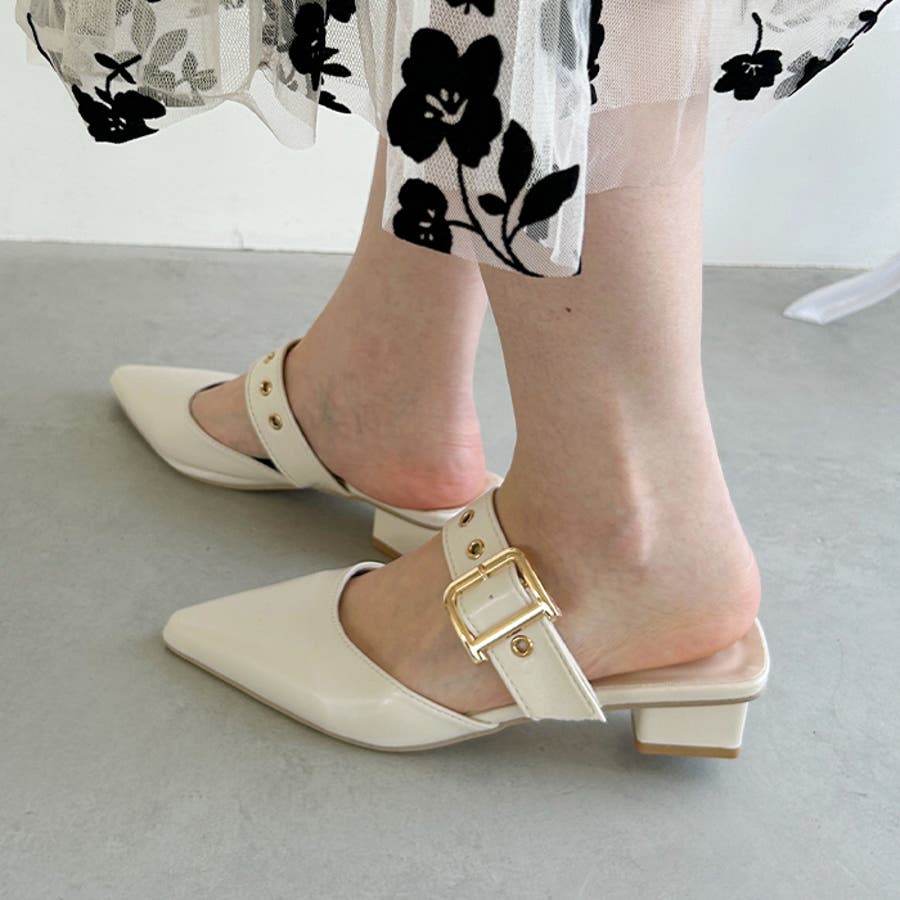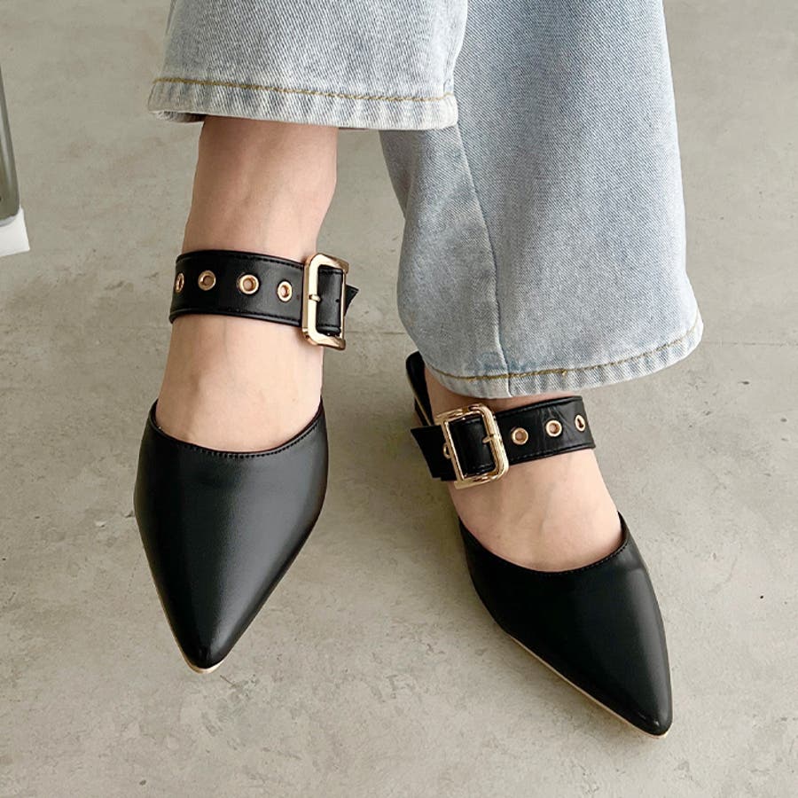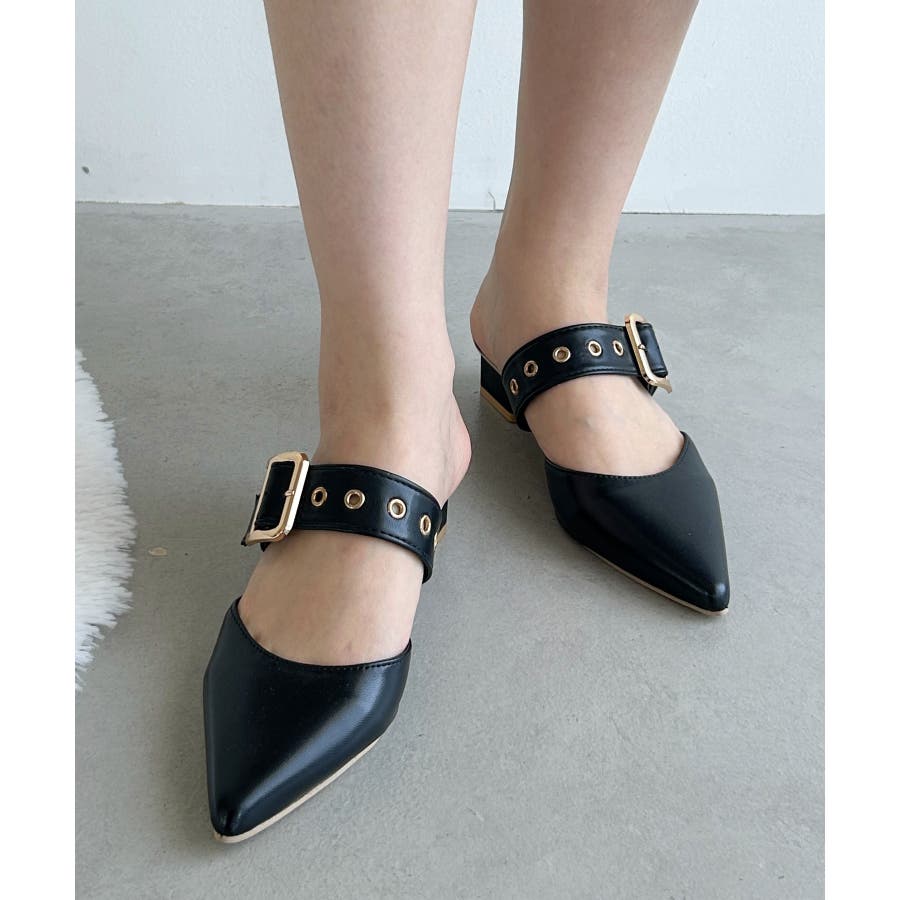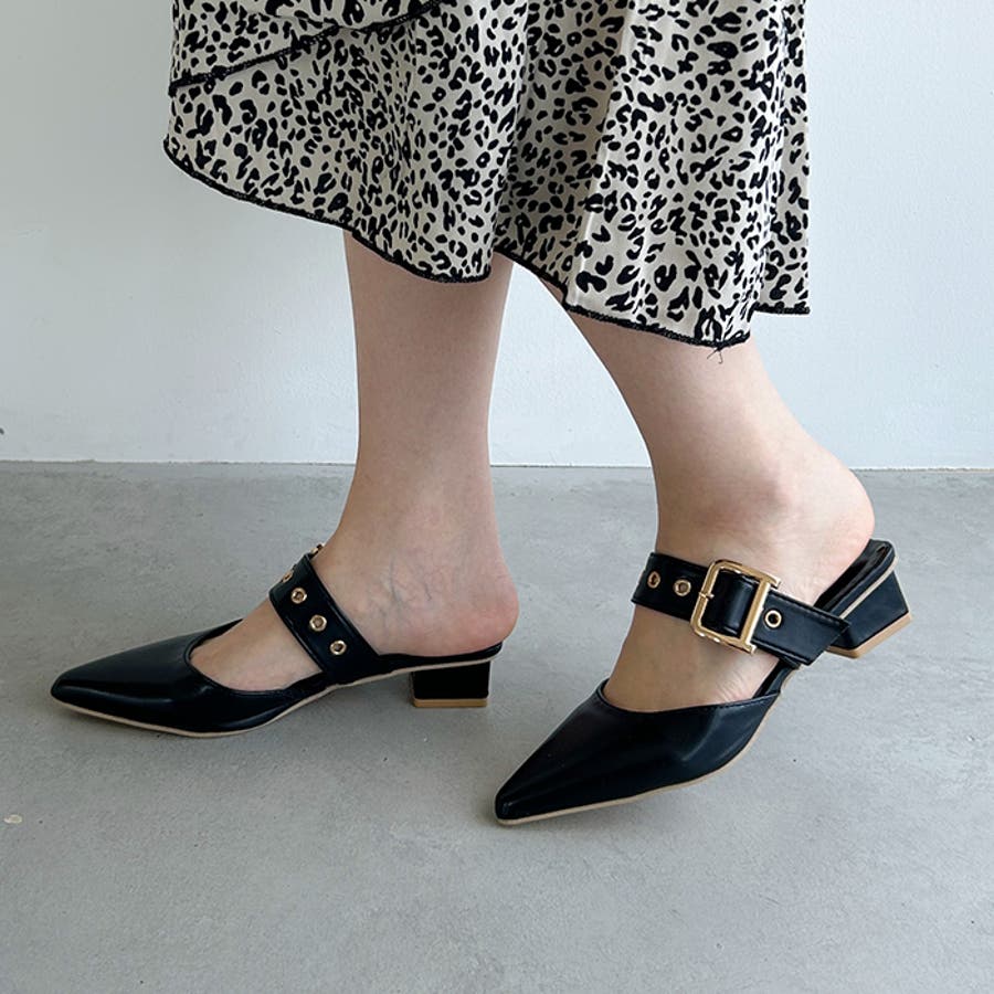 存在感のある太幅のベルトを大胆に添えた、ファッション性の高いモダンな印象のミュール。