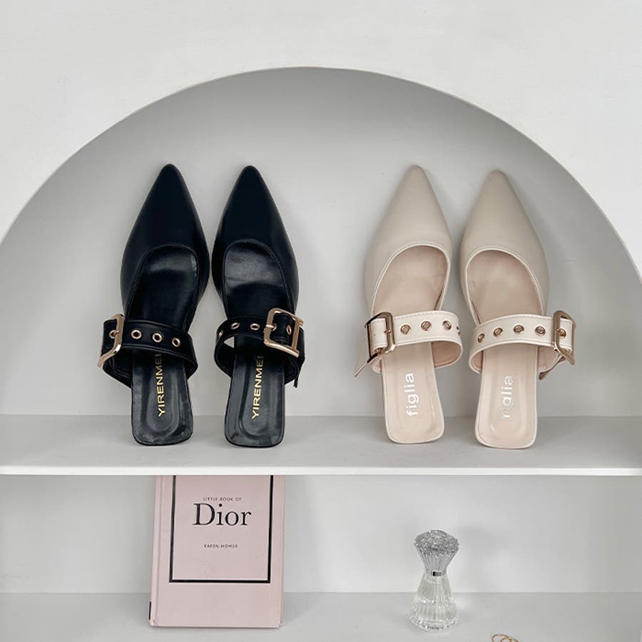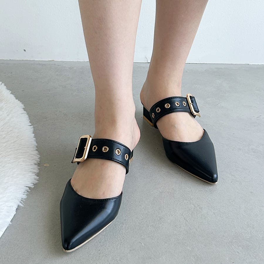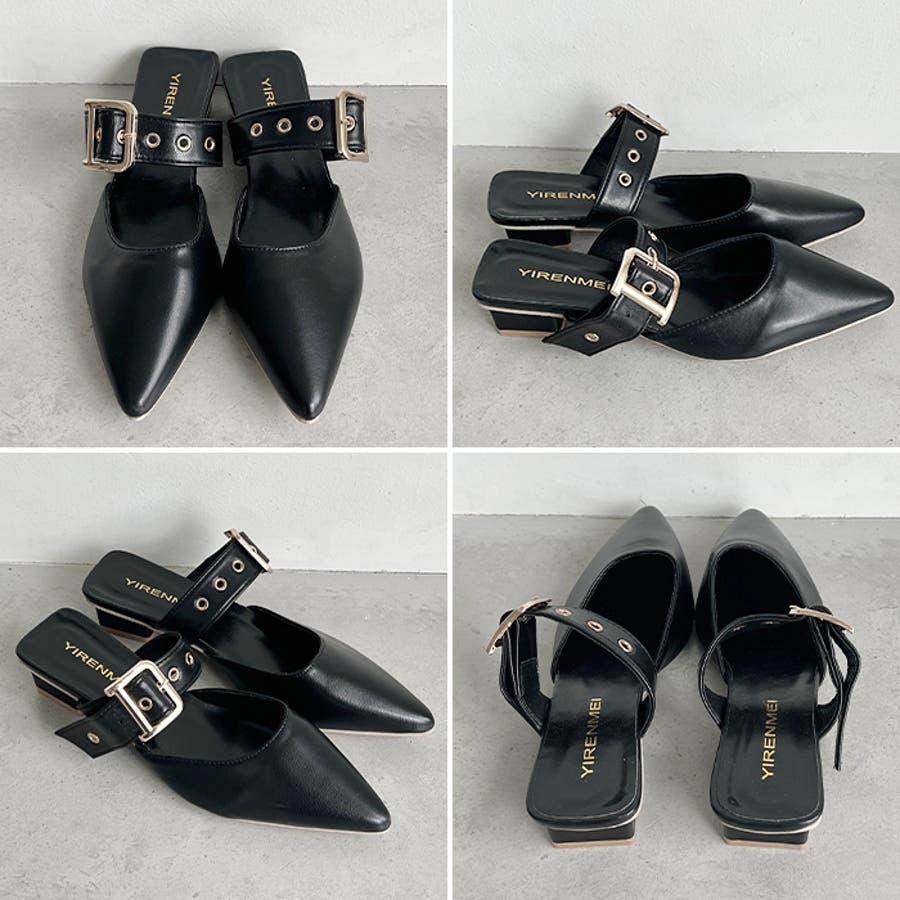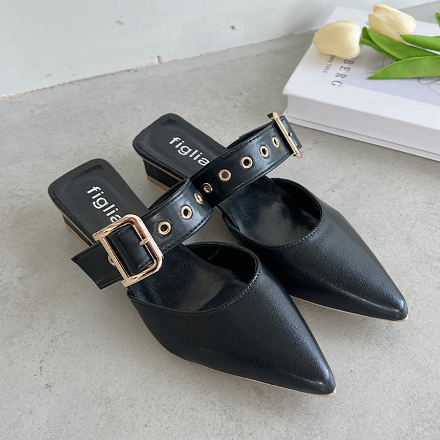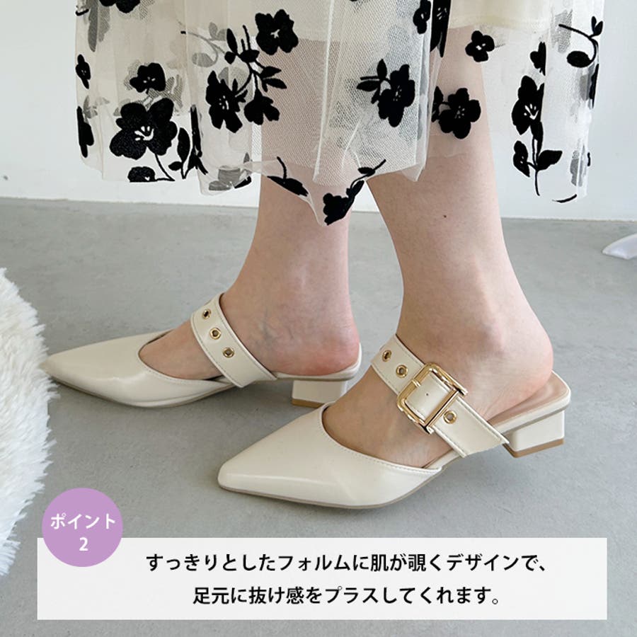 存在感のある太幅のベルトを大胆に添えた、ファッション性の高いモダンな印象のミュール。