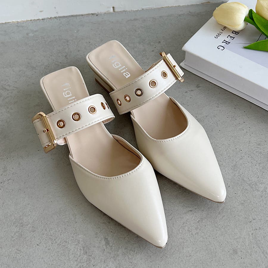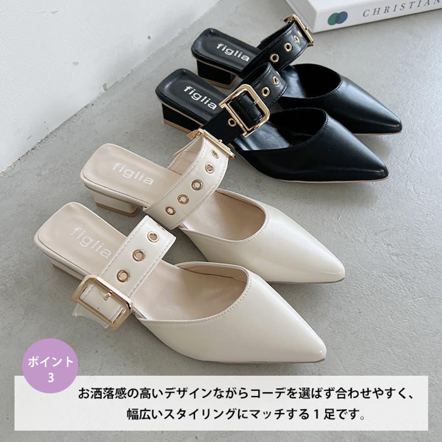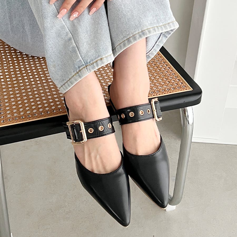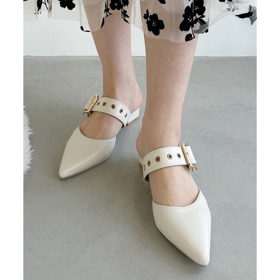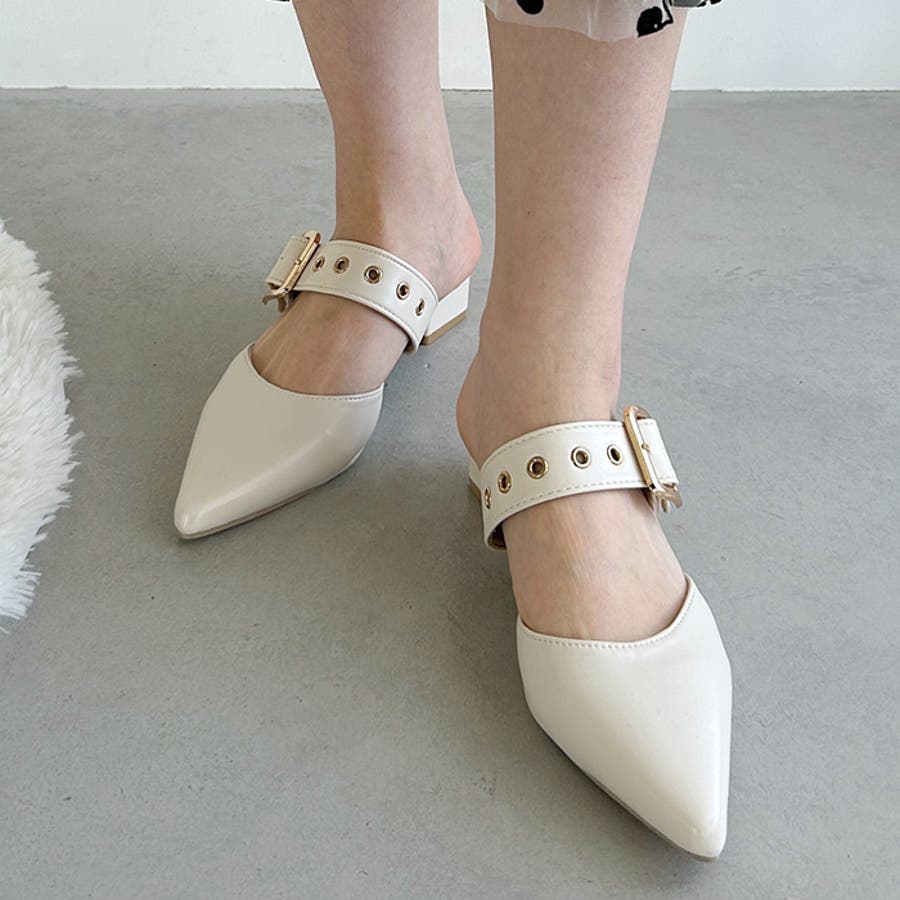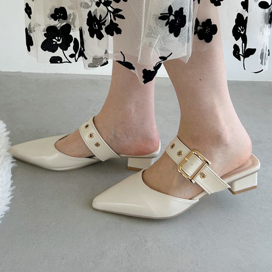 存在感のある太幅のベルトを大胆に添えた、ファッション性の高いモダンな印象のミュール。