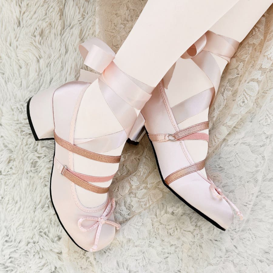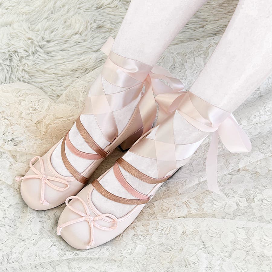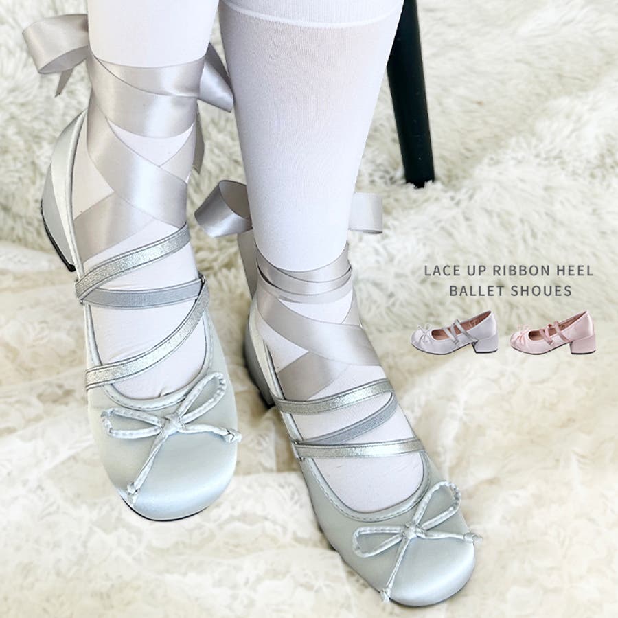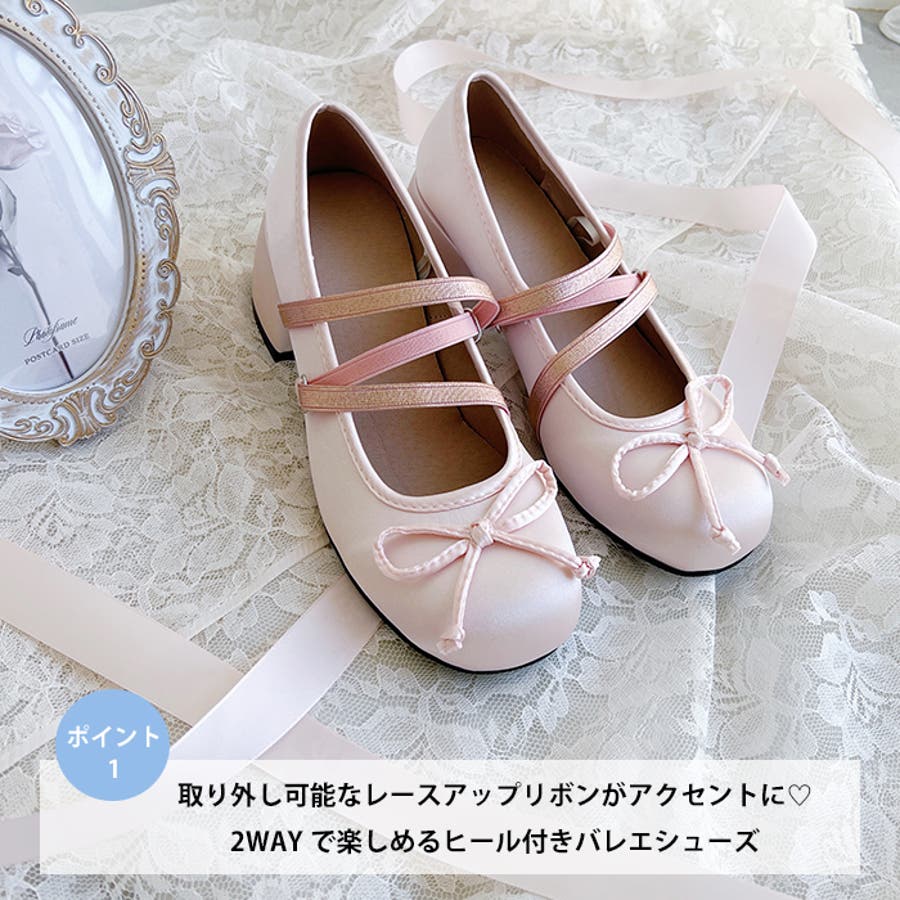 トレンドライクなレースアップリボンがポイントの、ヒール付きバレエシューズ♪