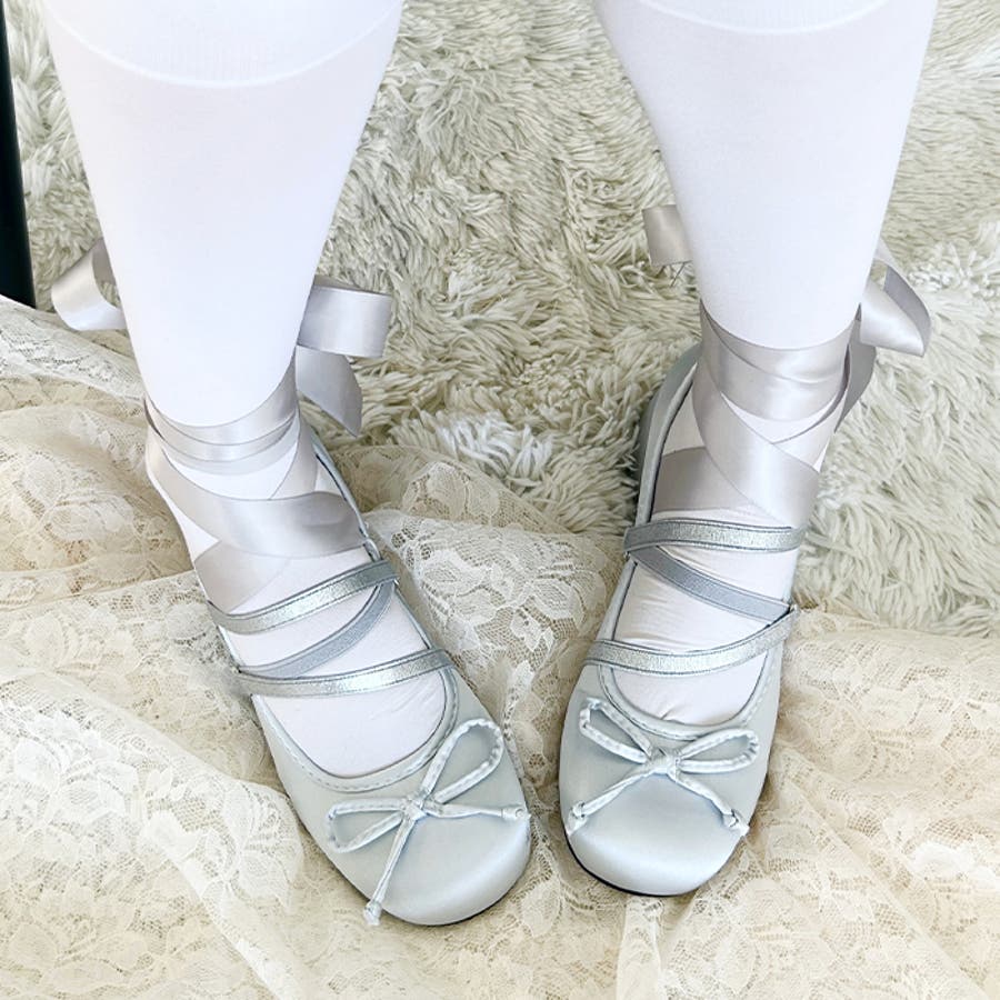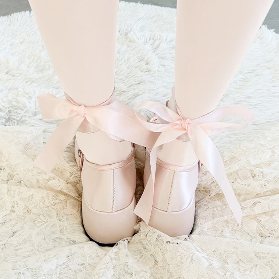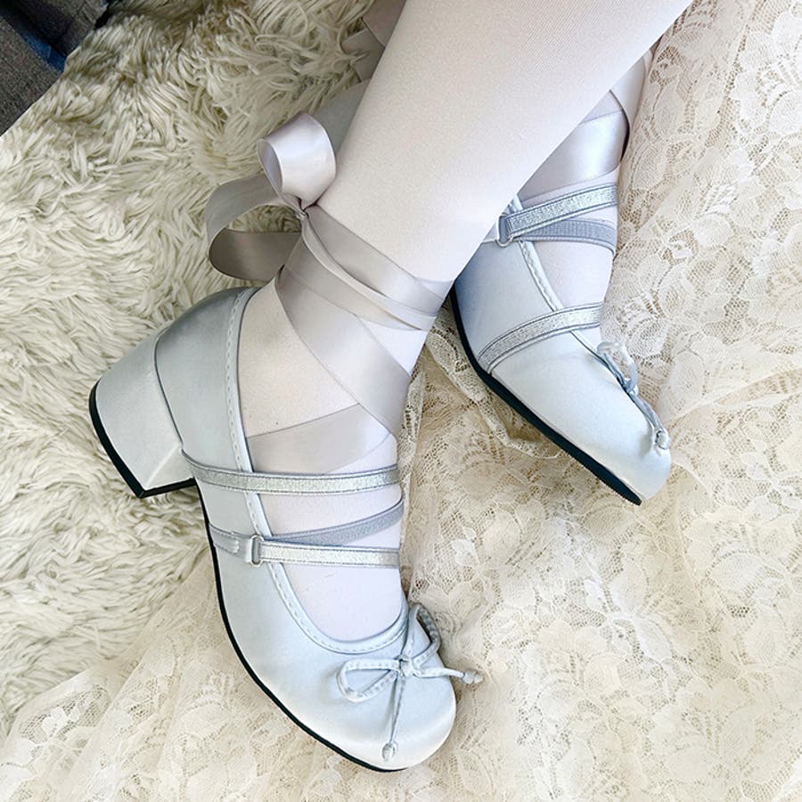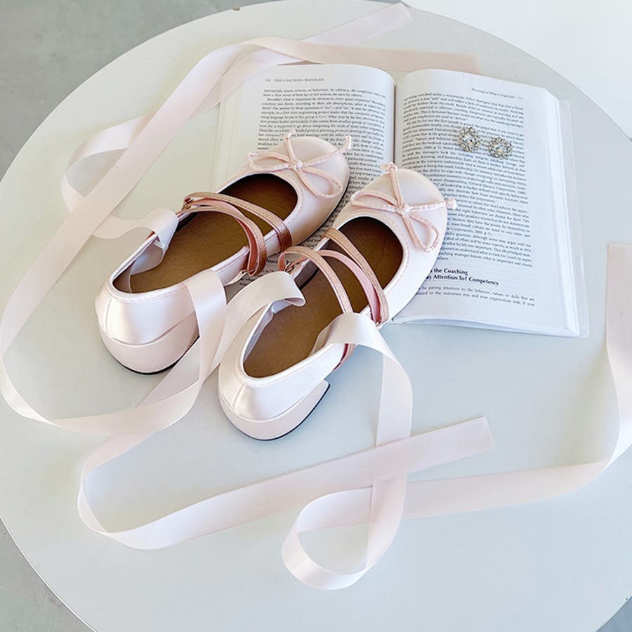 トレンドライクなレースアップリボンがポイントの、ヒール付きバレエシューズ♪