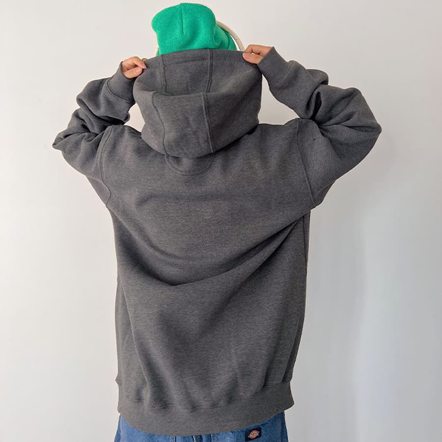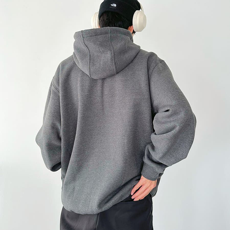 ドロップショルダーに程よい身幅のビッグシルエット、たるみのあるボリュームスリーブ、風を通さないようしっかりしたリブ袖、ベーシックなドローコード付きフードは生地が厚いので形も綺麗。大き