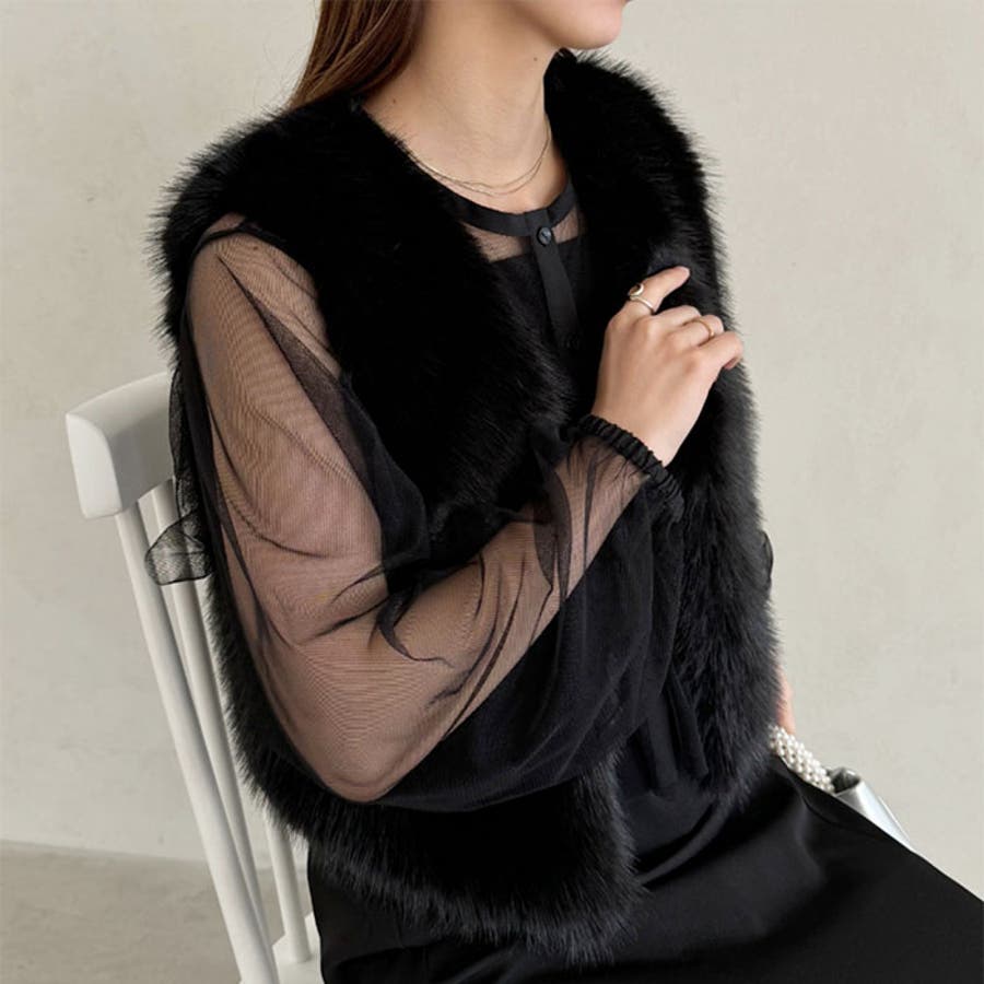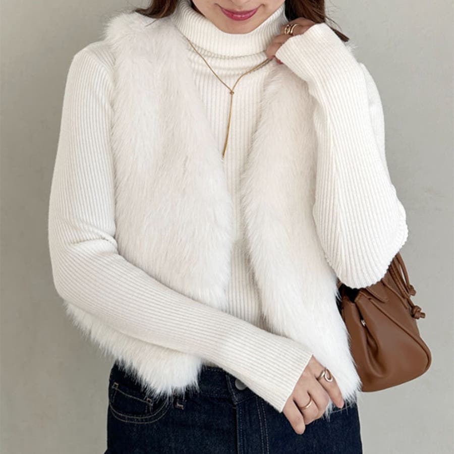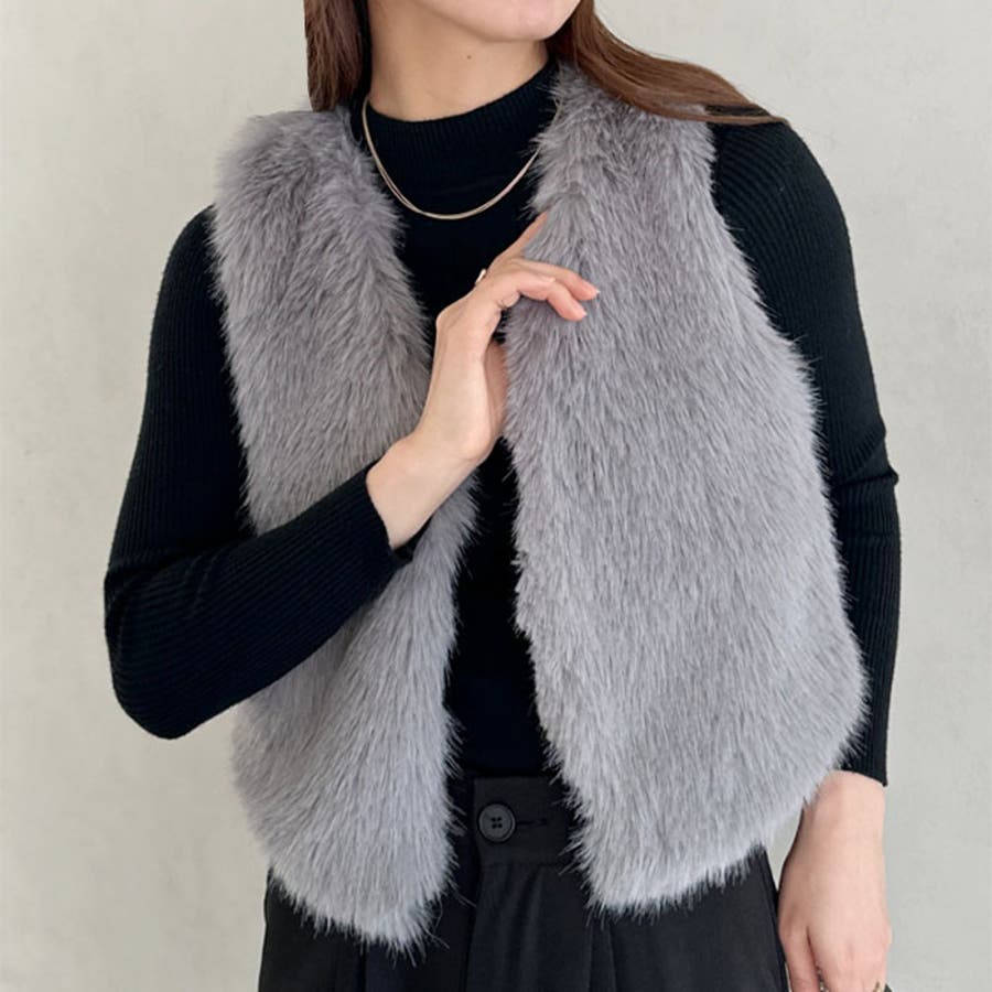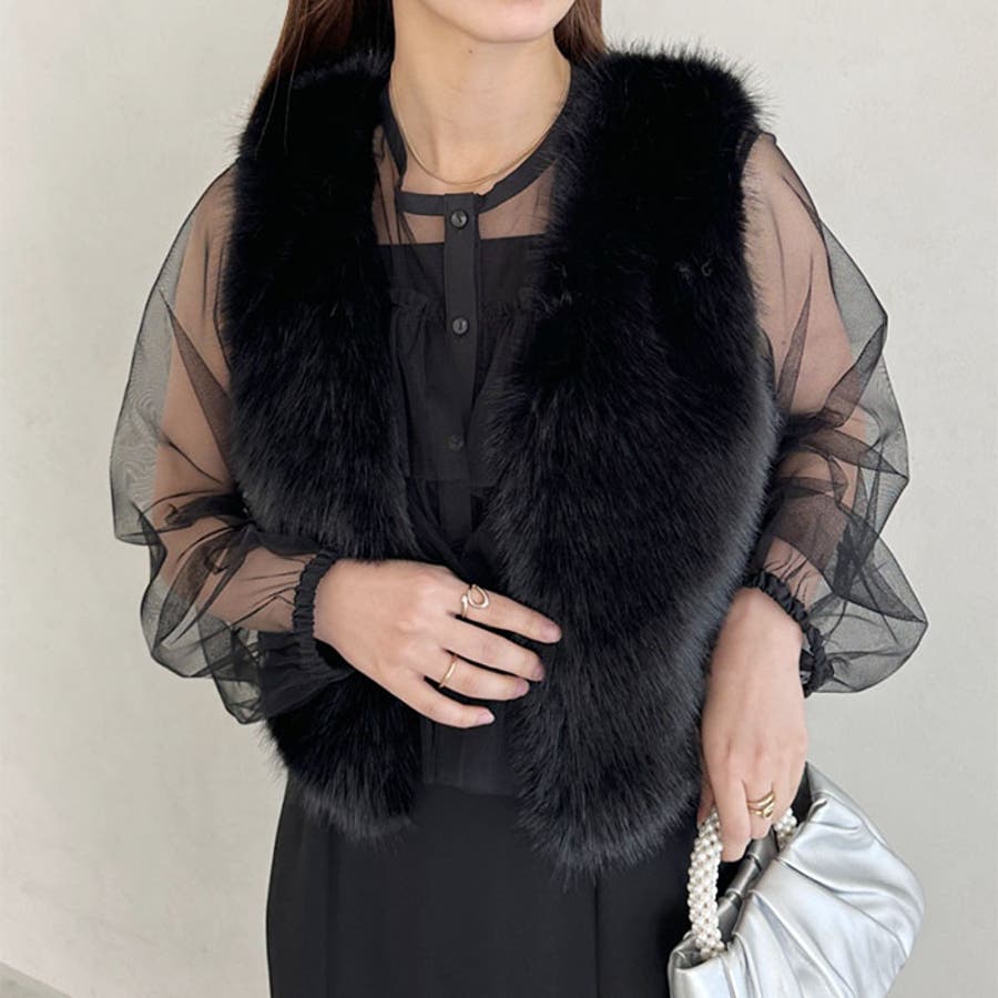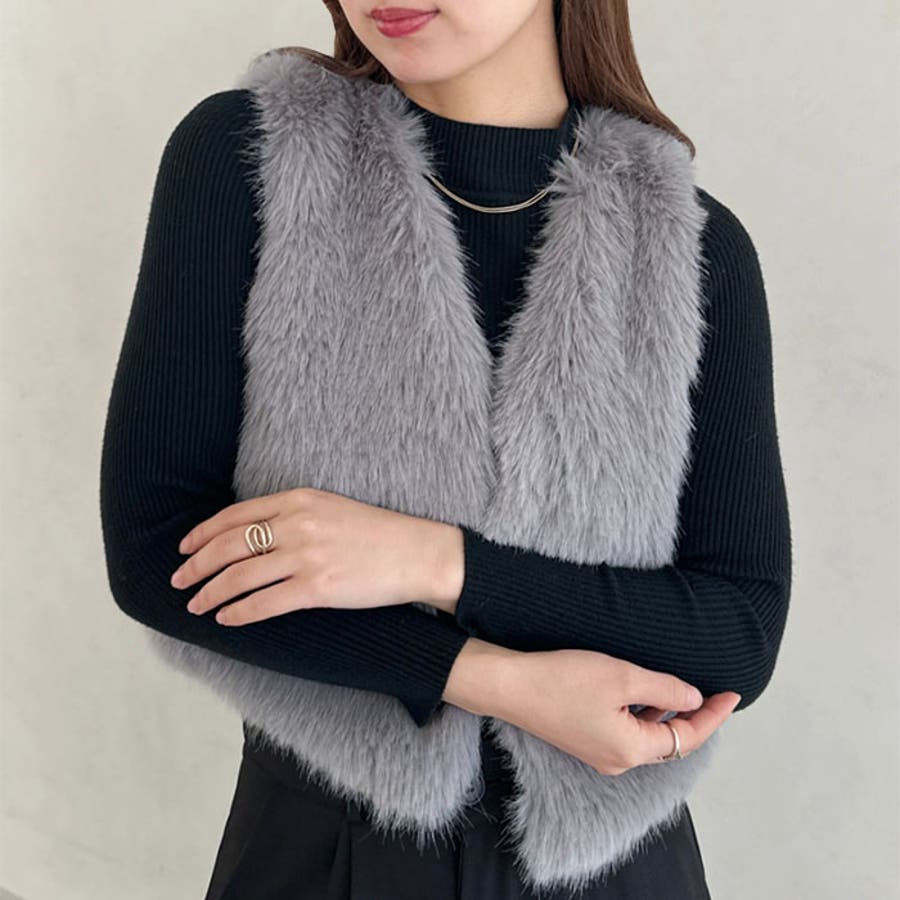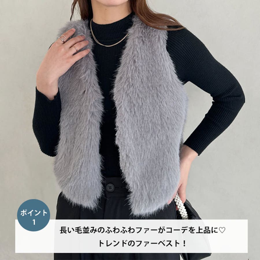 長い毛並みのふわふわファーがコーデを上品に仕上げてくれます。
