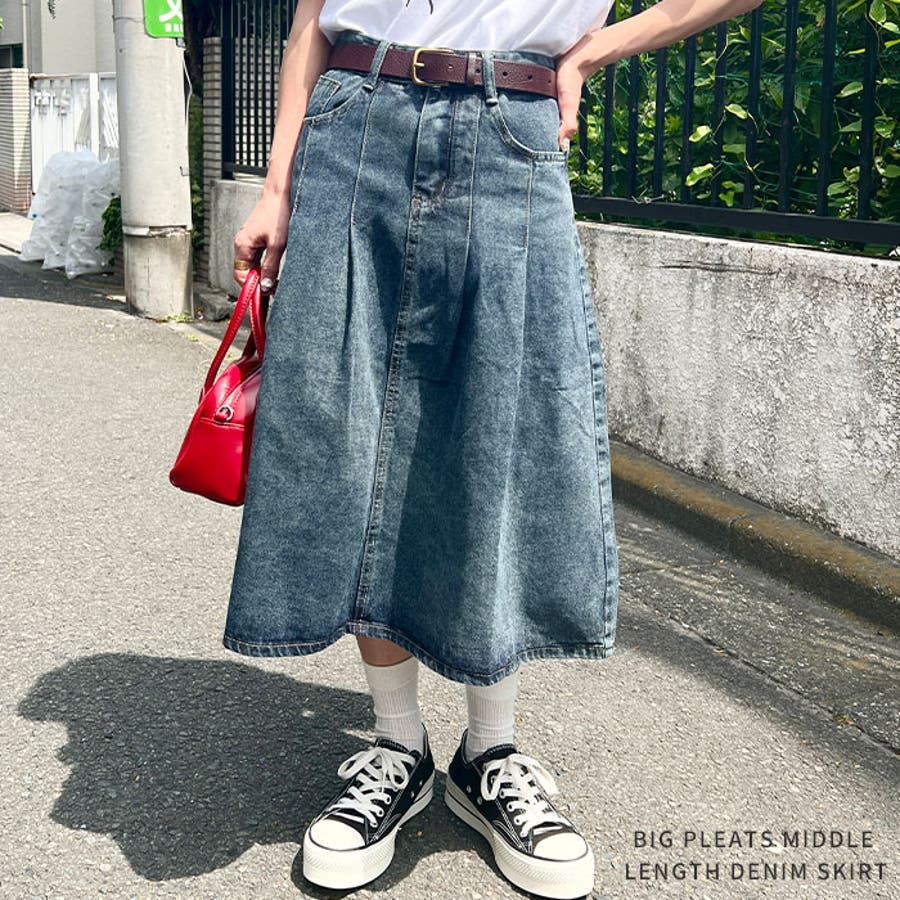 ビッグプリーツミドル丈デニムスカート