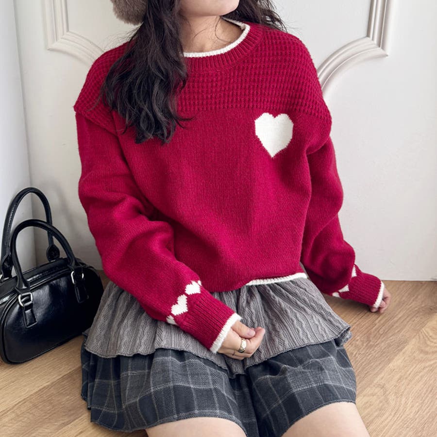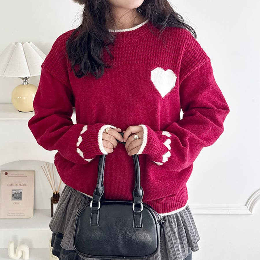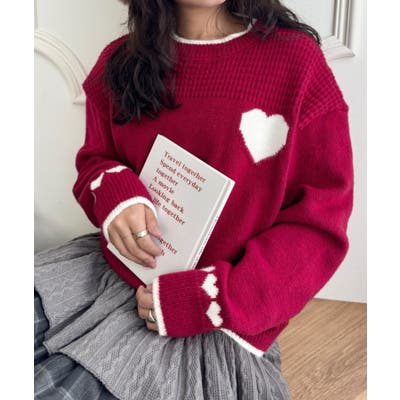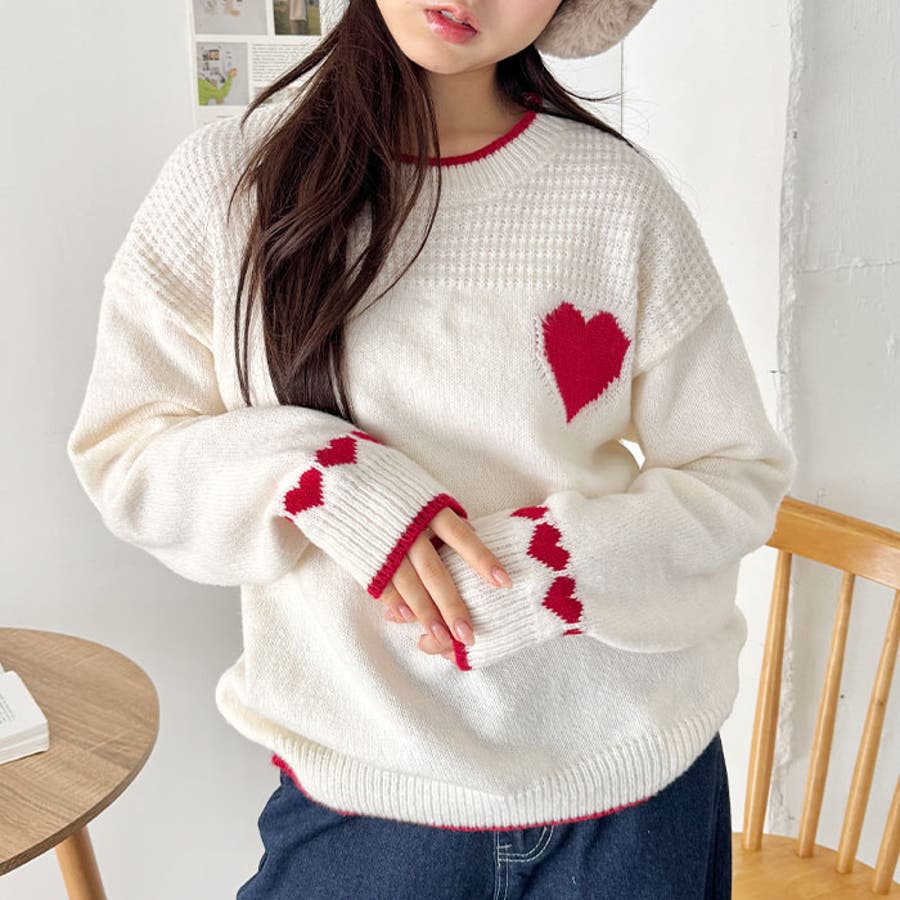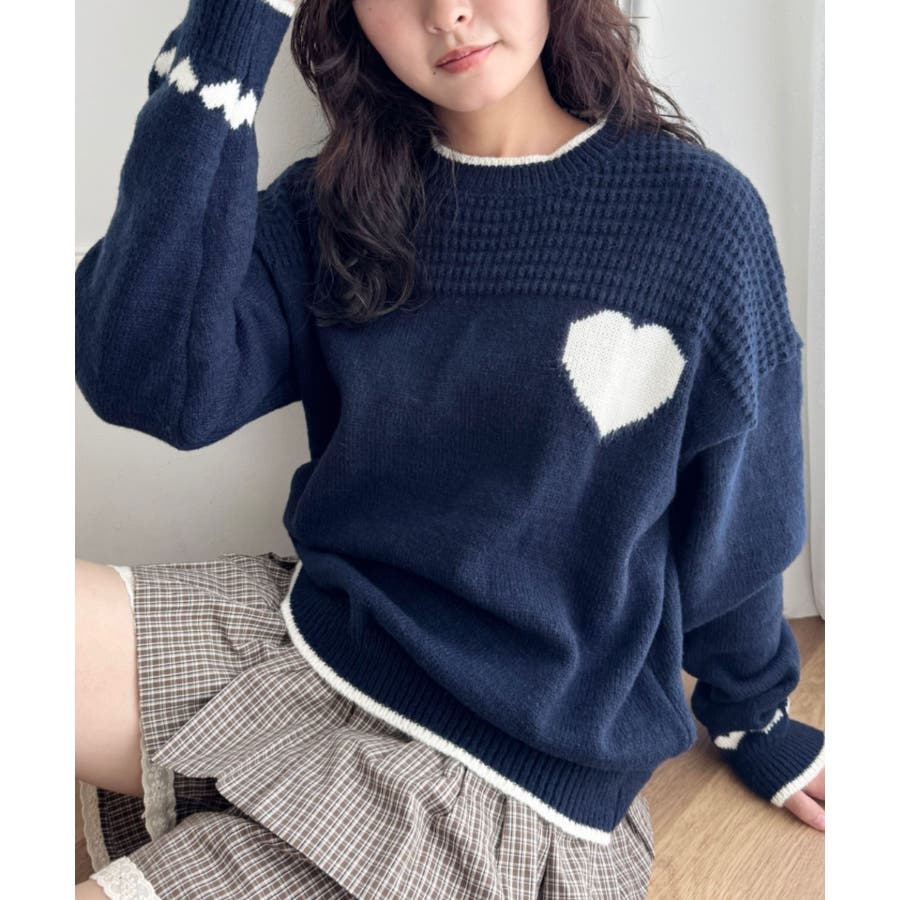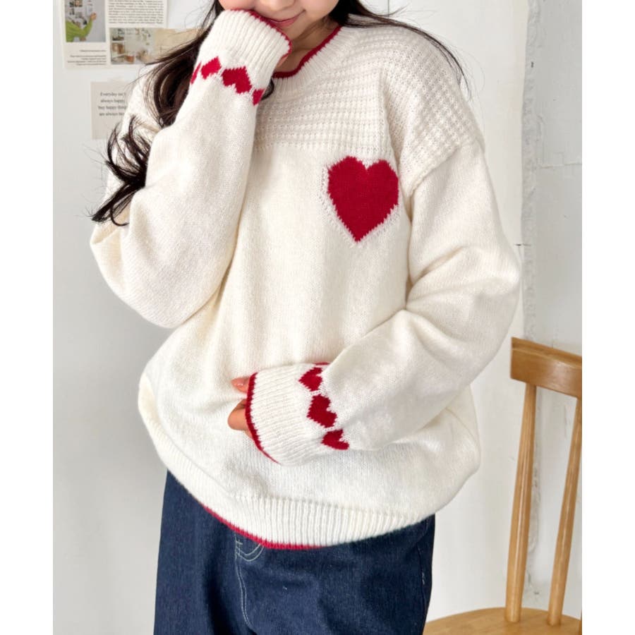 ・胸元と袖のハートモチーフが目を惹くニットトップス