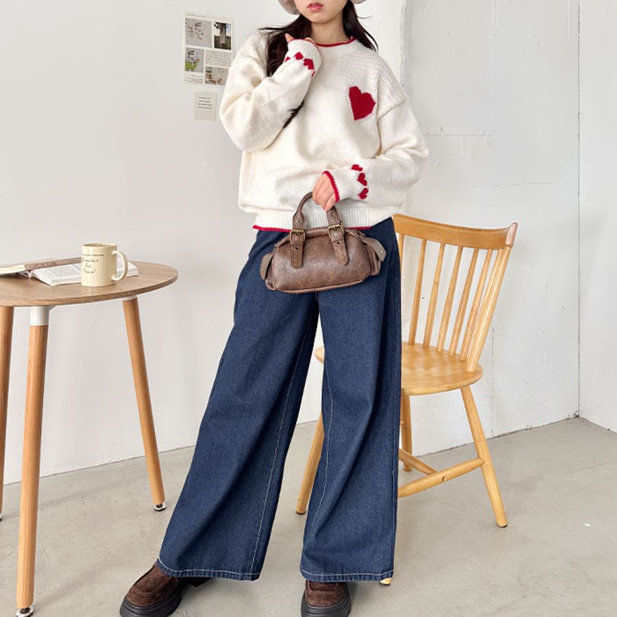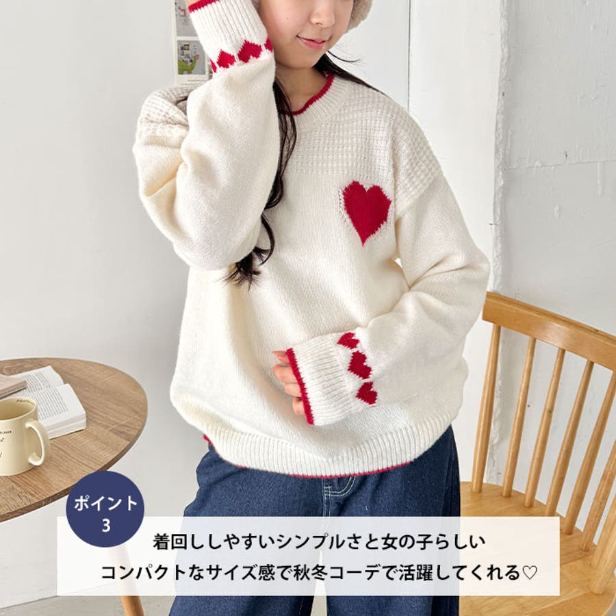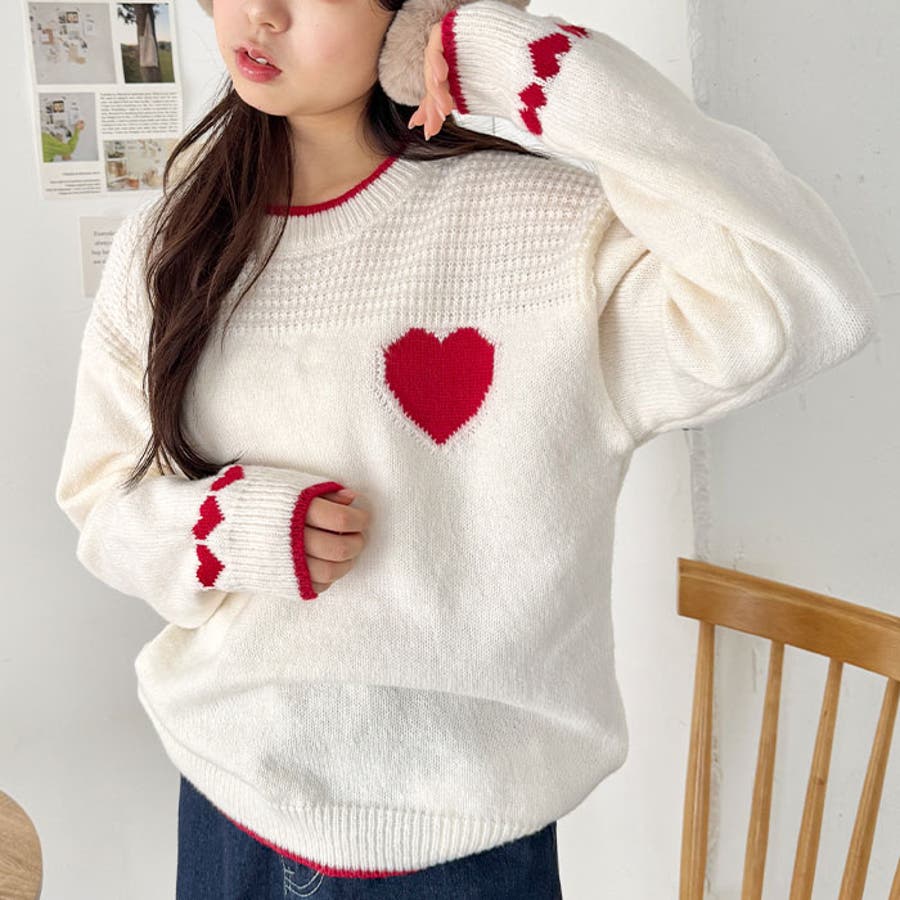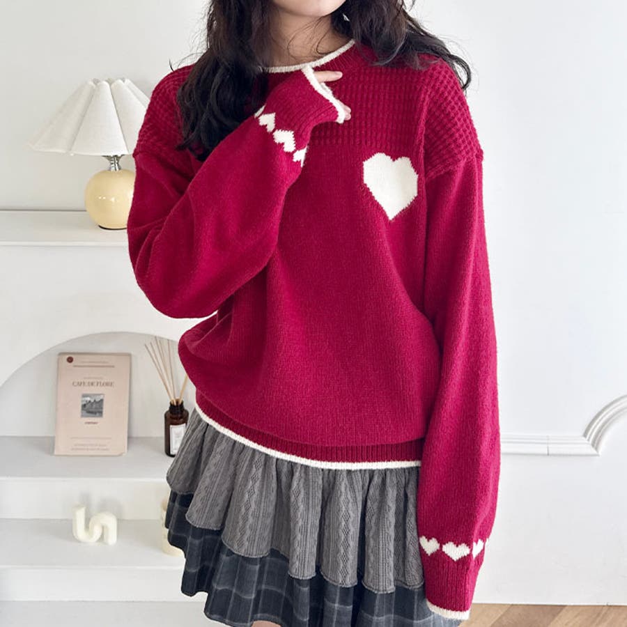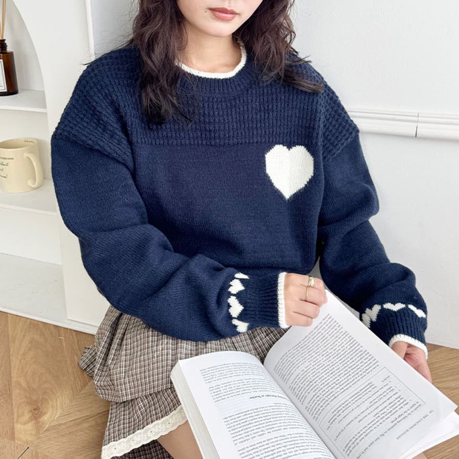 ・胸元と袖のハートモチーフが目を惹くニットトップス