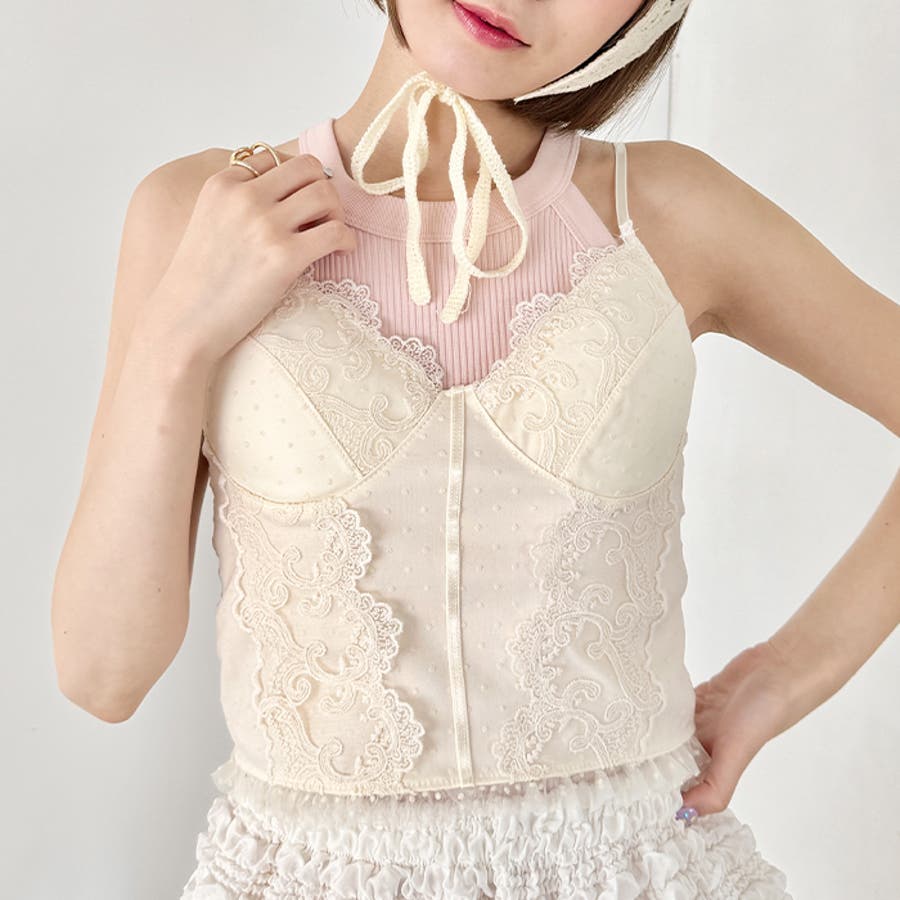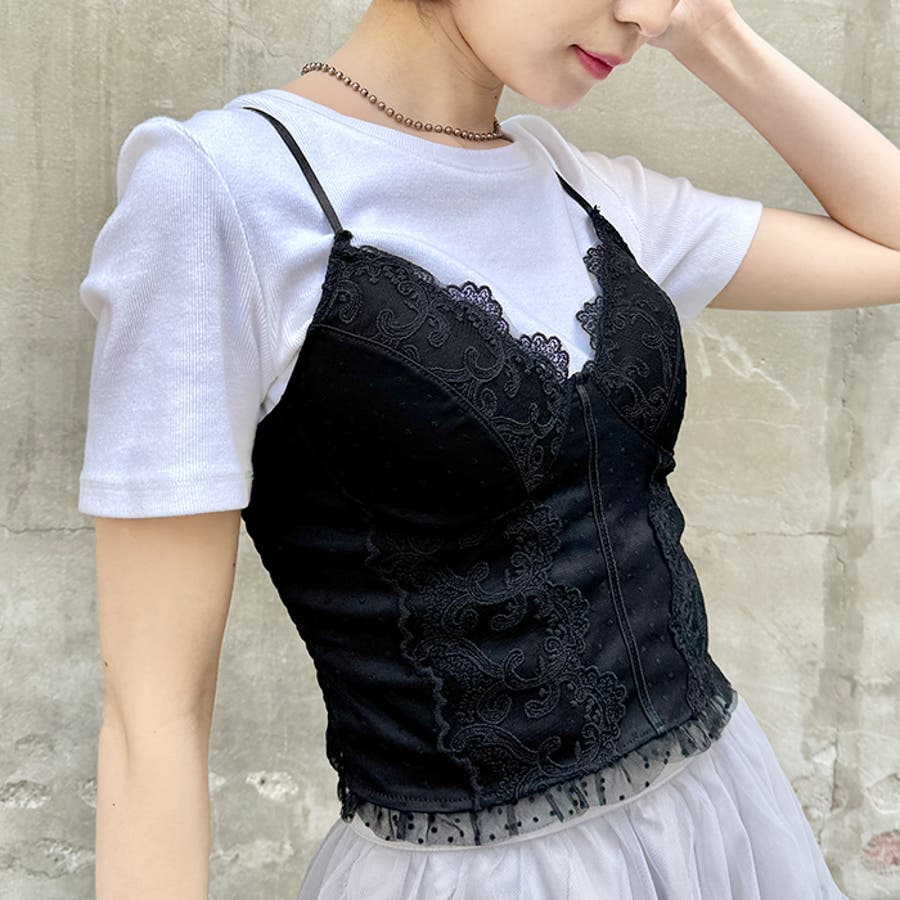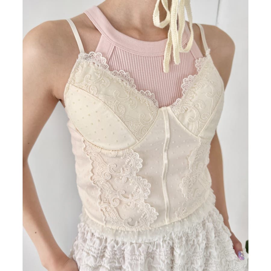 デザイン性の高いキャミソールなので、中にインナーを合わせたビスチェ風のスタイリングも!