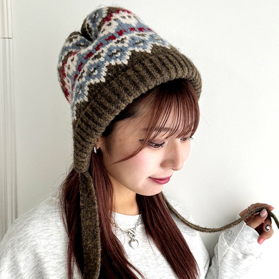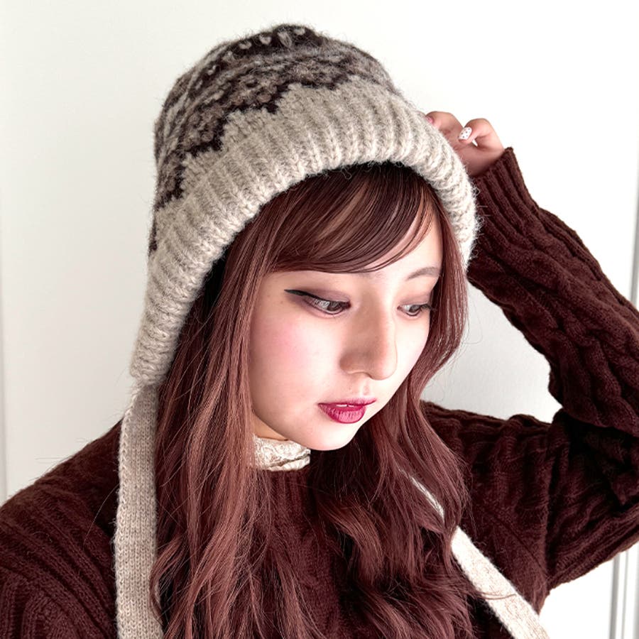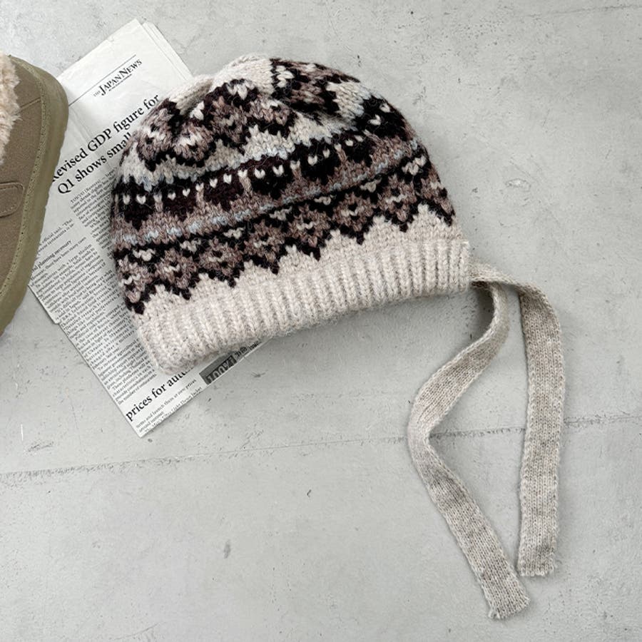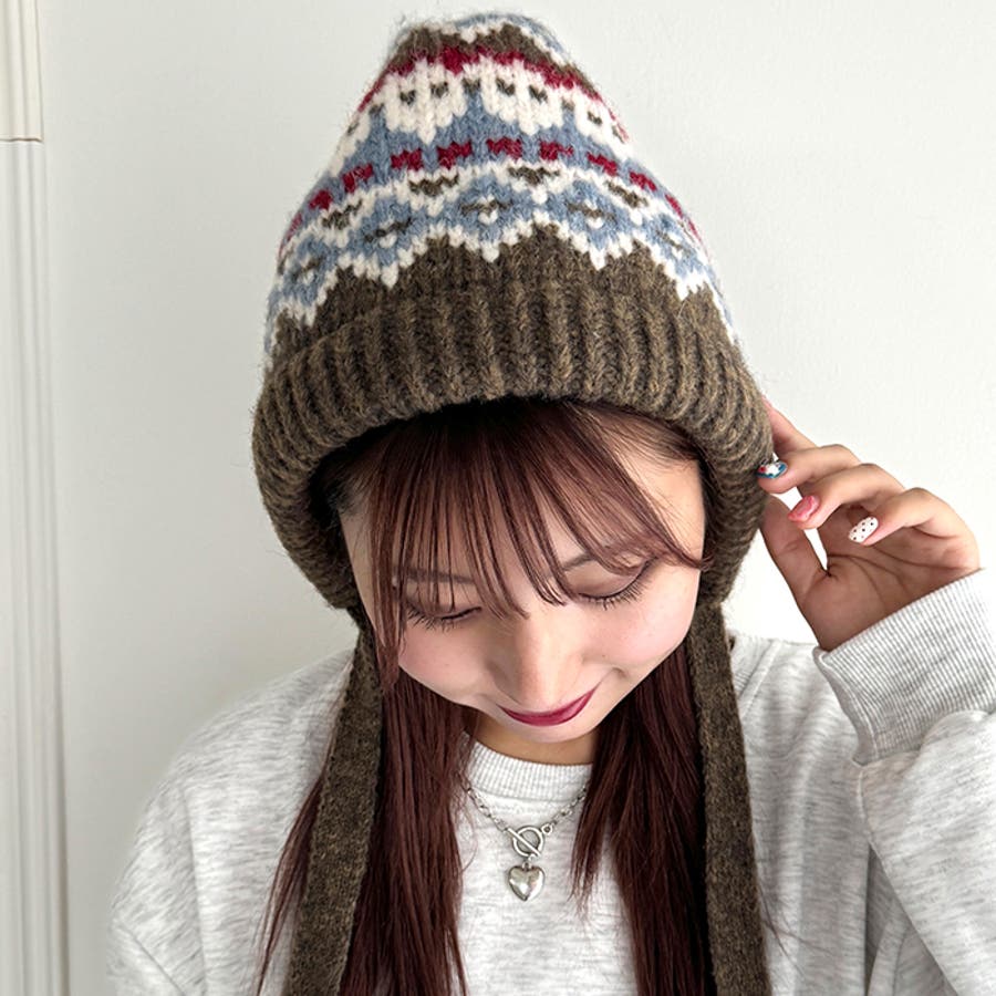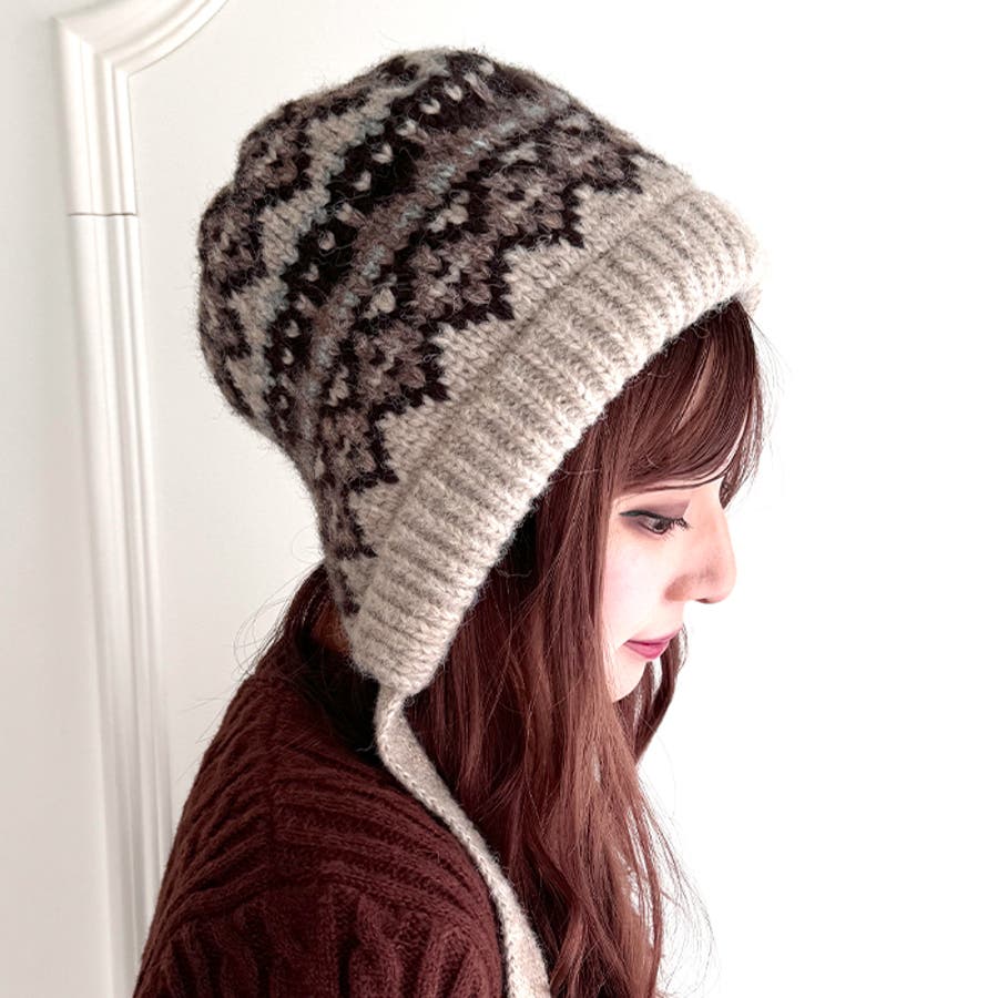 ・やさしい色合いのノルディック柄のイヤーフラップニットキャップ