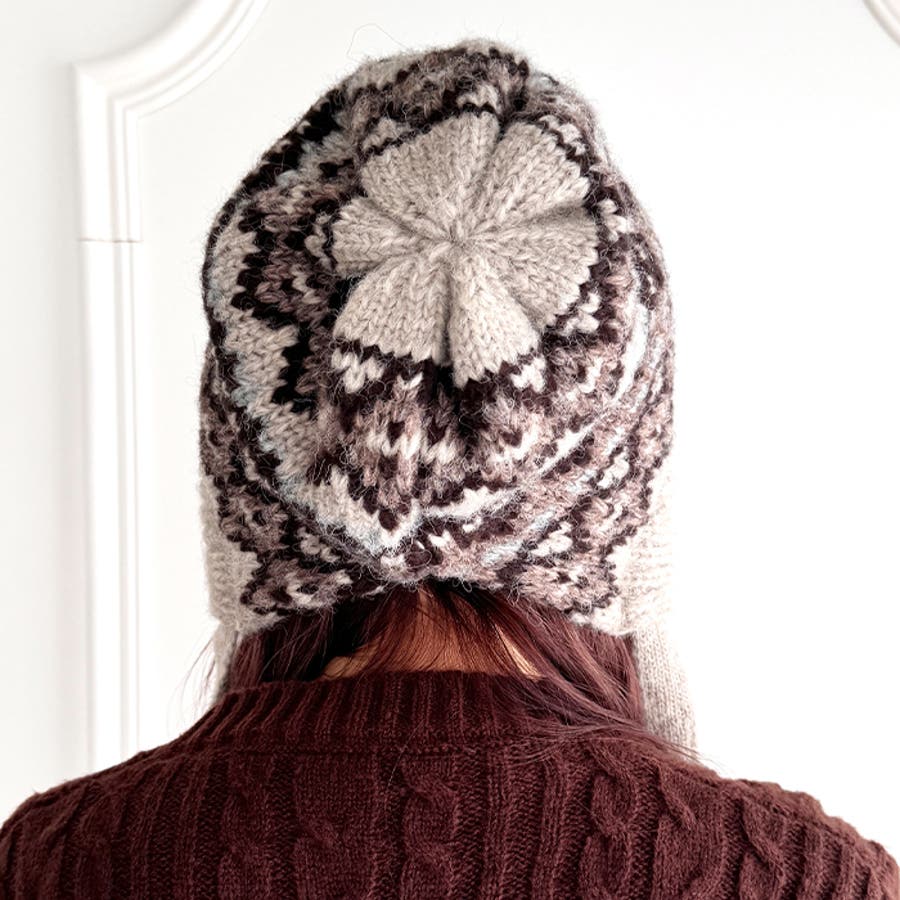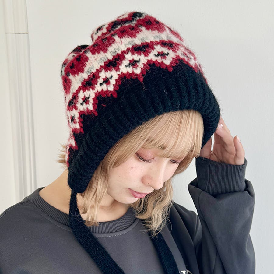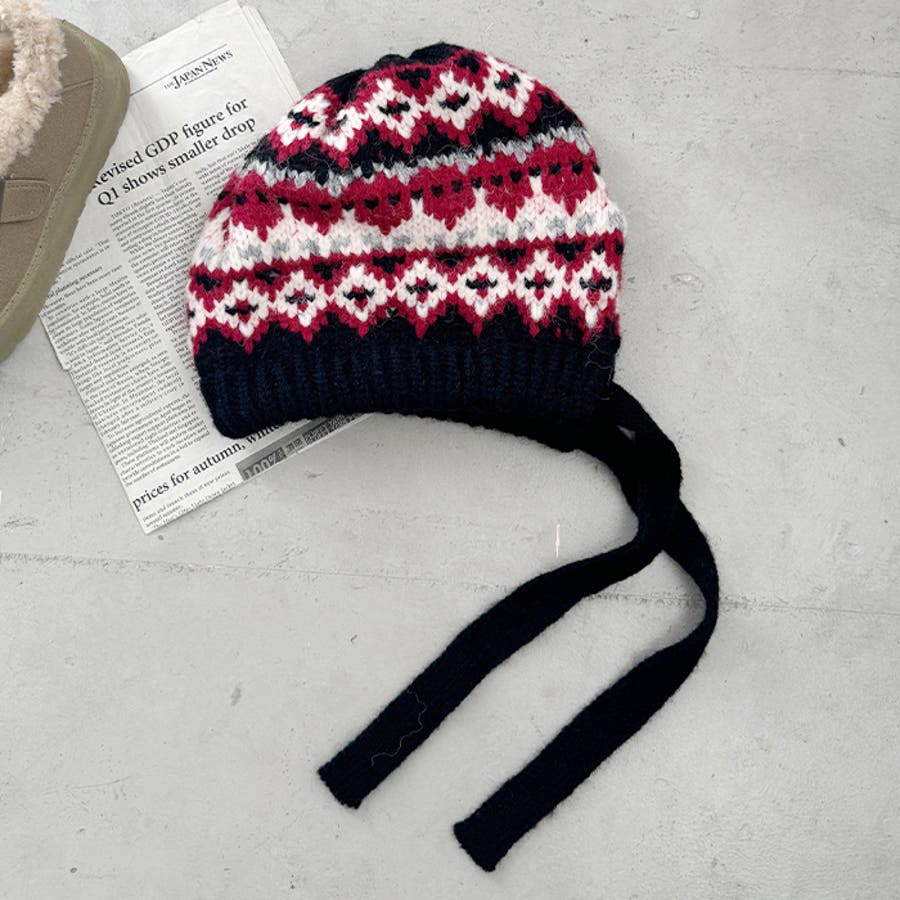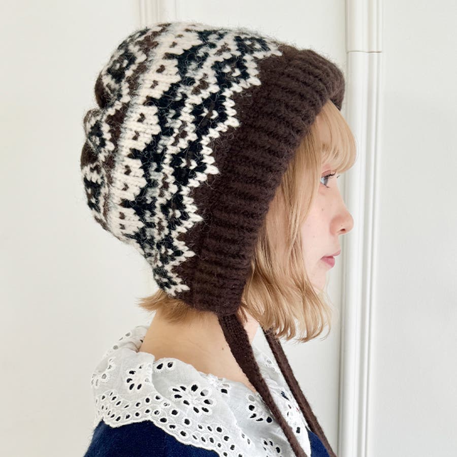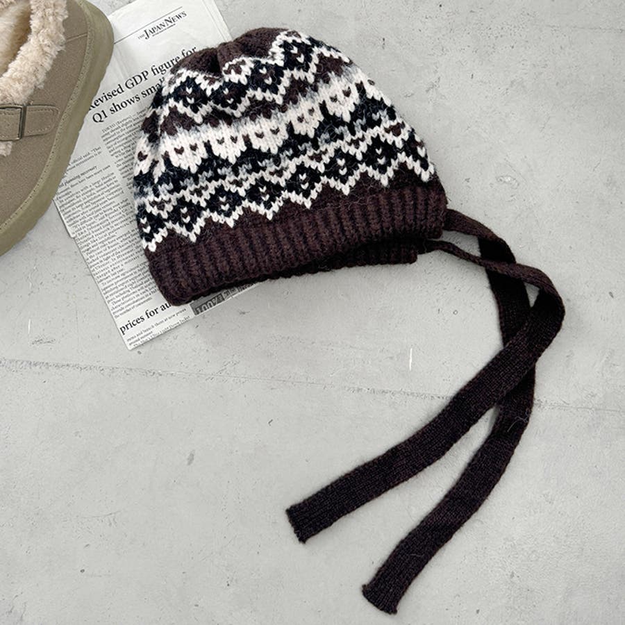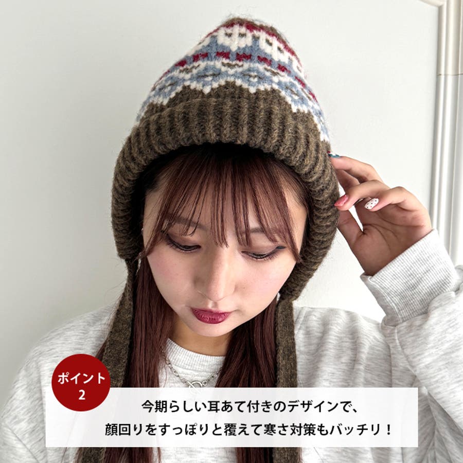 ・やさしい色合いのノルディック柄のイヤーフラップニットキャップ