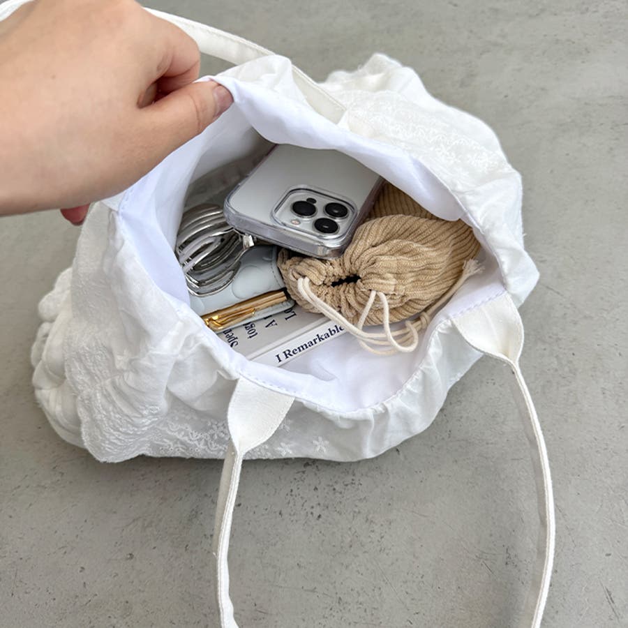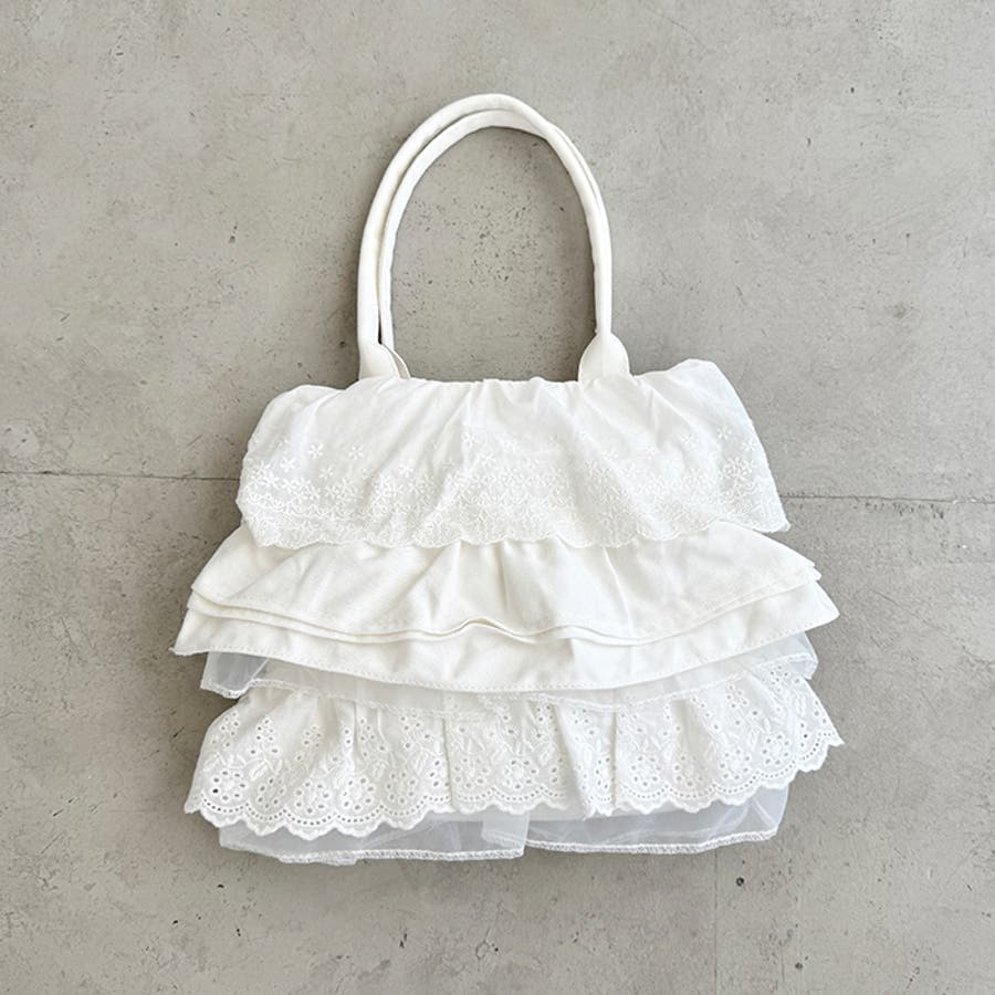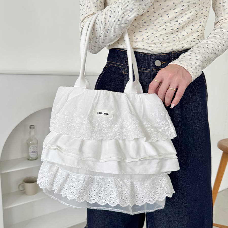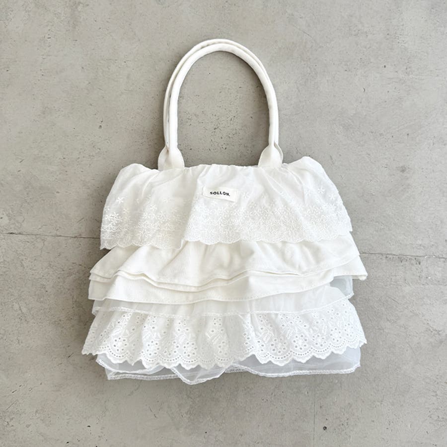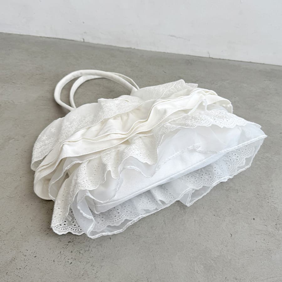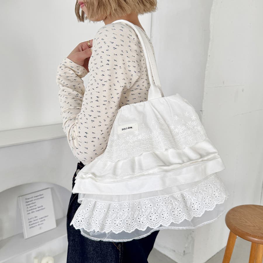 ・フラワーコットンレースやコットンフリルが贅沢に使われたトートバッグ