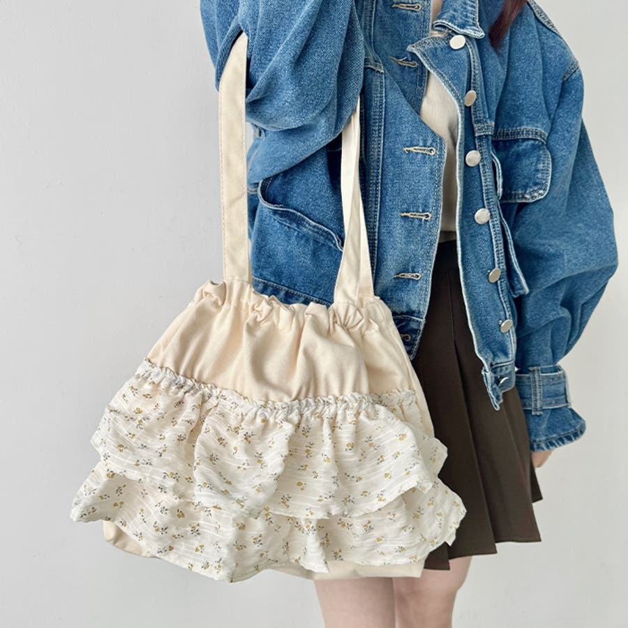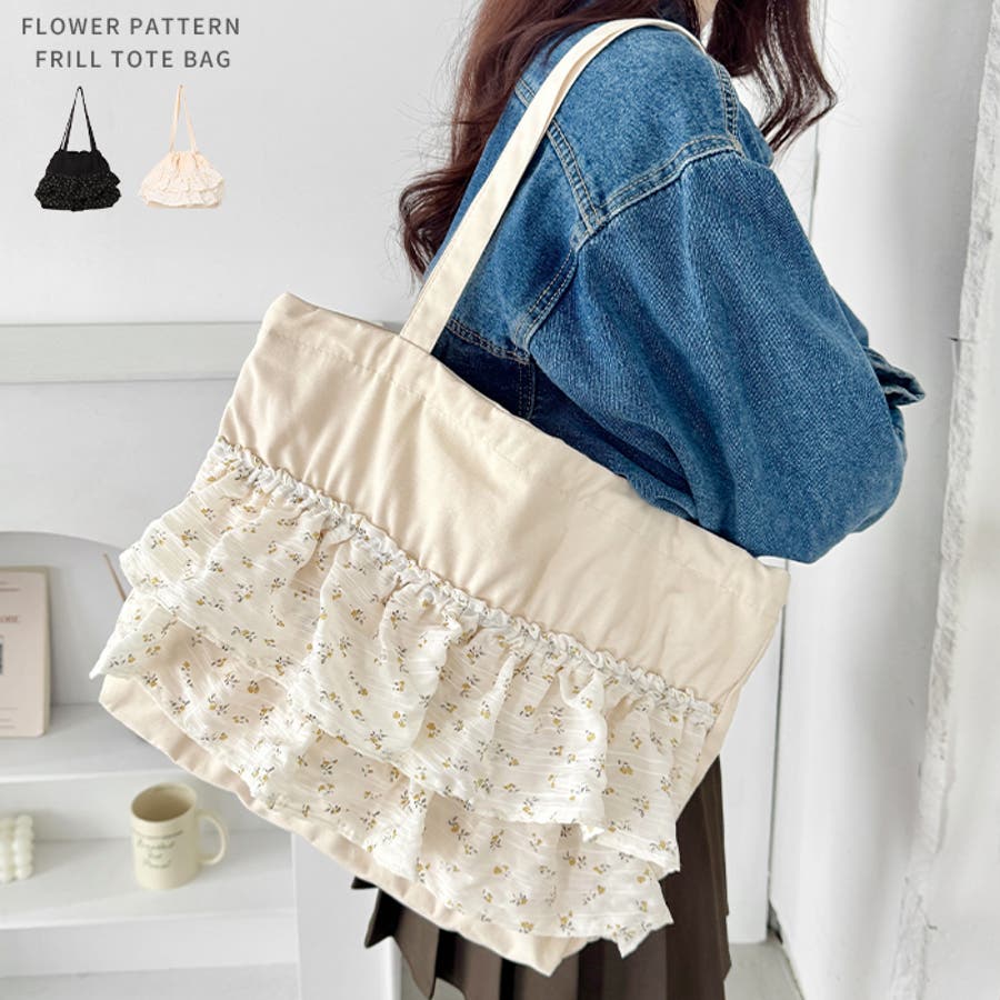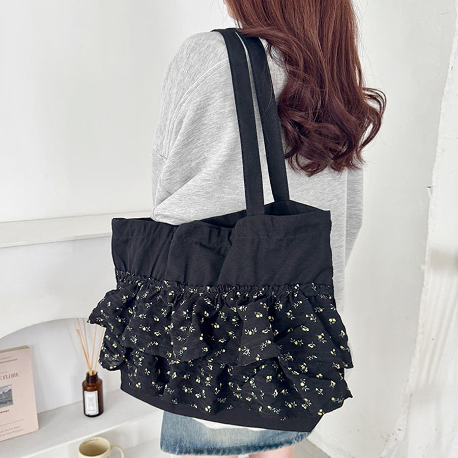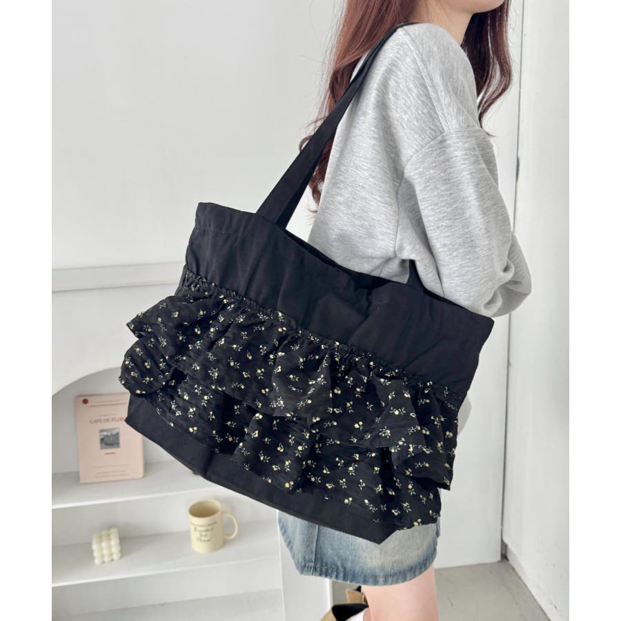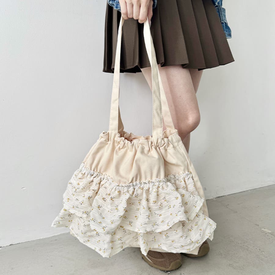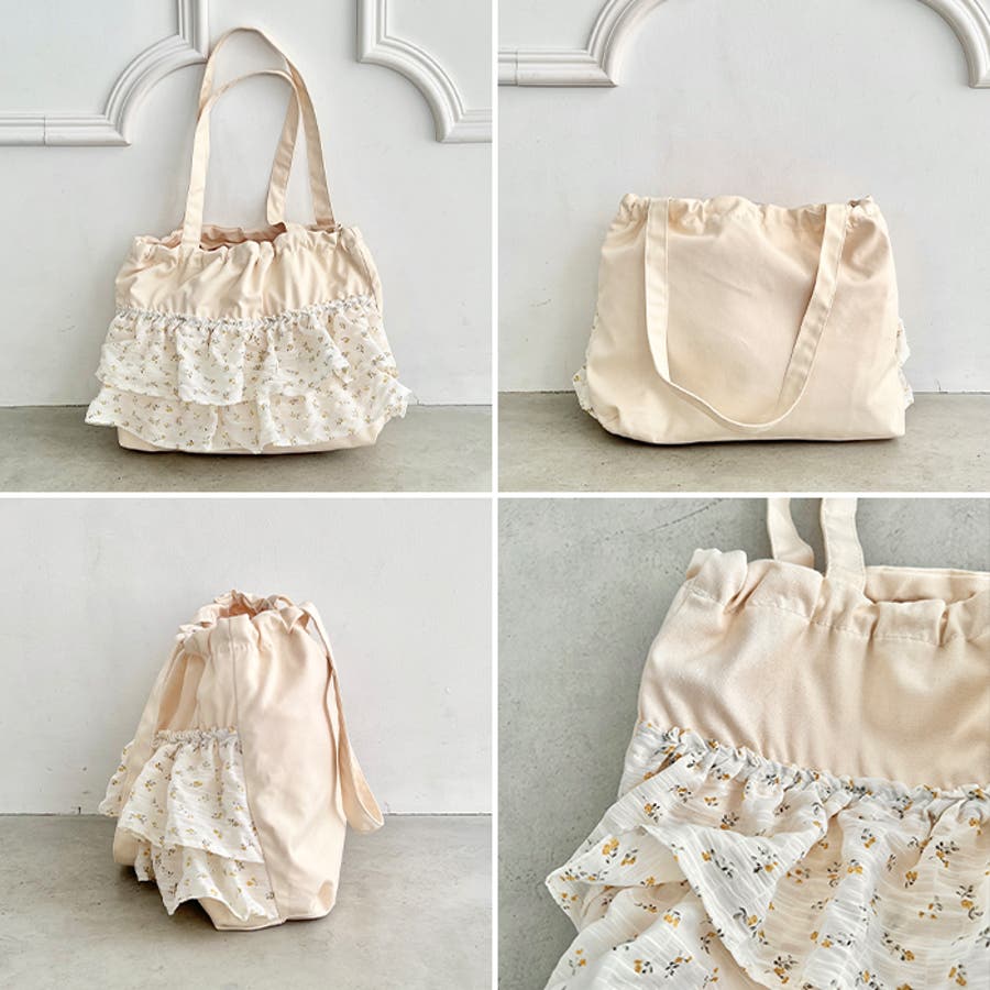・フラワー柄のフリルがドッキングされたキャンバスバッグ