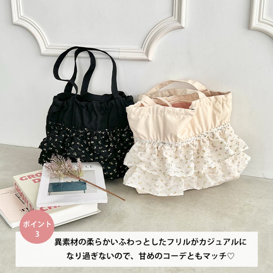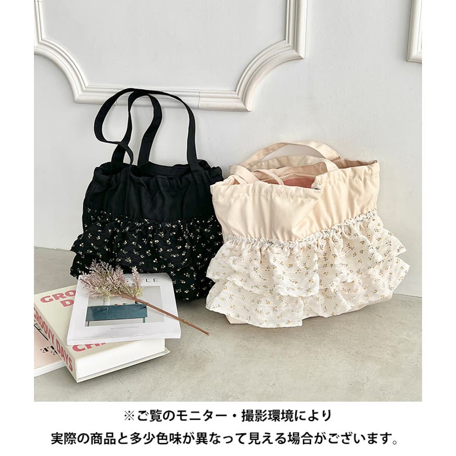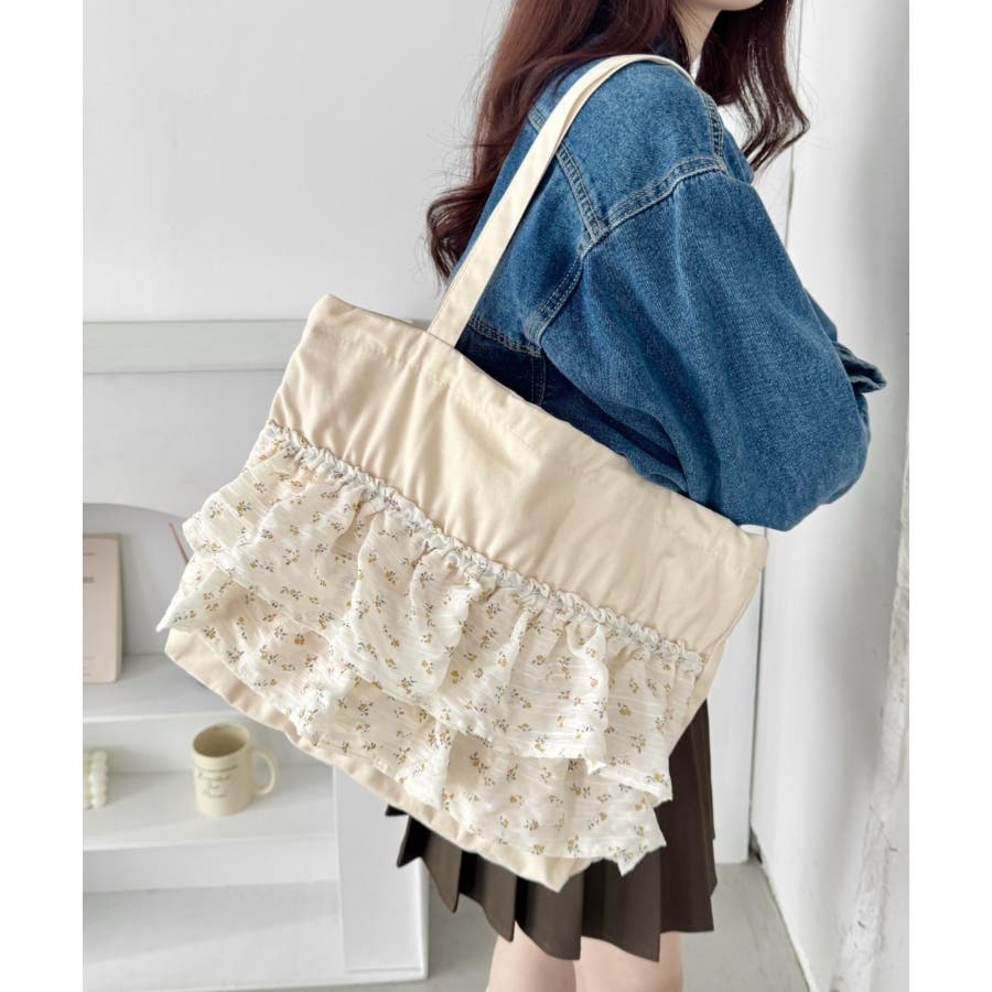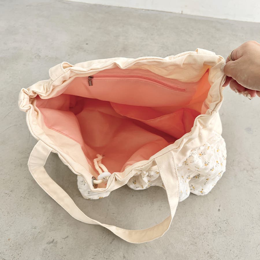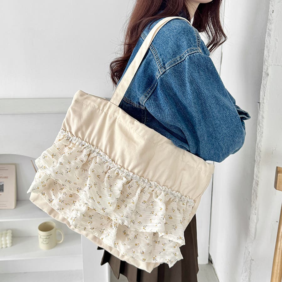 ・フラワー柄のフリルがドッキングされたキャンバスバッグ