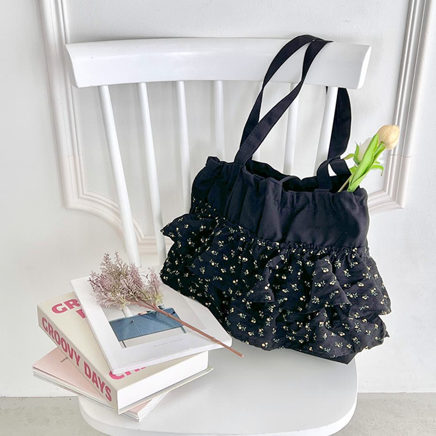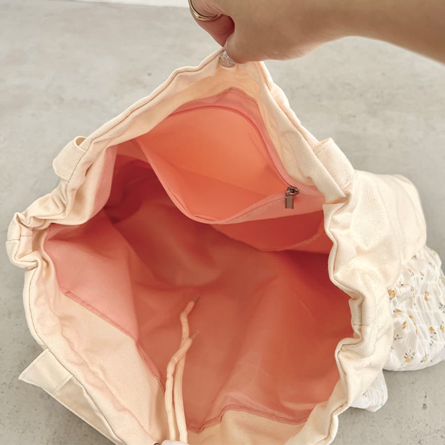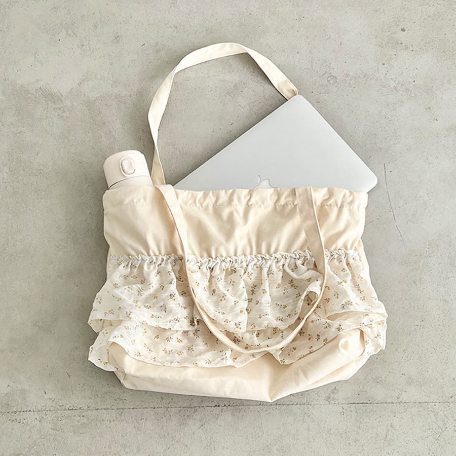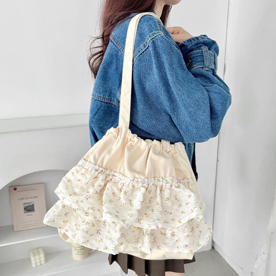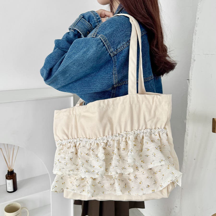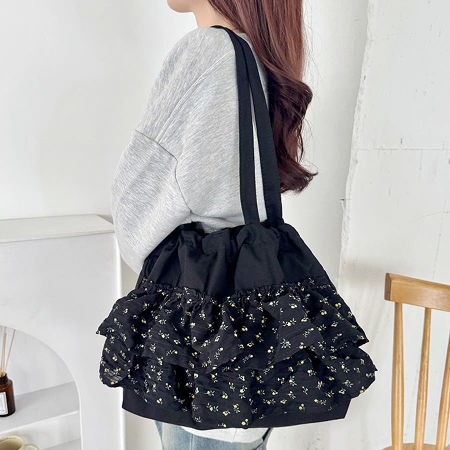 ・フラワー柄のフリルがドッキングされたキャンバスバッグ