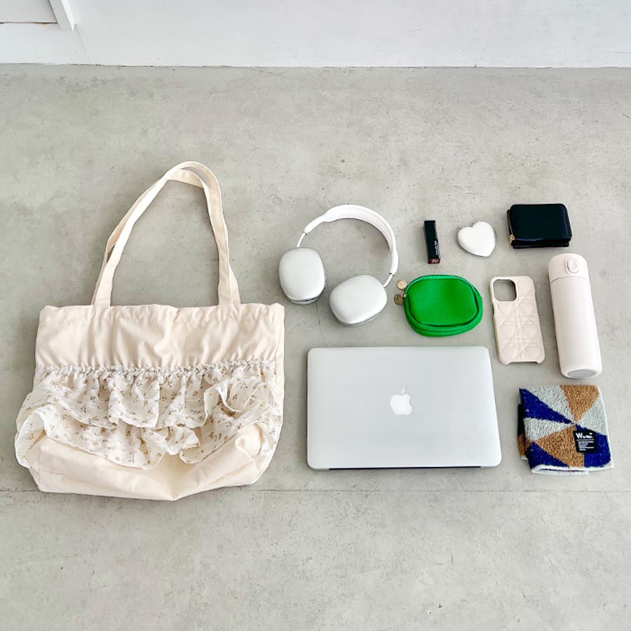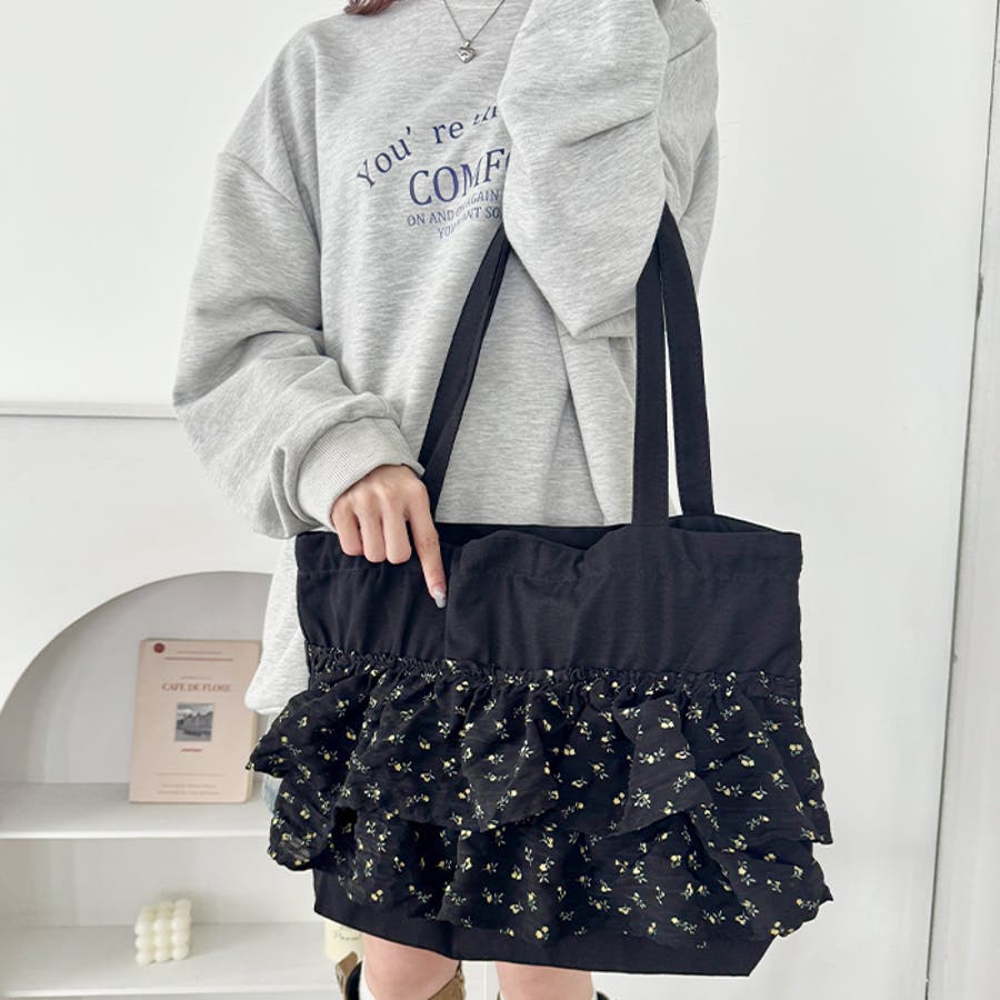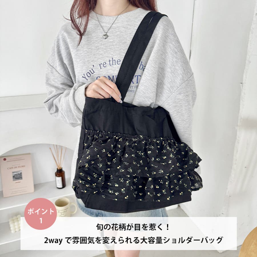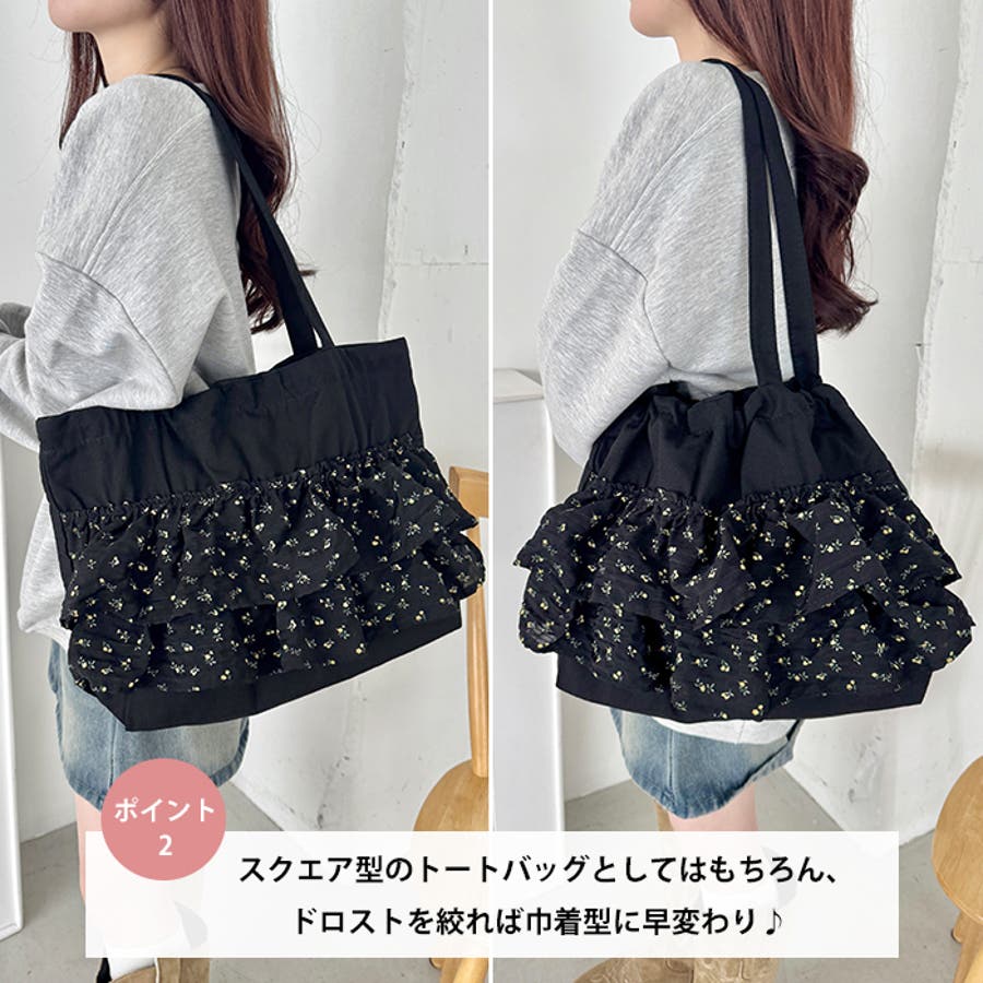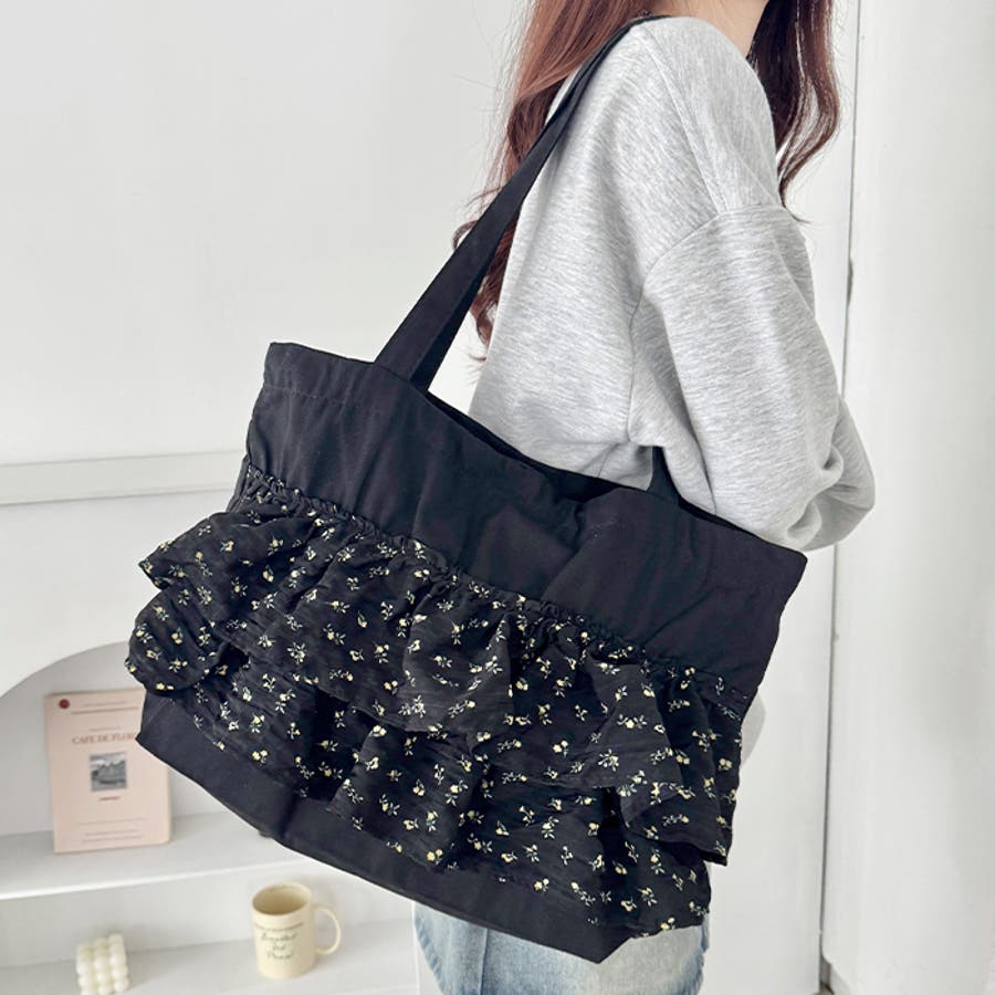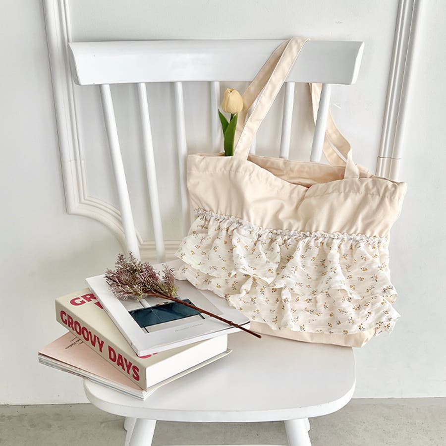 ・フラワー柄のフリルがドッキングされたキャンバスバッグ