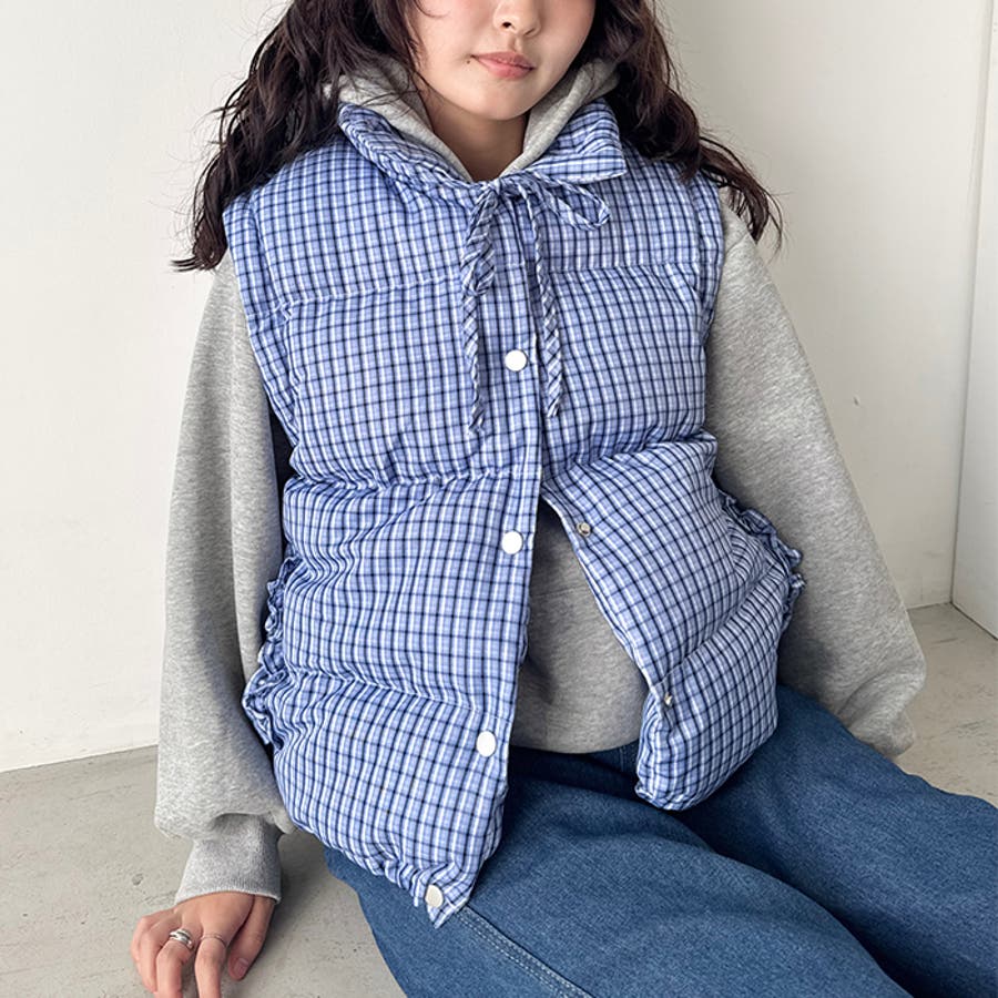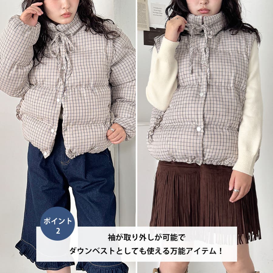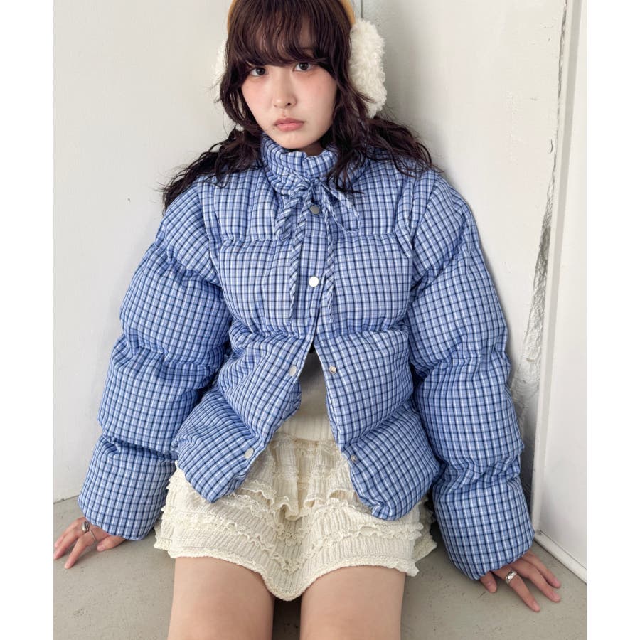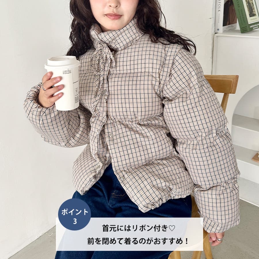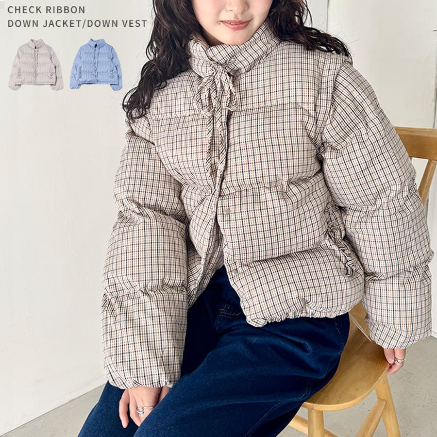 【袖取り外し可能】チェックリボンダウンジャケット/ダウンベスト