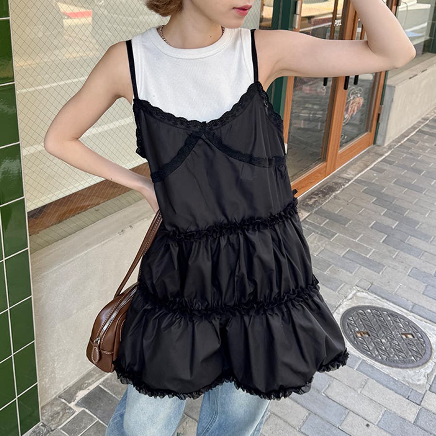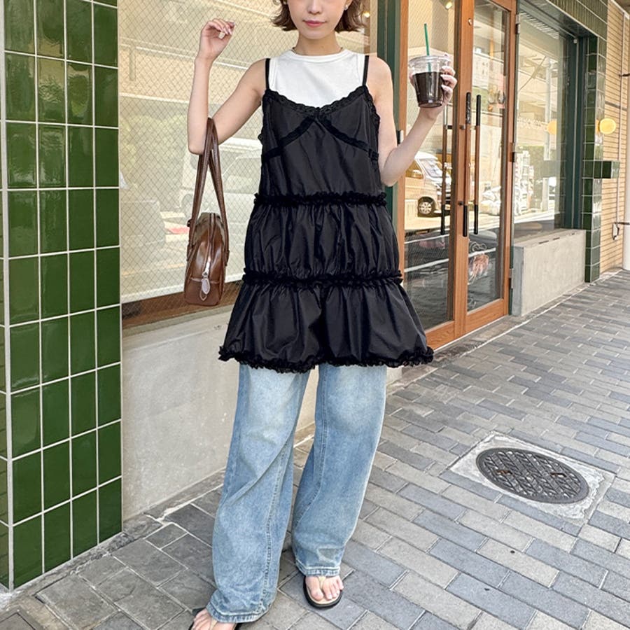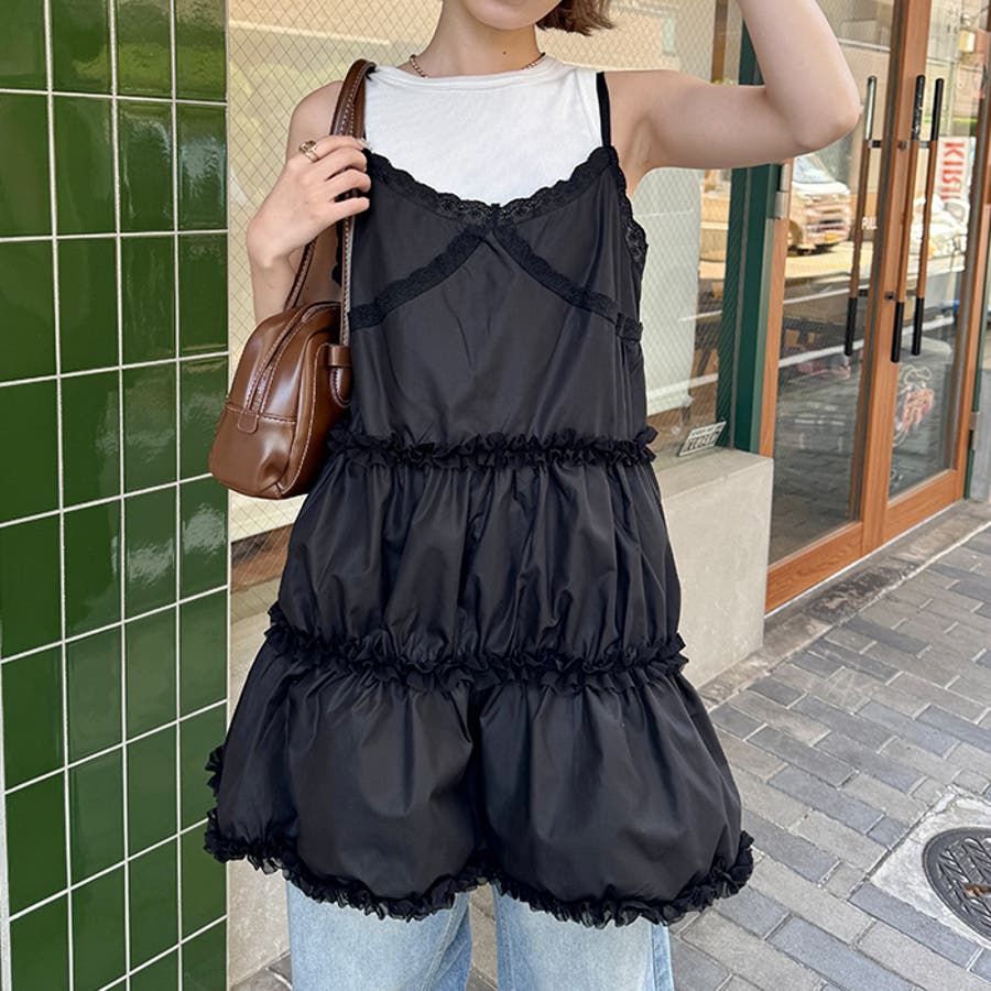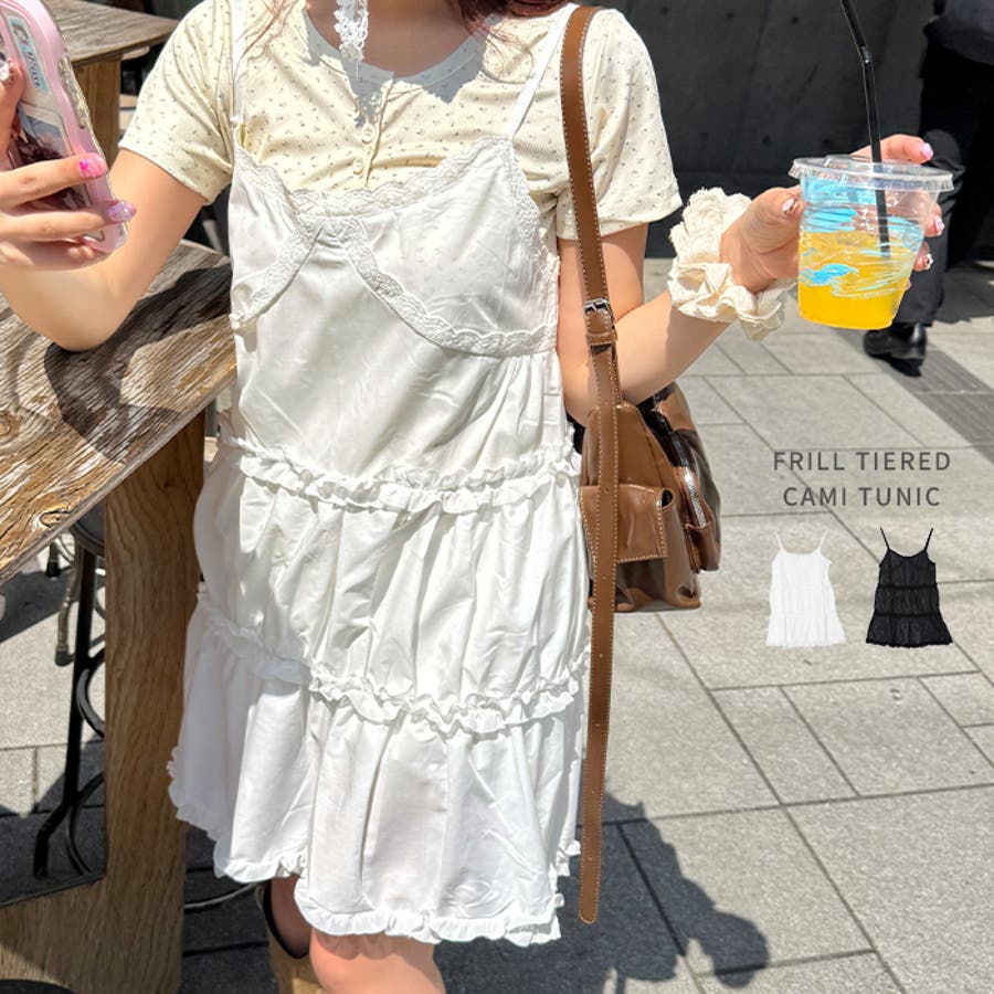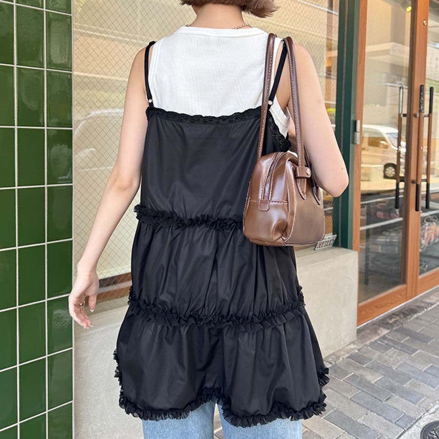 ・ビスチェ風の胸元の切り替えデザインとフリルが目を惹くキャミソール型のチュニックトップス