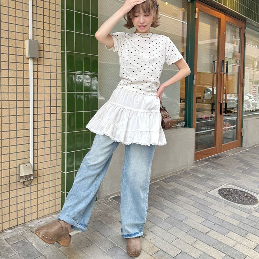 すっきりとしたトップスをインしたりショート丈トップスで肌見せしても可愛い♡